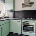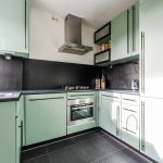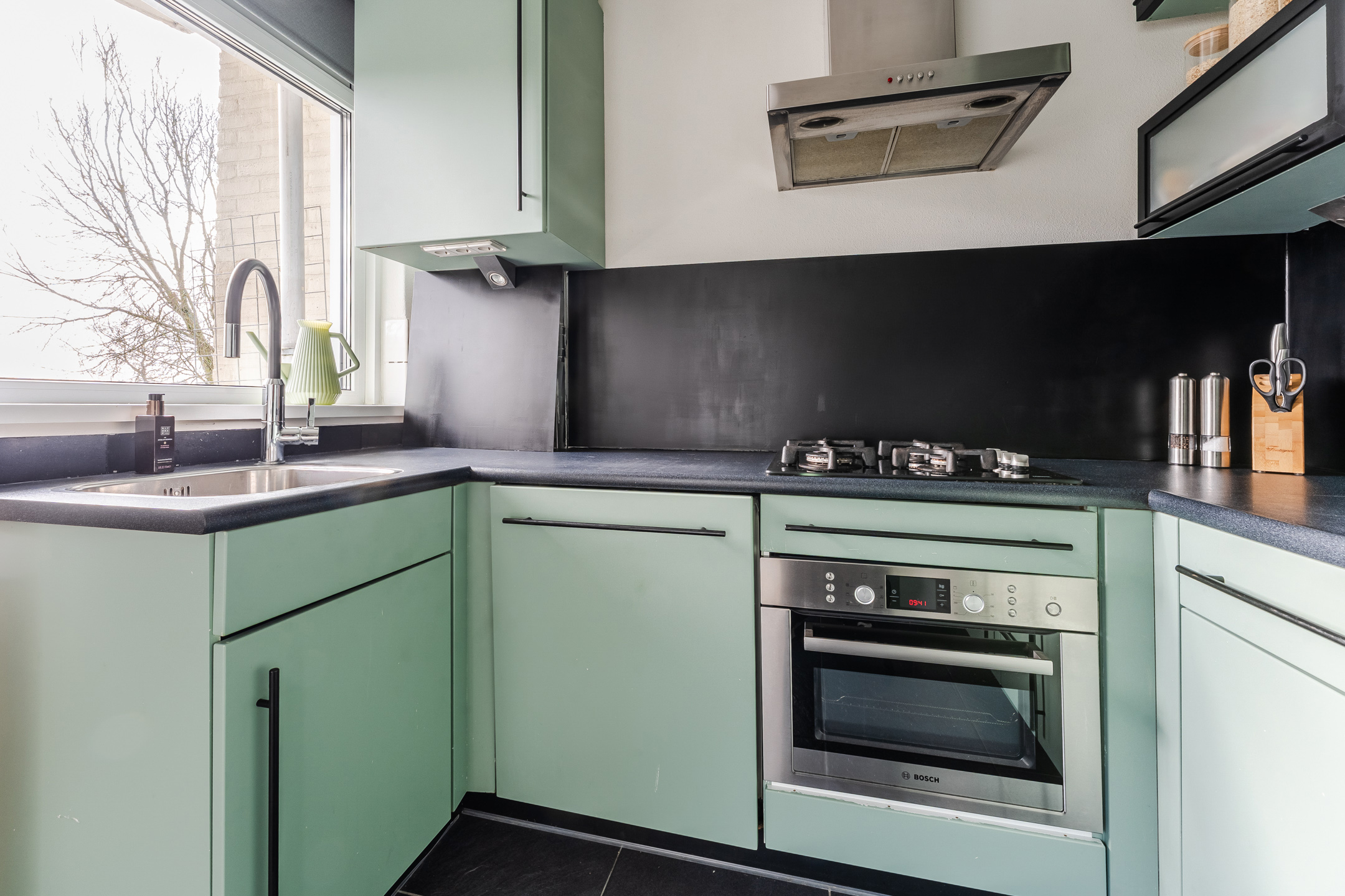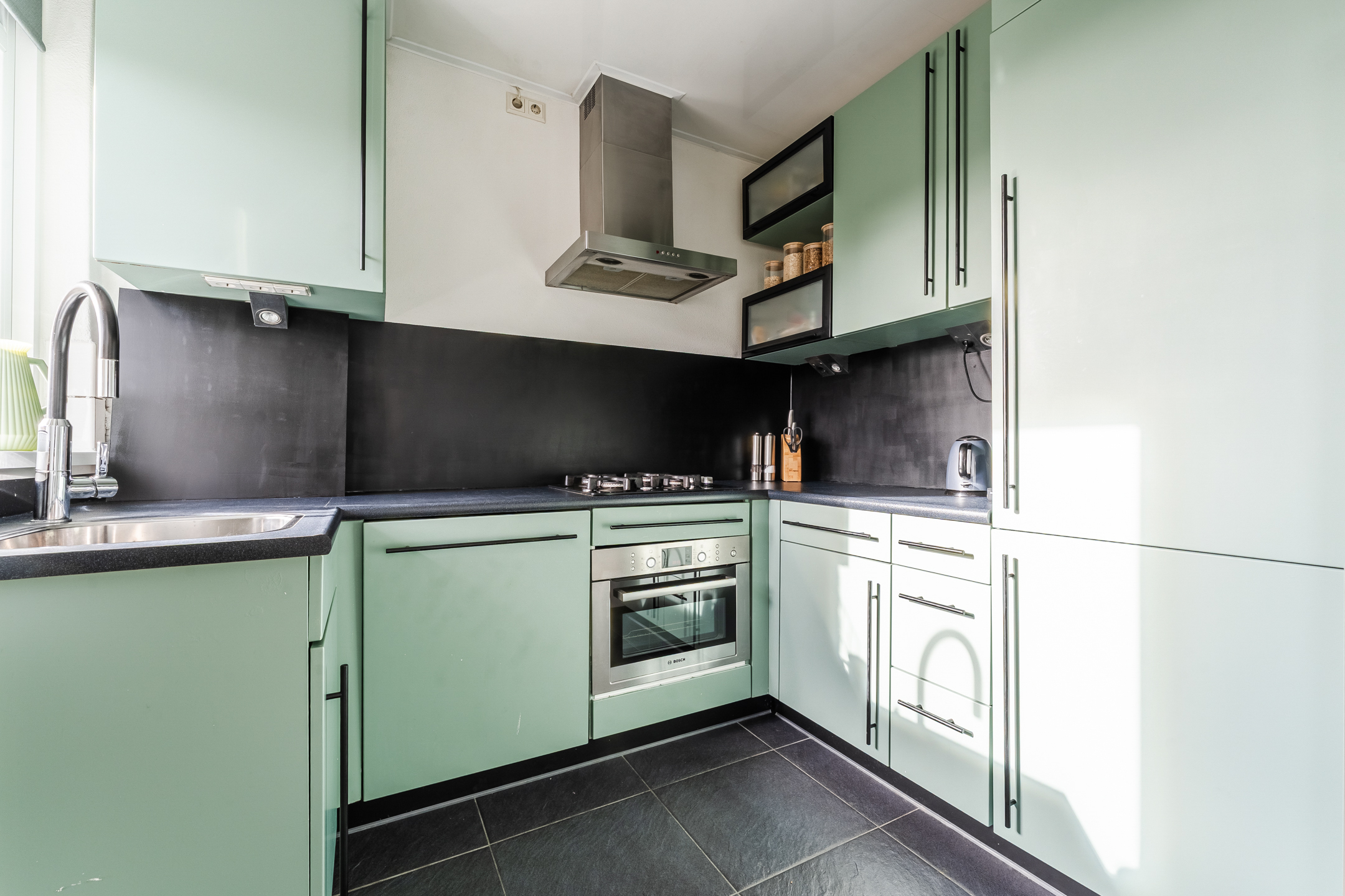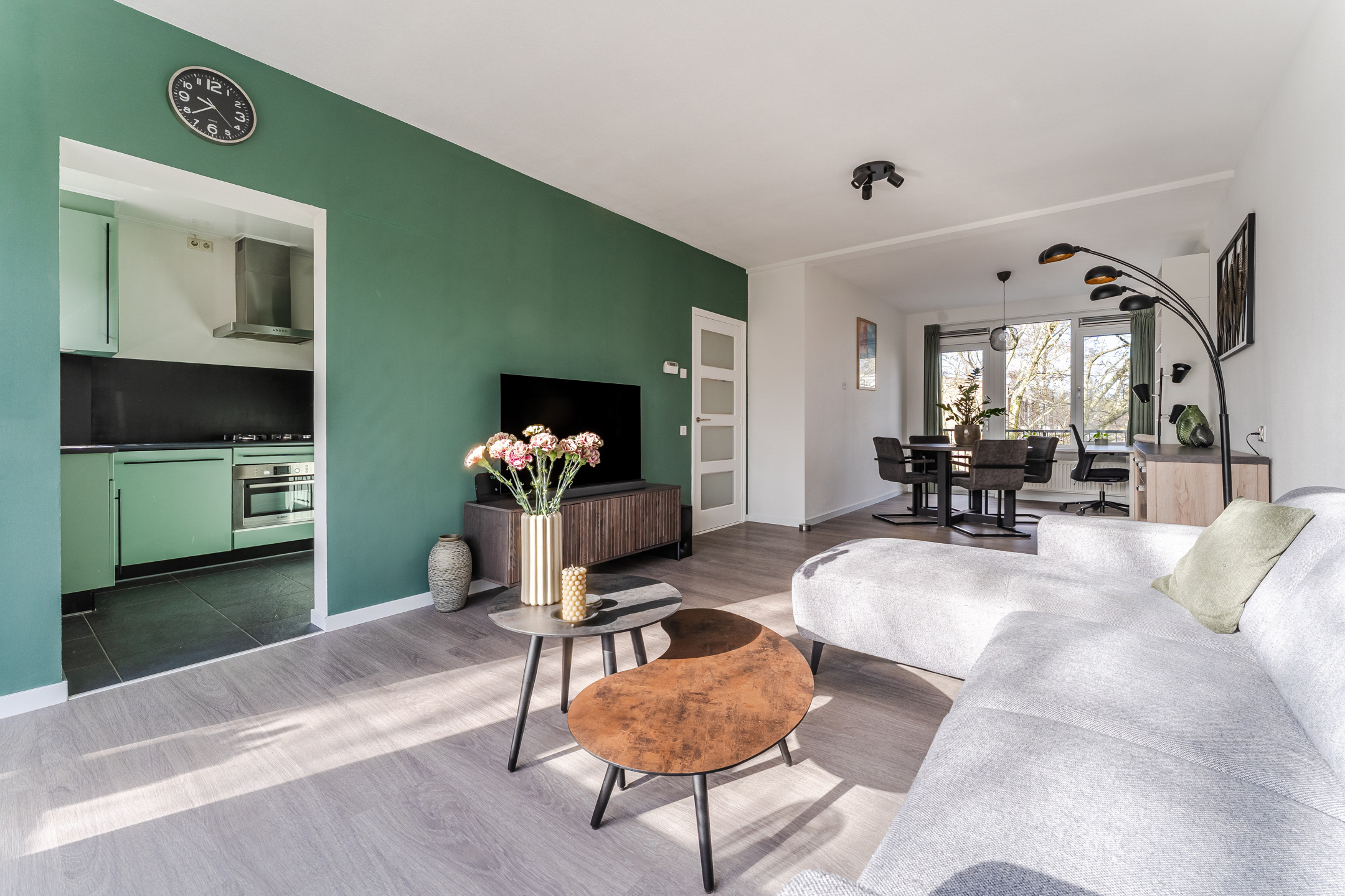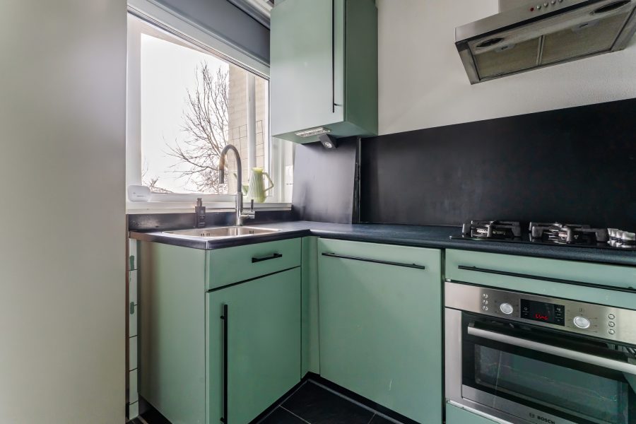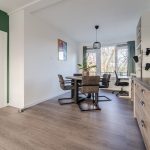 De royale doorzonwoonkamer is voorzien van een fraaie vloer en keurig afgewerkte wanden. Hier is volop ruimte voor een comfortabele zit- en eethoek. Dankzij de brede raampartij aan zowel de voor- als achterzijde valt er veel natuurlijk licht naar binnen. In de halfopen keuken ligt een zwarte tegelvloer met vloerverwarming. De keuken zelf is uitgevoerd in een U-opstelling en heeft groene keukenkastjes en een donker werkblad. Hier tref je een vaatwasser, gasfornuis, afzuigkap, oven, koelkast en vriezer aan.