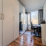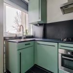 The spacious living room, which extends from front to back, features beautiful flooring and neatly finished walls. There is plenty of room here for a comfortable sitting and dining area. Thanks to the wide window at both the front and back, plenty of natural light floods in. The semi-open kitchen features a black tile floor with floorheating. The kitchen itself is arranged in an U-shape and has green cabinets and a dark countertop. Here you will find a dishwasher, gas stove, range hood, oven, refrigerator and freezer.