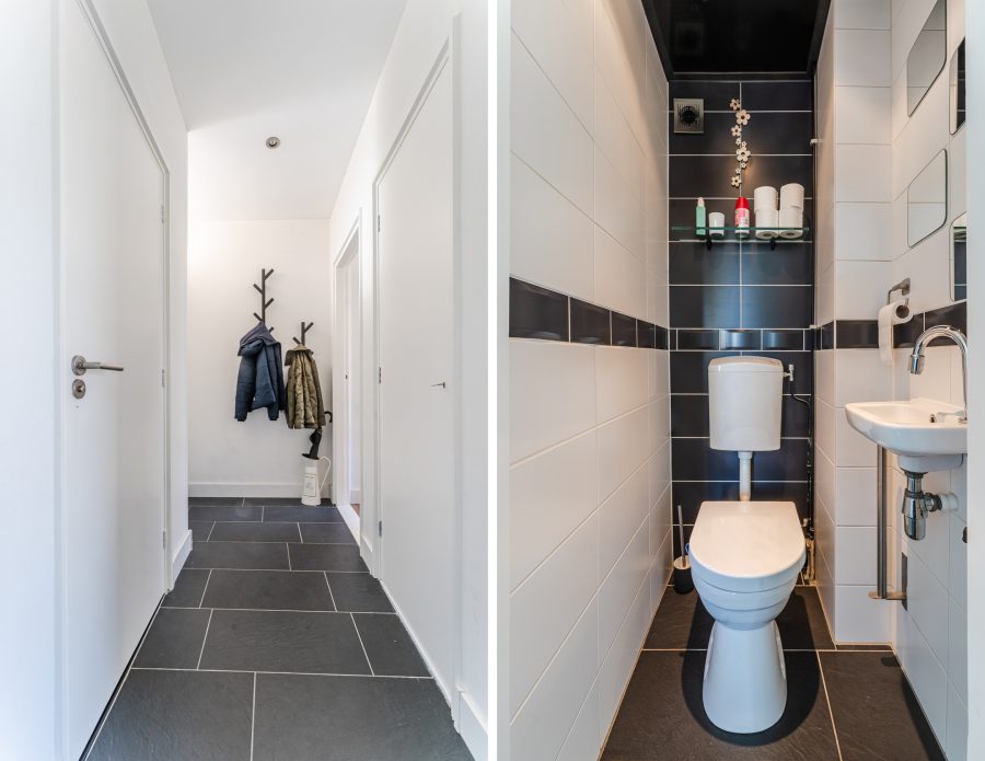 Na binnenkomst in het appartement word je verwelkomd door een ruime entreehal, die keurig is afgewerkt met donkere vloertegels en wordt verlicht met inbouwspots. Vanuit hier heb je toegang tot meerdere vertrekken.