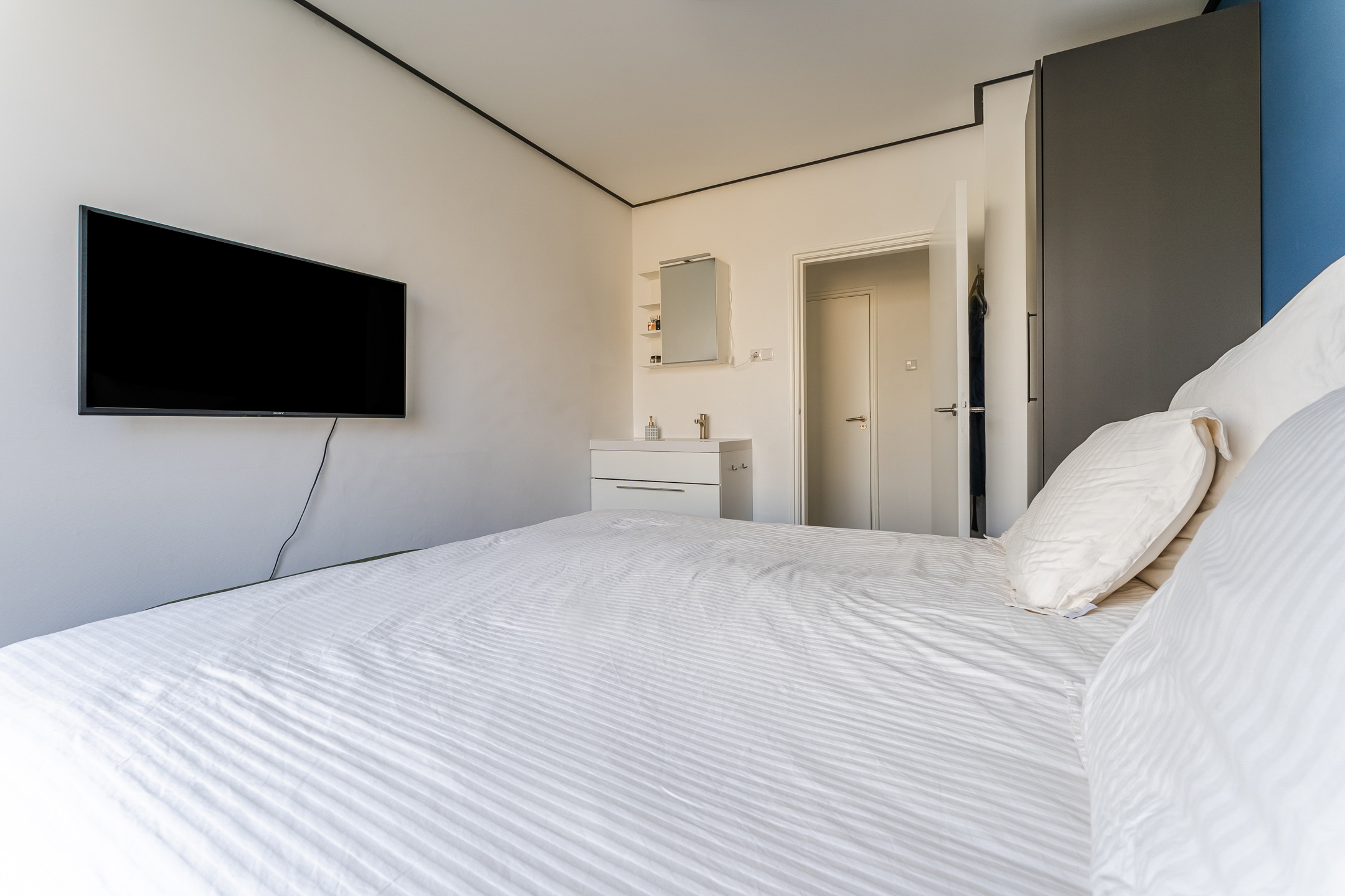 There are two bedrooms. Both rooms are spacious, nicely finished and wonderfully bright. One of the two bedrooms is equipped with its own sink. The bathroom is finished with black and white tiles and equipped with a shower. There is also a separate toilet.