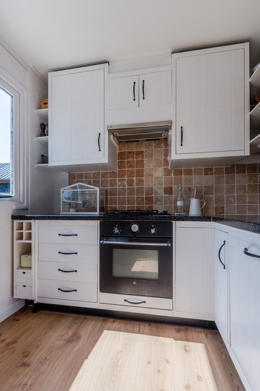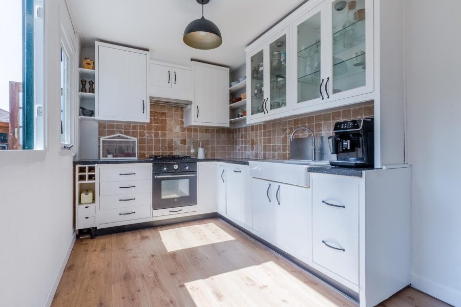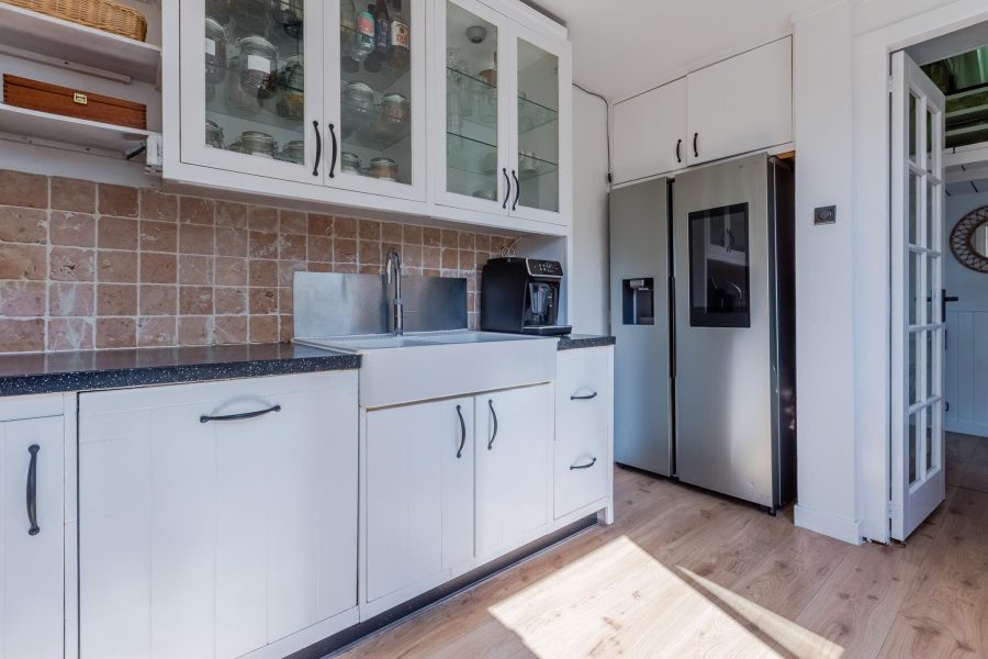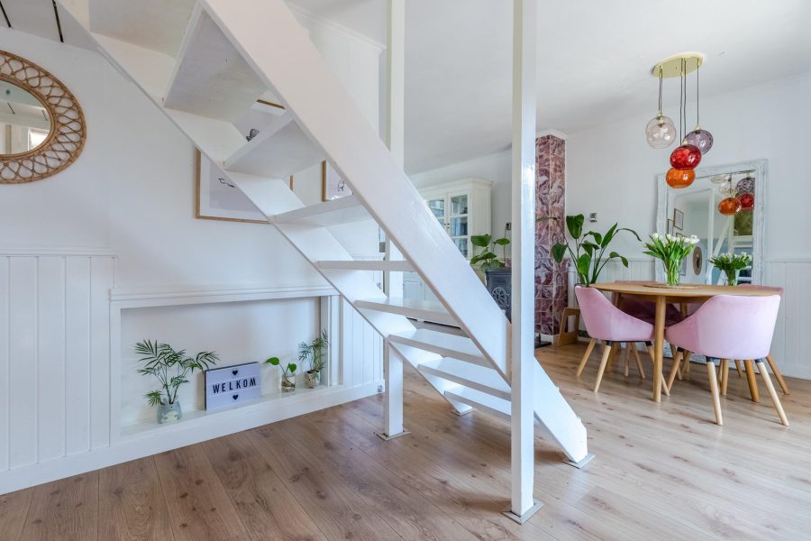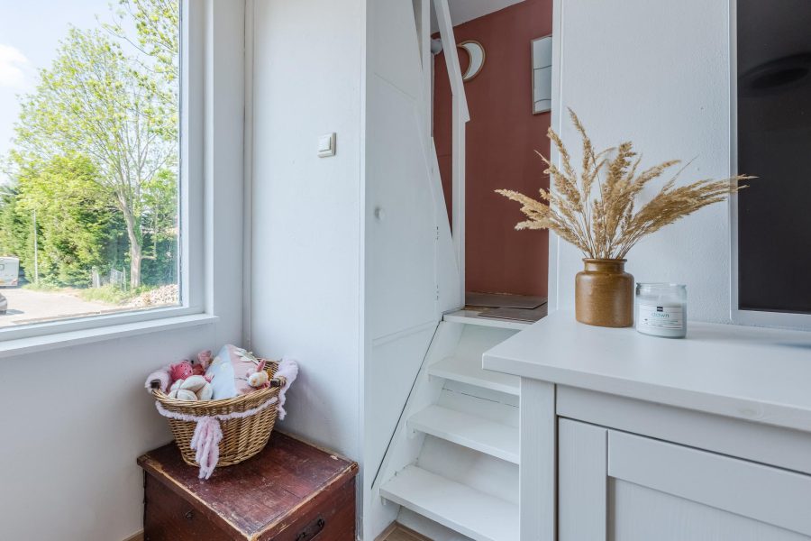 Through the paved side garden we reach the front door of the house. Entrance with cloakroom, floating toilet with hand basin and open access to the living room. The cosy living room has windows at the front and side wall and at the rear you will find French doors to the garden. The living room contains the meter closet and a fireplace with gas fire. The open staircase is also in the living room. At the front there is room for a sitting area and at the back, near the kitchen, there is room for a dining table. The kitchen is attached. The L-shaped kitchen has white fronts and is equipped with built-in and separate appliances. The kitchen also has 2 windows. Next to the kitchen (outside) is a pantry/storage room. Here you will find the connection for washer and dryer, the central heating system and more storage space. The ground floor has a nice, light wooden floor and the walls and ceilings are neatly finished.