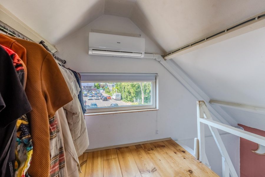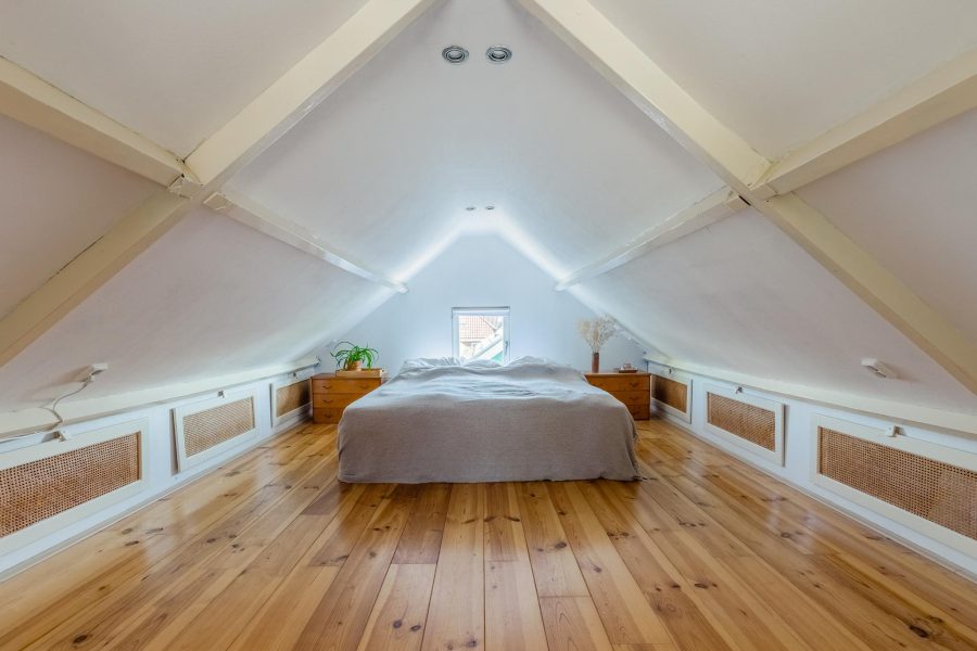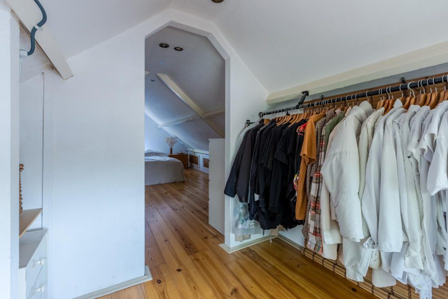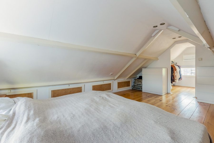 A landing with staircase leads to the second floor. Here, under the beams, a beautiful master bedroom has been created, with an open passage to a walk-in closet. There are windows in the front and back and a nice light wooden floor. There is also storage space to be found.