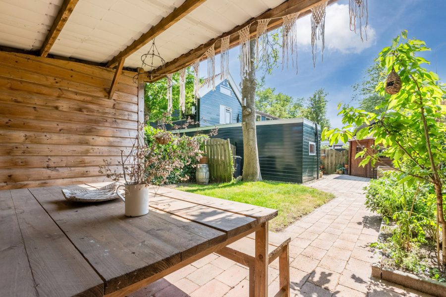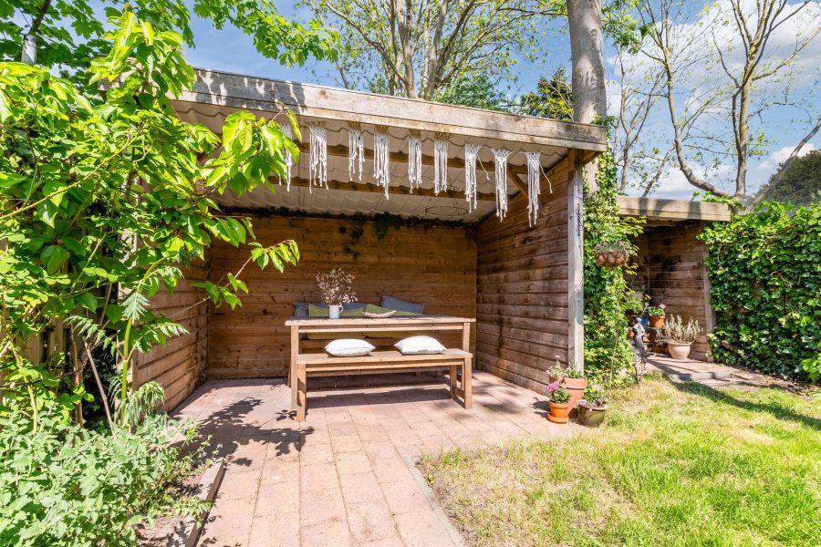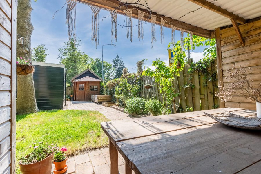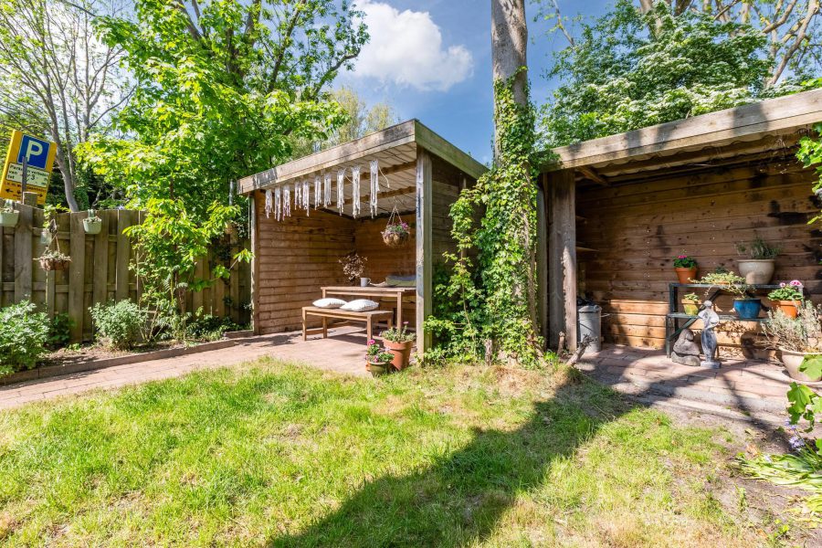 De woning heeft een heerlijke, beschutte, diepe achtertuin met twee overkappingen en een tuinhuisje. De tuin is gelegen op het westen. De tuin is deels bestraat en deels groen met een grasveldje. Een heel fijne plek om te relaxen en een fijne loungeplek te realiseren. In de zomermaanden kun je hier buiten eten en de kinderen kunnen hier veilig spelen.