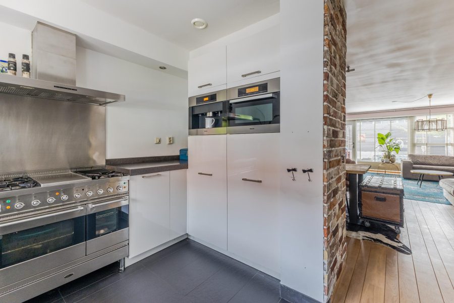 De halfopen keuken bevindt zich aan de voorzijde van het huis en is uitgevoerd met een diverse inbouwapparatuur.