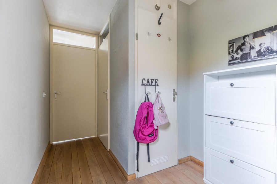 Achter de voordeur vinden we de entreehal met meterkast, gastentoilet met fonteintje en de toegang tot de royale woonkamer met halfopen keuken.
