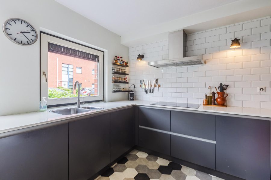 Via de deels groene, deels bestrate, ruime voortuin bereiken we de voordeur van de woning. Entree met garderobe en meterkast, staand toilet met fonteintje en toegang tot de woonkamer met open doorgang naar de keuken. De tuingerichte, lichte en diepe woonkamer heeft aan de achterzijde een schuifpui naar de tuin. Aan de voorzijde is een open doorgang naar de U-vormige keuken. De keuken (2017) heeft antracietgrijze fronten en is voorzien van diverse inbouwapparatuur (vaatwasser uit 2024). Je kookt hier elektrisch. Op de vloer liggen tegels. In de woonkamer en gang liggen houten vloerdelen in een lichte kleurstelling en de muren en plafonds zijn strak en neutraal afgewerkt. In de kamer is plaats voor een ruime zithoek en een zespersoons eettafel. De trap naar de eerste verdieping bevindt zich in de woonkamer.