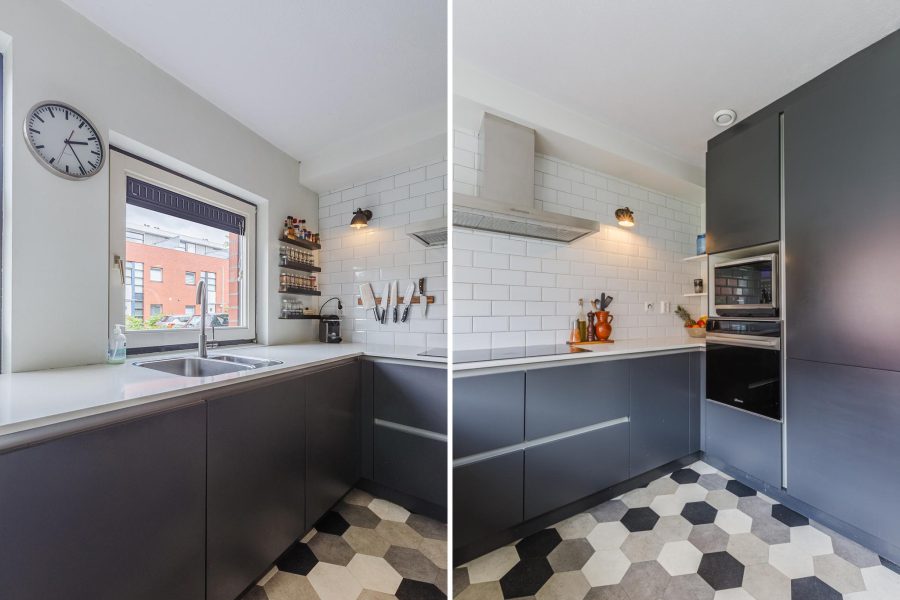 Through the partly green, partly paved, spacious front garden, we reach the front door of the house. Entrance hall with cloakroom and meter closet, standing toilet with washbasin and access to the living room with open passage to the kitchen. The garden-oriented, light and deep living room has sliding doors to the garden at the rear. At the front is an open passage to the U-shaped kitchen. The kitchen (2017) has anthracite grey fronts and is equipped with various built-in appliances (dishwasher from 2024). You cook here electrically. The floor is tiled. The living room and hallway have light-coloured wooden floorboards and the walls and ceilings have a sleek and neutral finish. The room has space for a spacious sitting area and a six-person dining table. The stairs to the first floor are located in the living room.