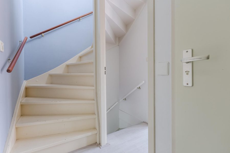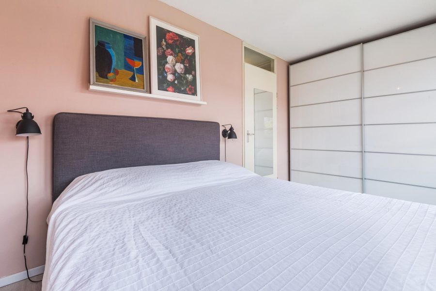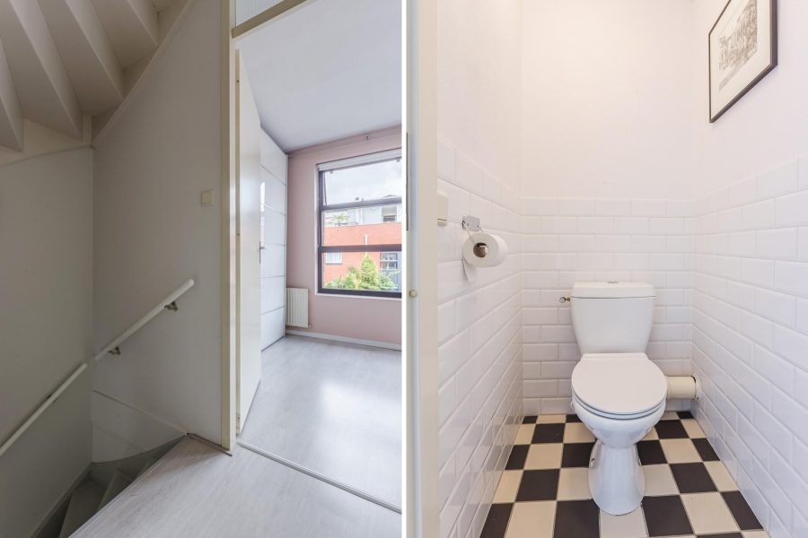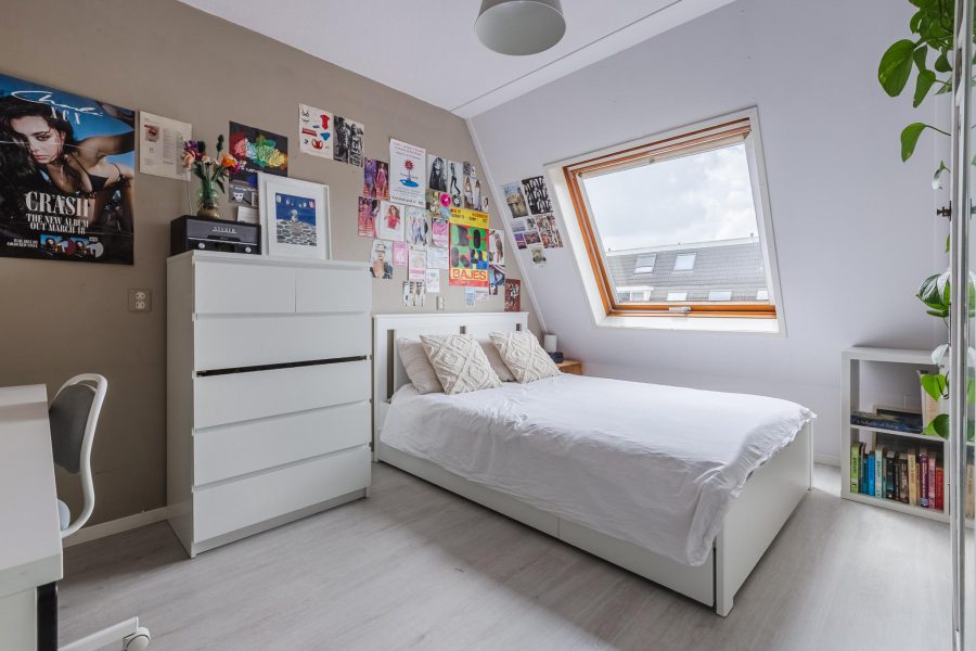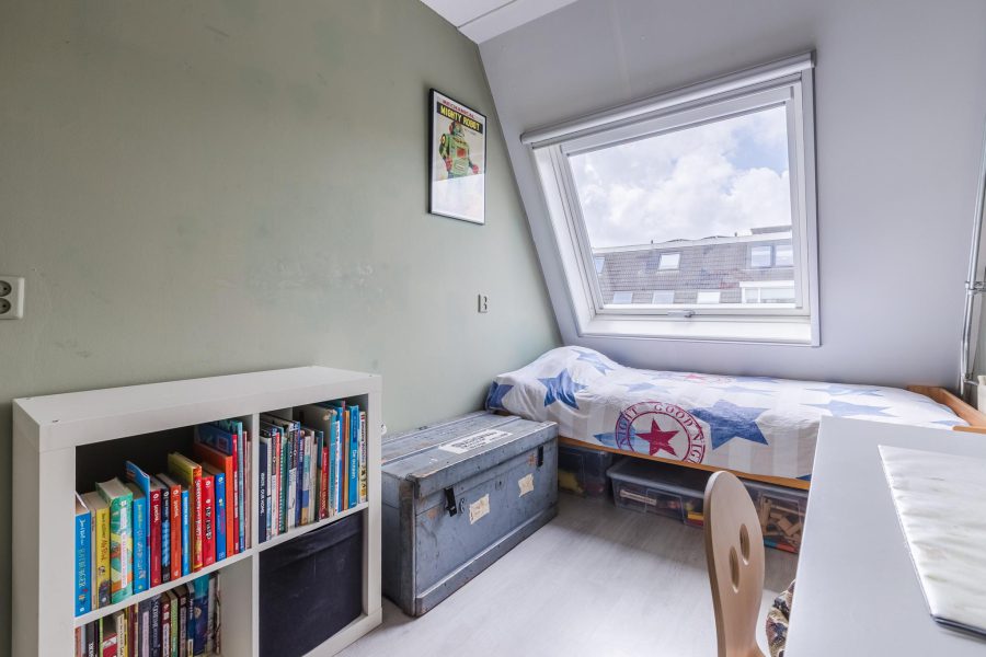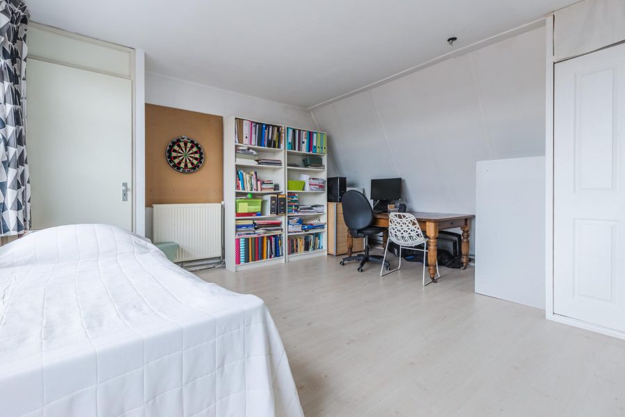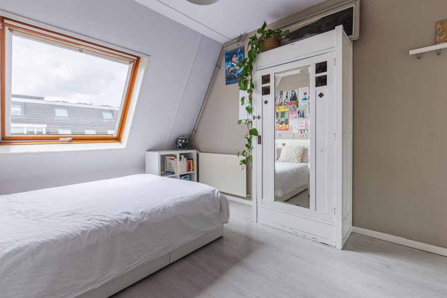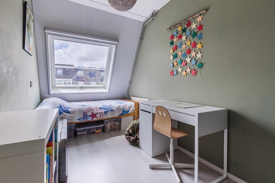 The stairs in the living room lead to the landing on this floor. Here you will find three nice bedrooms, a separate toilet and the bathroom. The largest bedroom is at the front and has a tall glass window and two smaller windows. There is room for a double bed and a spacious wardrobe. The two other bedrooms are at the rear. These spacious bedrooms receive daylight through a Velux skylight. These bedrooms are also neatly finished. In the bathroom, you will find a vanity unit with washbasin and mirror and a bathtub with shower function.