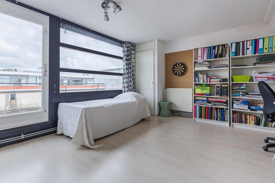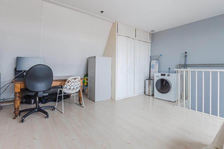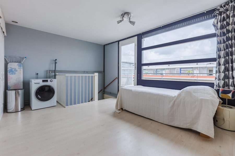 Via een vaste trap bereiken we de multifunctionele zolderverdieping. Hier is ruimte om te slapen, te werken of een hobby uit te oefenen. Je treft hier ook nog bergruimte aan en de aansluiting voor het witgoed. Deze lichte zolderkamer heeft een breed raam en een toegangsdeur tot een ruim zonneterras met vrij uitzicht over de omgeving. Hier kun je een heerlijke loungeplek realiseren.