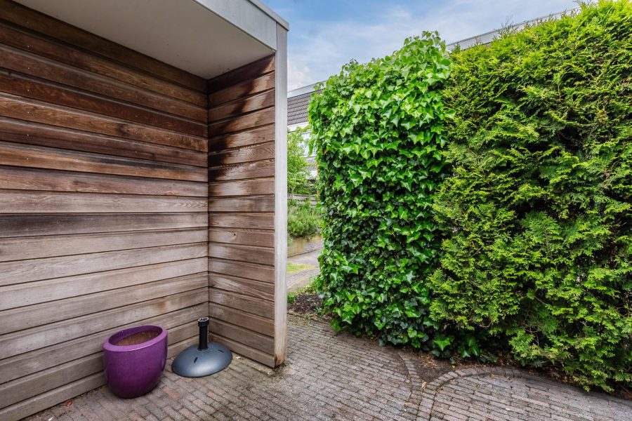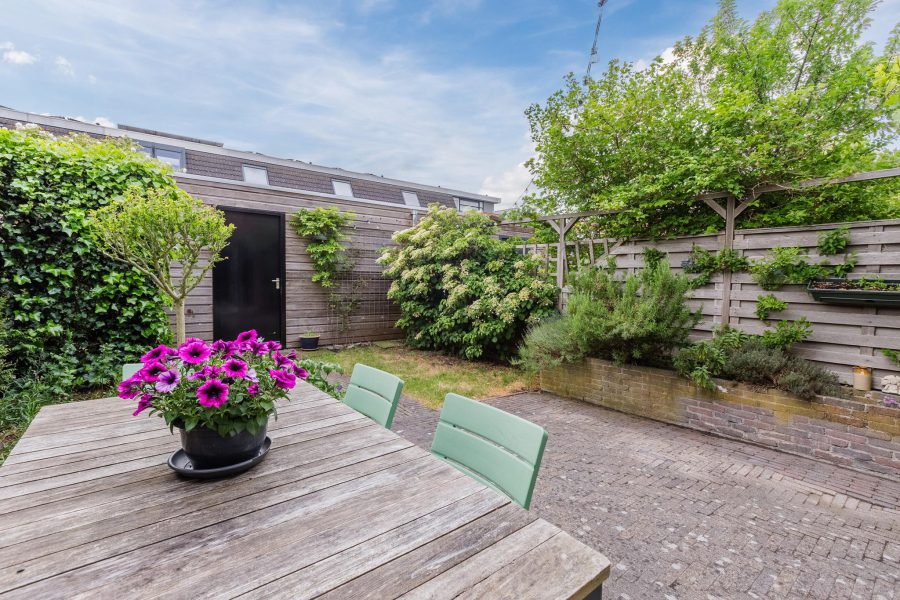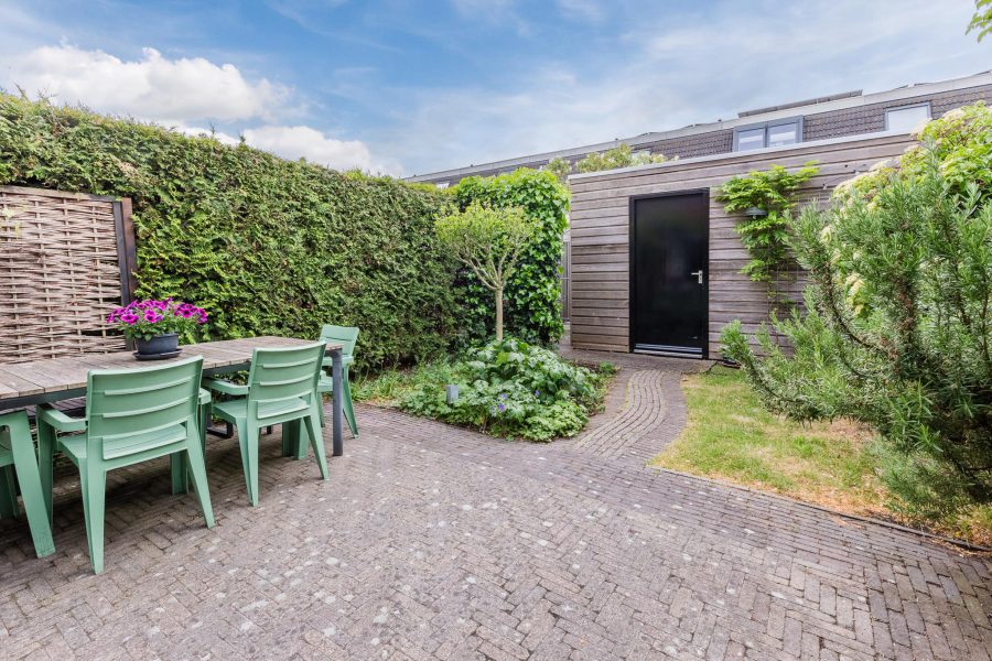 De woning heeft een deels groene en deels bestrate voortuin en een beschutte, grotendeels groene achtertuin. Aan de woning vast tref je een bestraat terras aan waar je een loungeplek kunt realiseren en/of een ruime eettafel buiten kunt plaatsen om gezellig buiten te eten in de zomermaanden. Achterin de tuin staat een houten berging met elektra en er is een achterom.