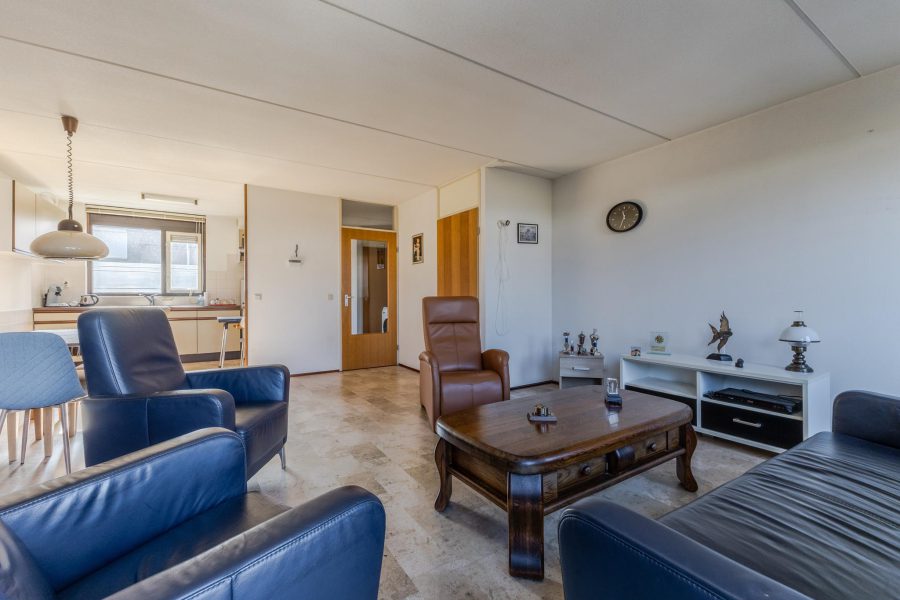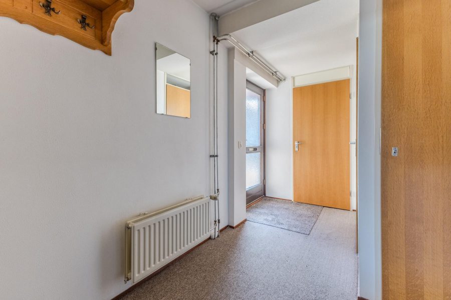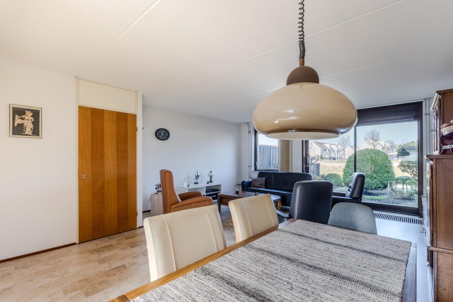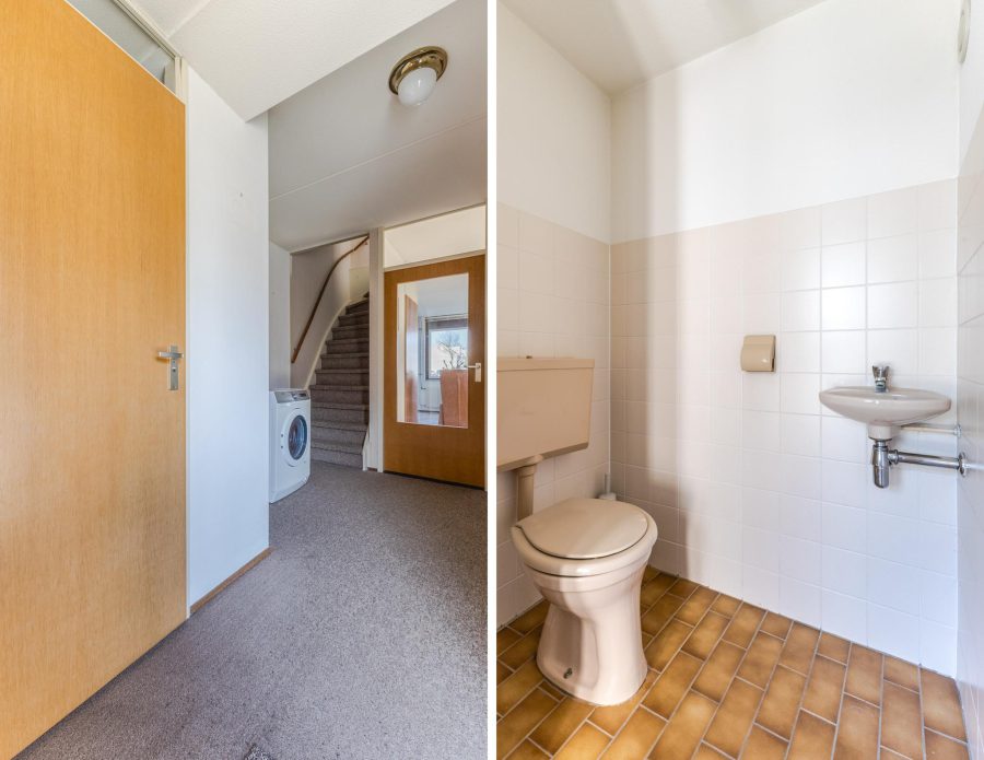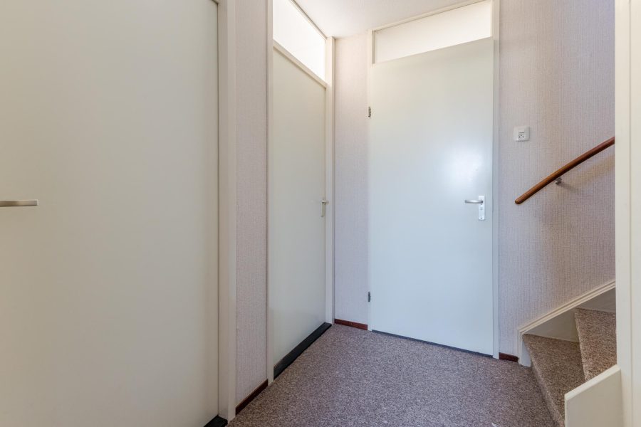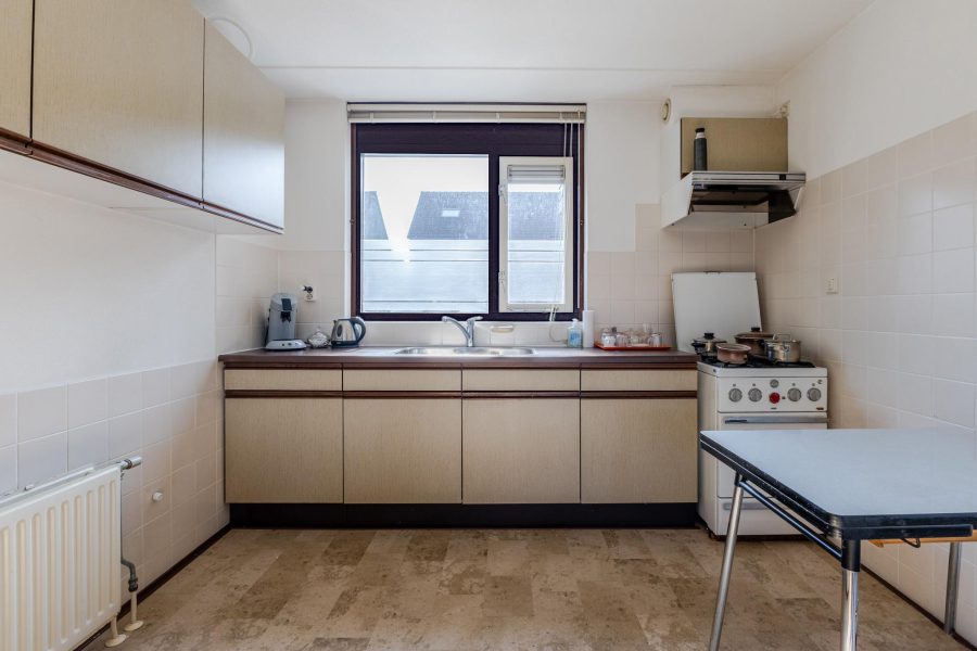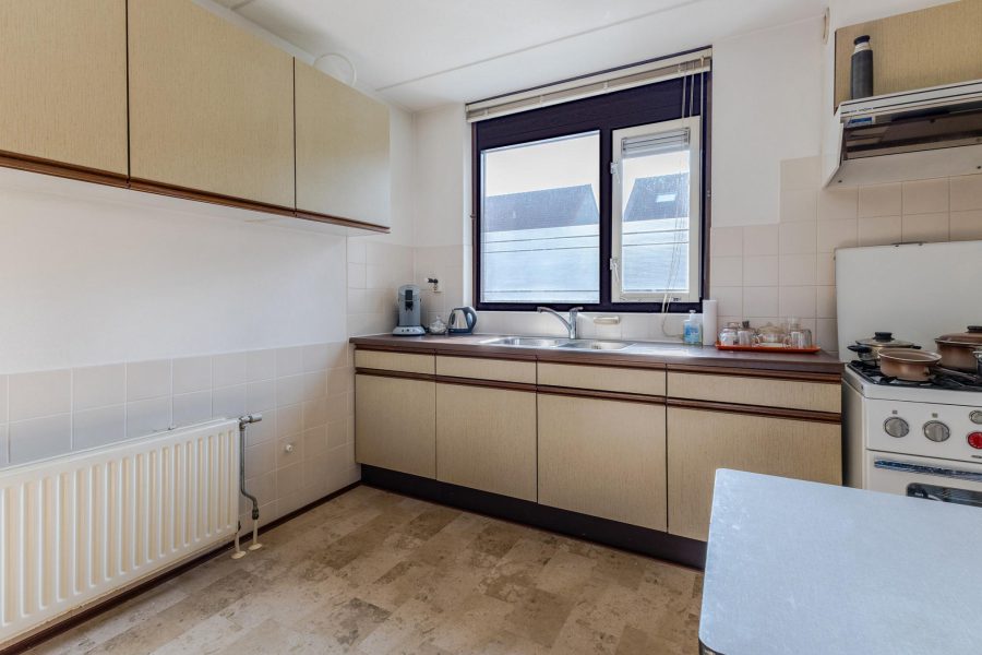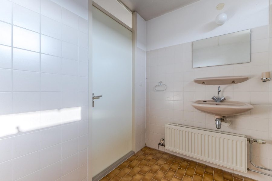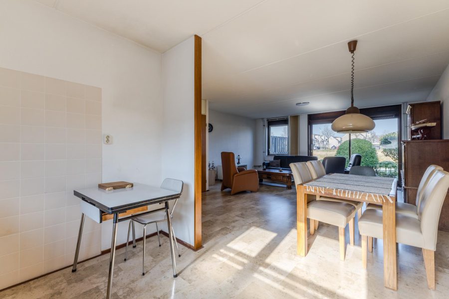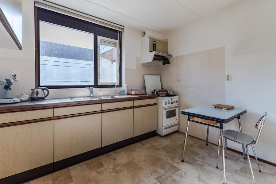 We put the car in front of the house and reach the entrance to the house via the front door or via the (bicycle) storage room. Entrance with wardrobe and meter closet, standing toilet with hand basin, connection for washer and dryer, staircase to the first floor and access to the living room with open kitchen. The rooms are dated, have a nice layout and can be modernized to your own taste. The spacious living room has a window at the rear and a sliding door to the garden. The straight kitchen is located at the front. The ceilings and walls are finished to a high standard. There are tiles on the floor.