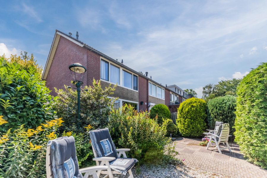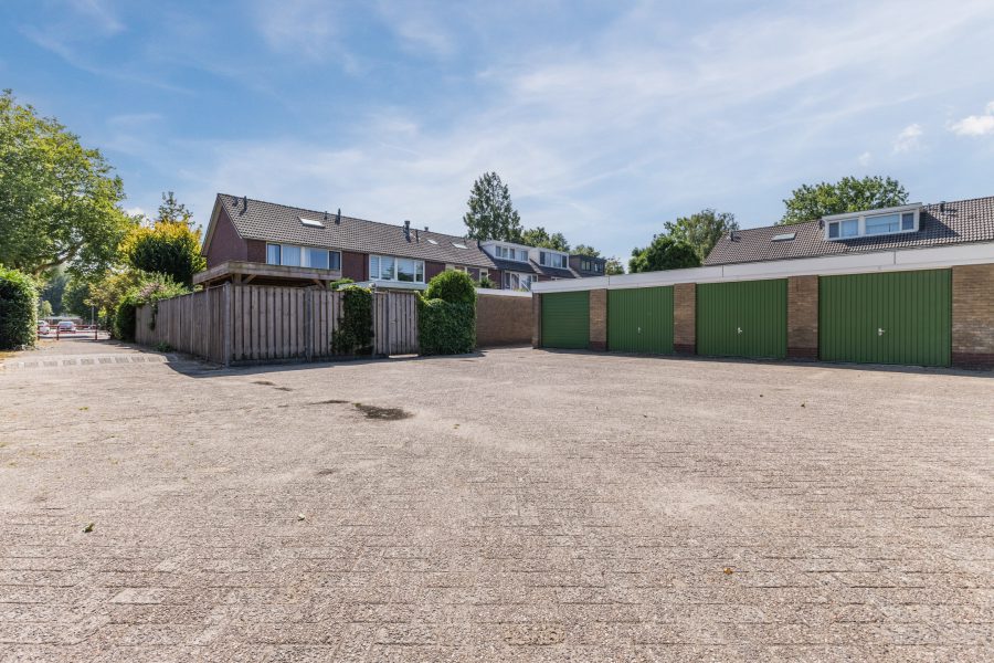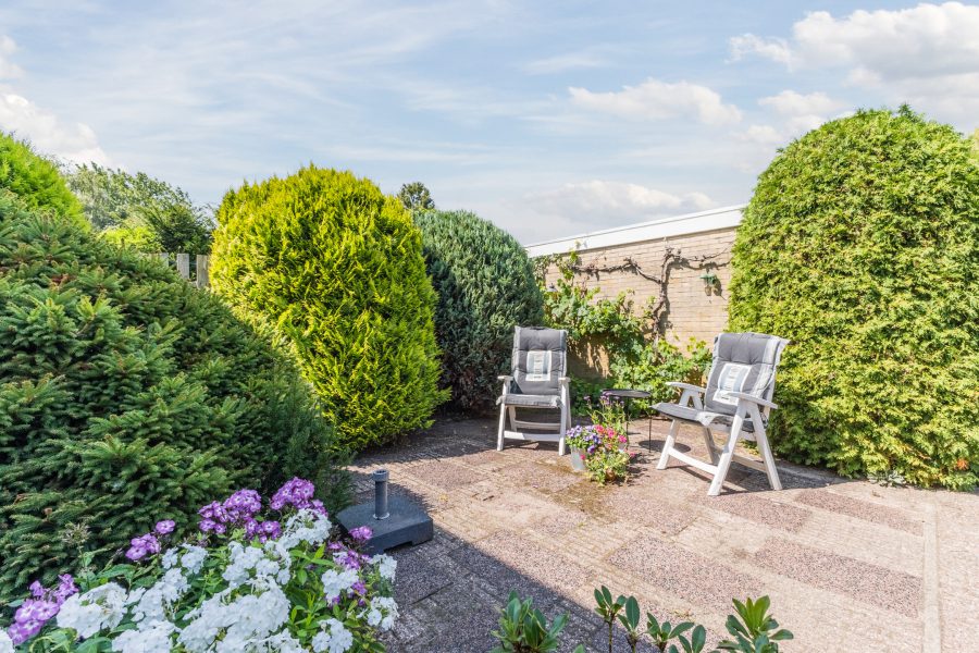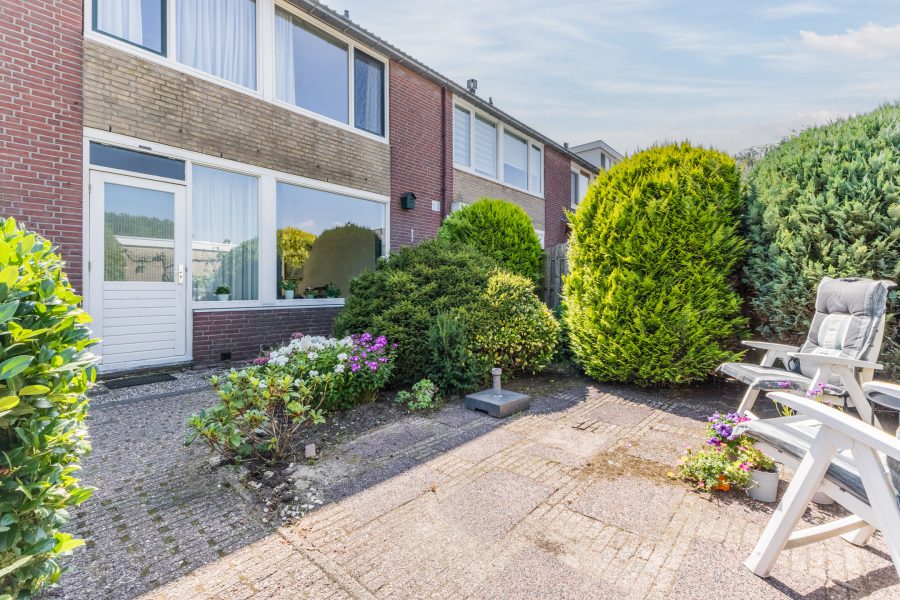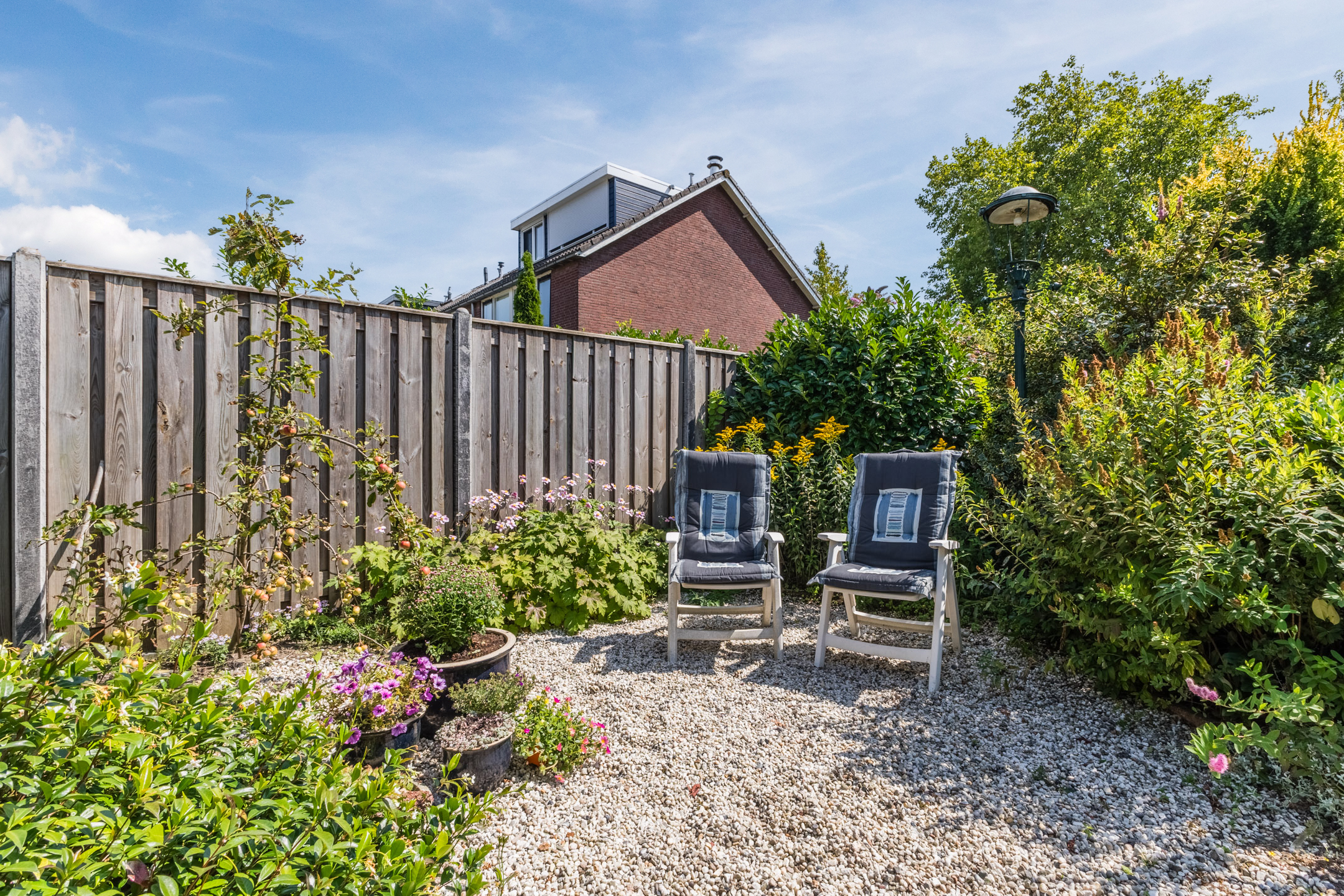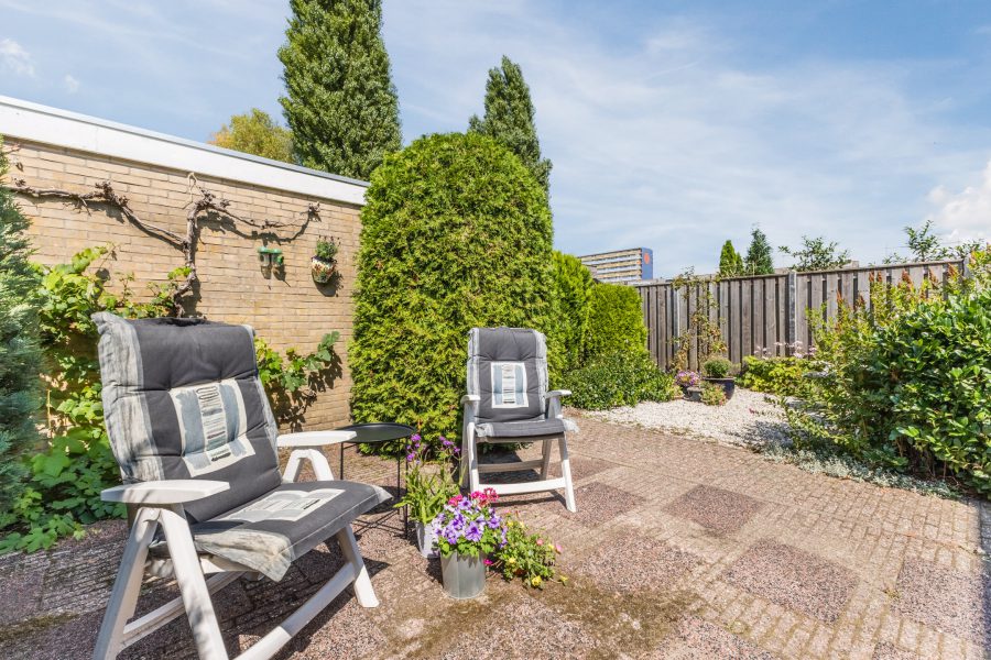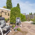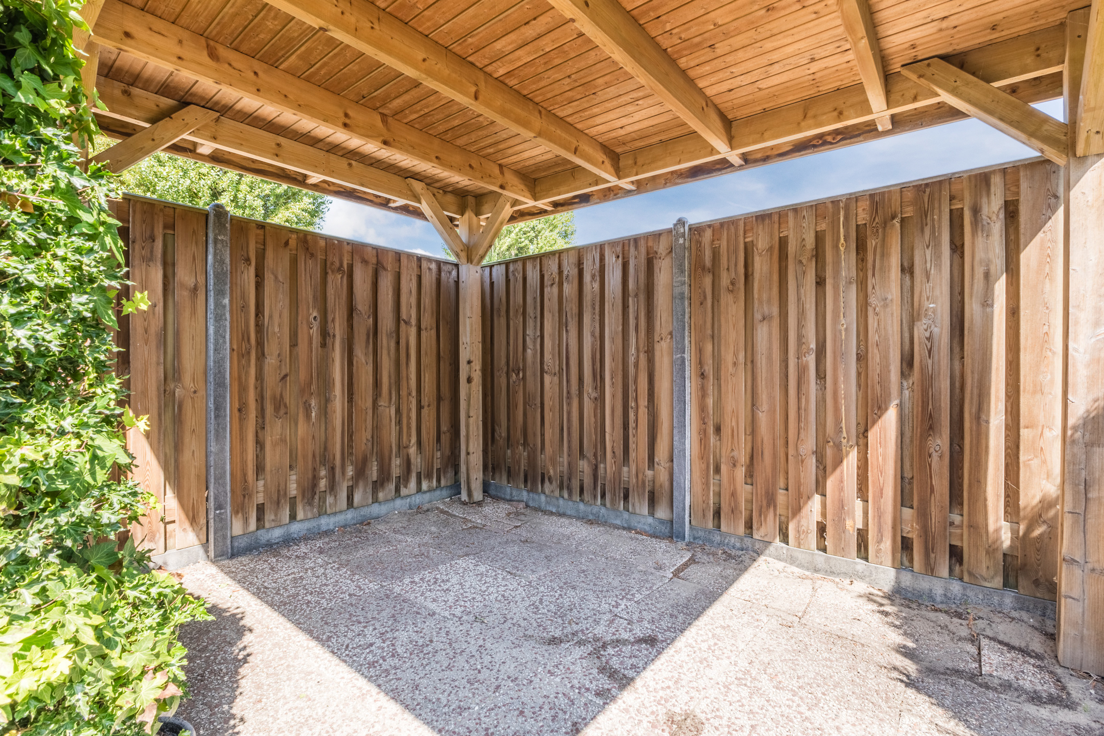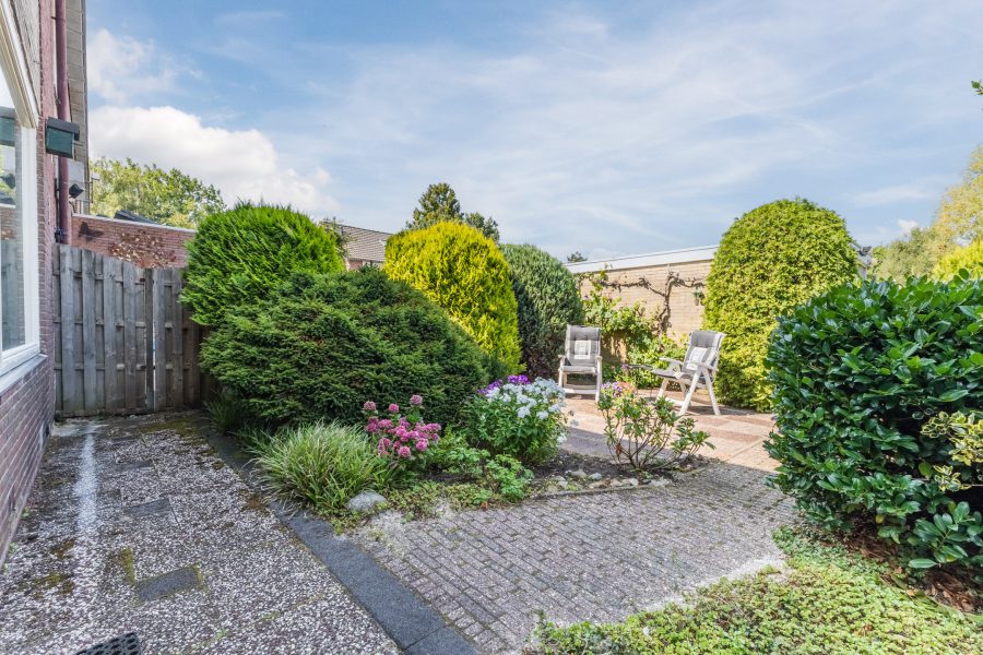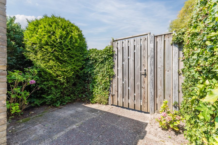 De woning beschikt over een diepe en sfeervol aangelegde achtertuin, met een combinatie van groen, tegels en siergrind. Dankzij de beschutte ligging kun je hier in alle rust genieten van de zon. Achterin de tuin staat een royale houten overkapping, perfect voor een gezellige loungehoek of buitendiner. Daarnaast is er een grote berging voor fietsen en tuingereedschap en een achterom voor extra gemak.
