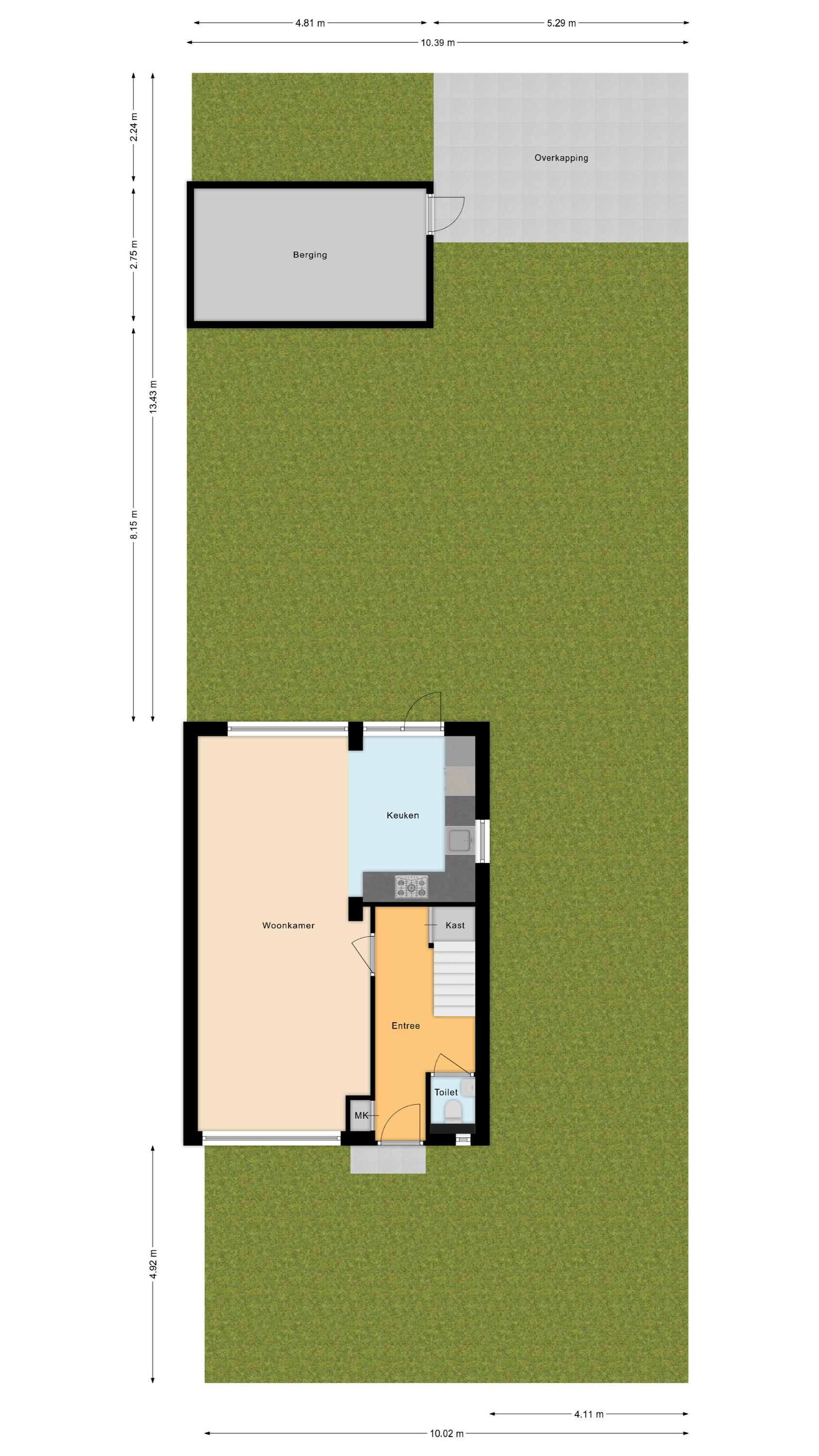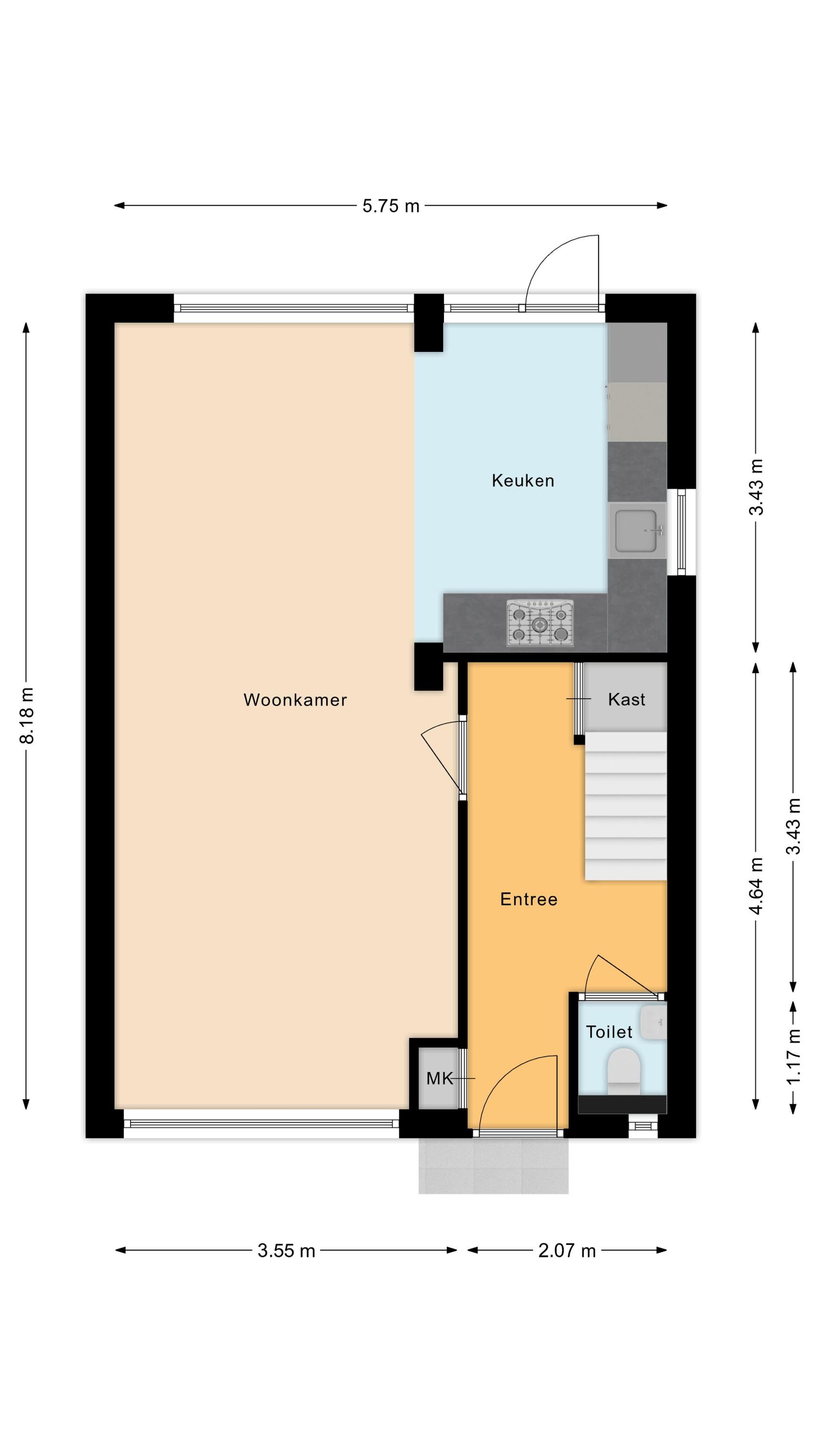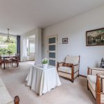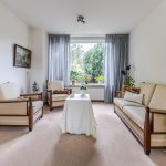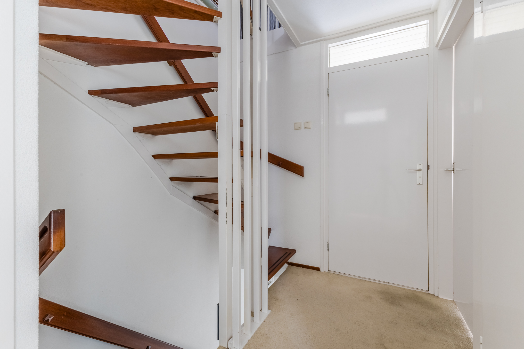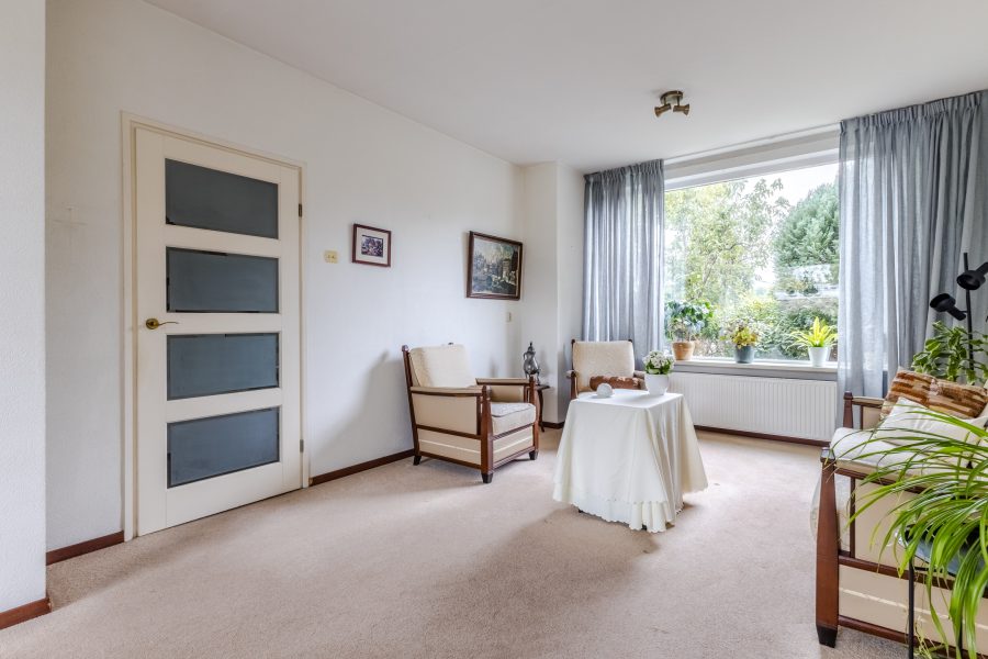 Through the green front garden you reach the covered front door of this fine corner house. Inside, you are welcomed in a spacious entrance hall with access to the meter cupboard, a modern toilet with sink, the staircase, a convenient storage cupboard and of course the living room.