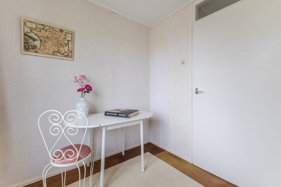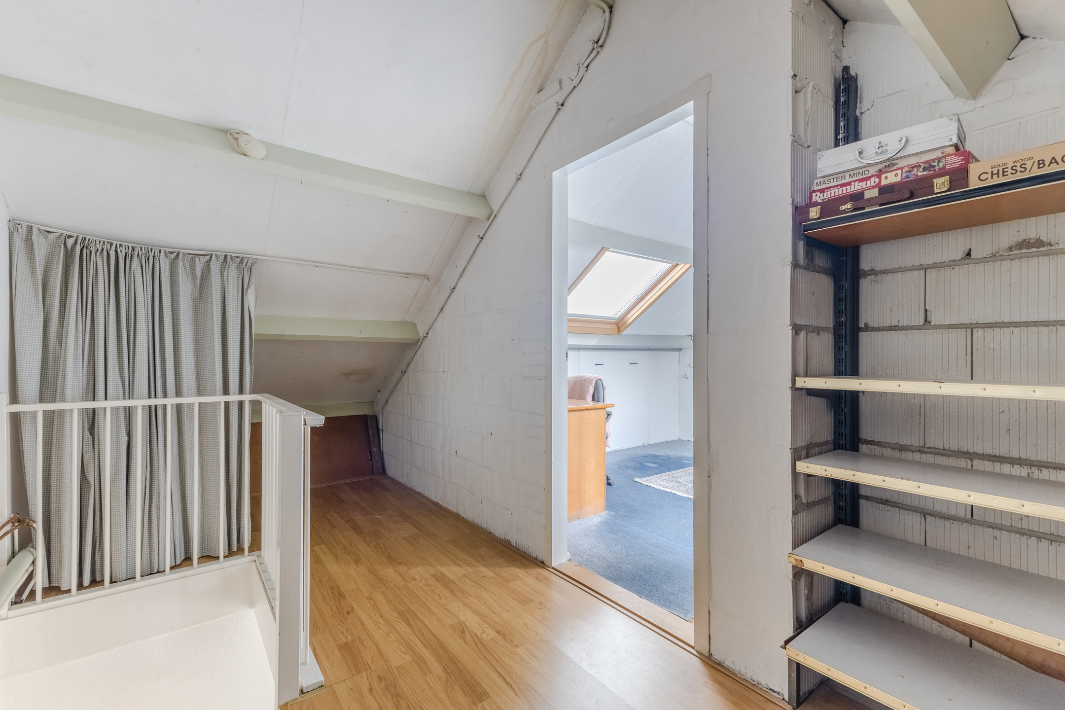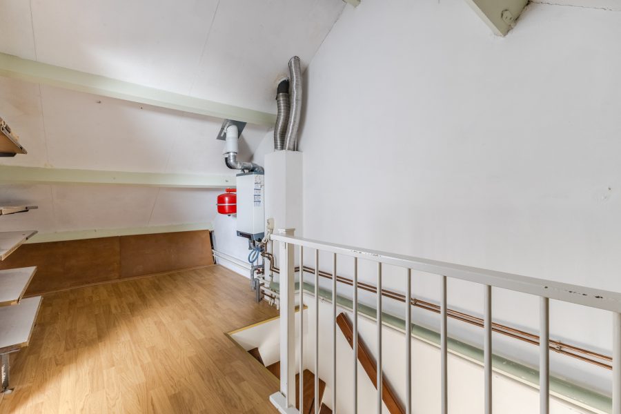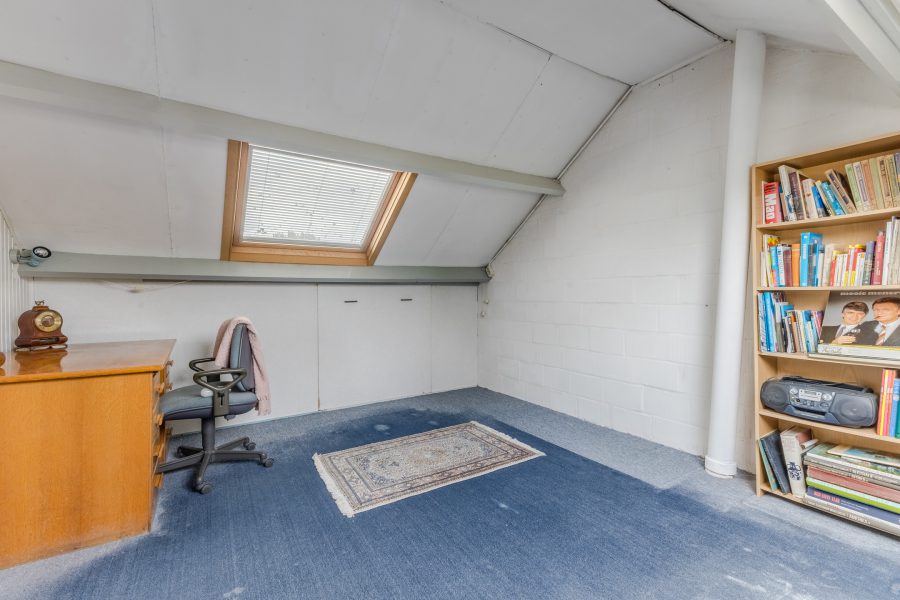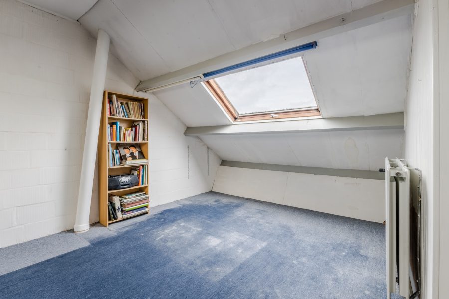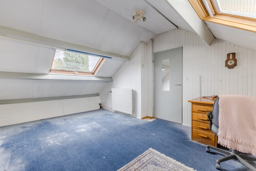 A fixed staircase leads to the second floor. Here you’ll find a spacious landing with the central heating system and storage space, plus the fourth bedroom. This room is large in size and has two skylights providing pleasant natural light. By adding a large dormer window at the back, you could create a true dream bedroom. Additional storage space is also available – ideal for suitcases or seasonal items.