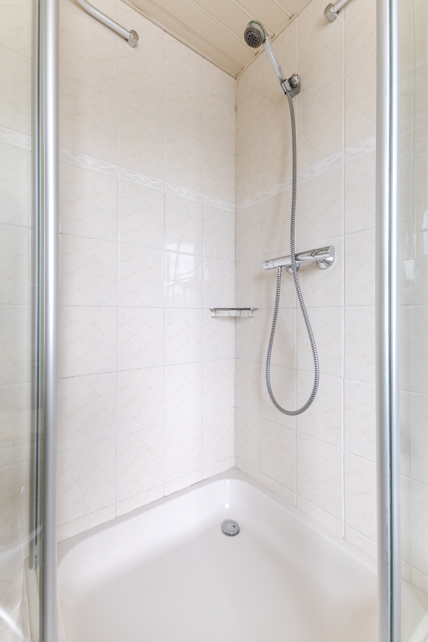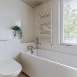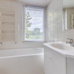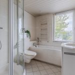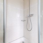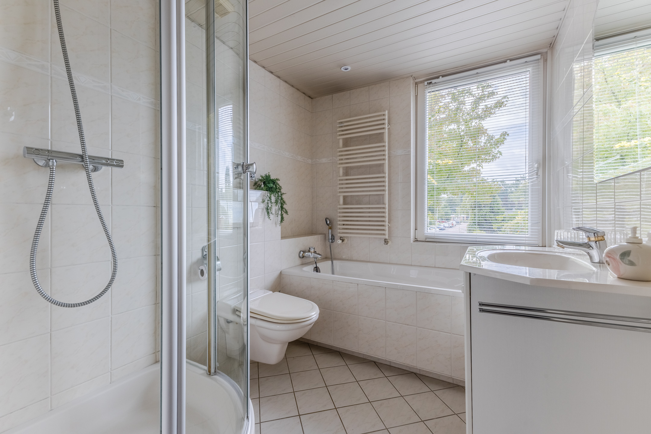 De badkamer is comfortabel en compleet uitgerust met een ligbad, douchecabine, wastafelmeubel, zwevend toilet en designradiator. De inbouwspotjes maken het geheel helemaal af.