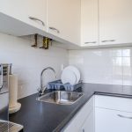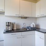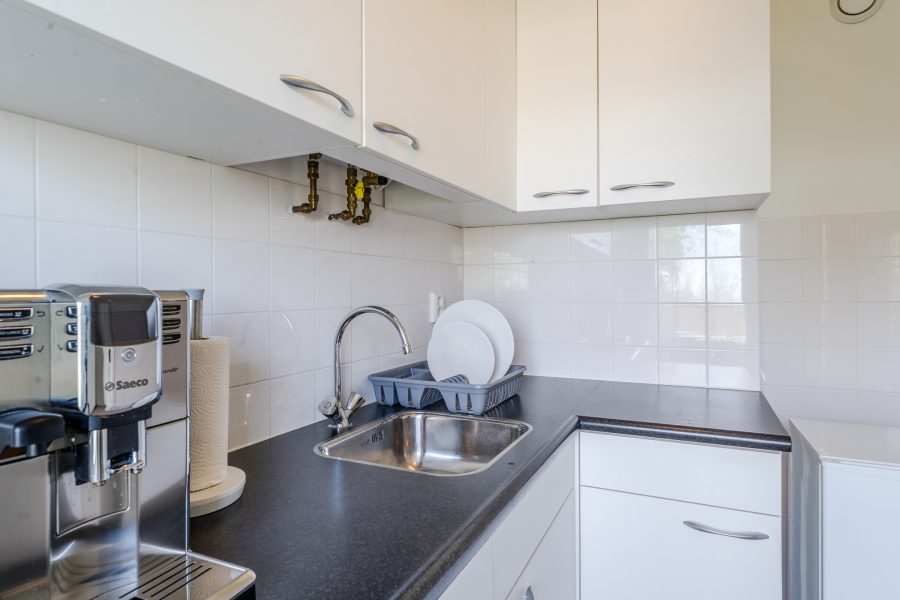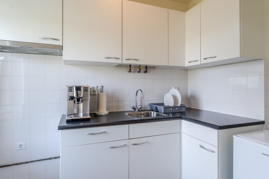 De gesloten keuken is vrijwel direct na binnenkomst te bereiken. Deze is uitgevoerd in een hoekopstelling en voorzien van witte keukenkastjes en een donker werkblad. De keuken heeft geen inbouwapparatuur en is aan vernieuwing toe. De badkamer is afgewerkt met donkere vloertegels en witte wandtegels. Hier tref je een wastafel en een inloopdouche aan. In het appartement vind je verder nog een bergkast en een toiletruimte met staand toilet.