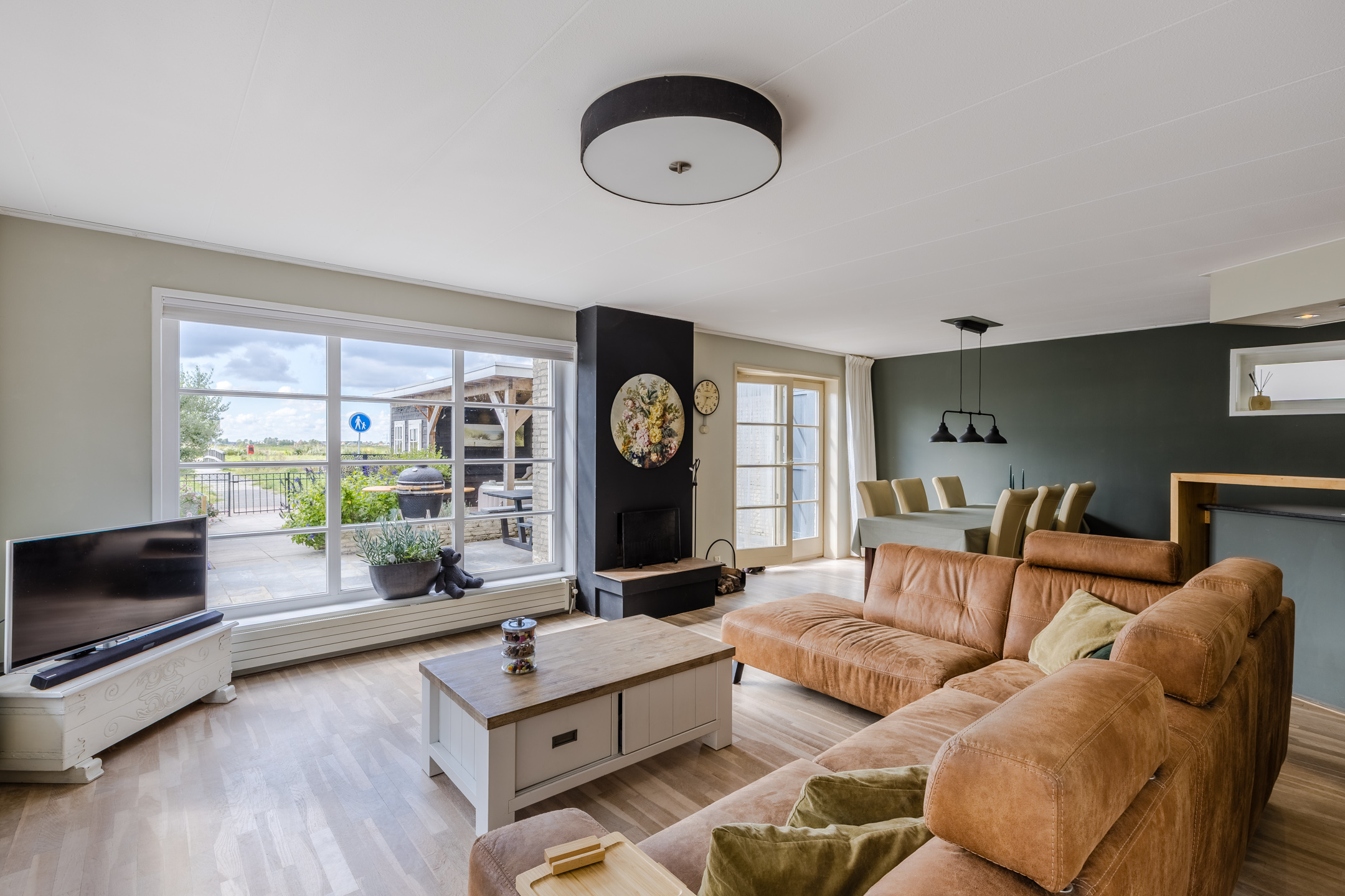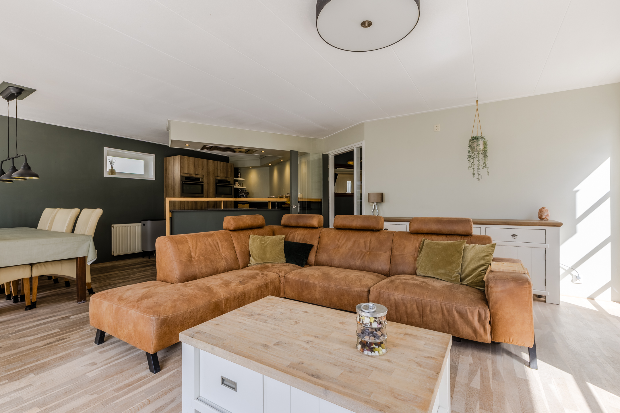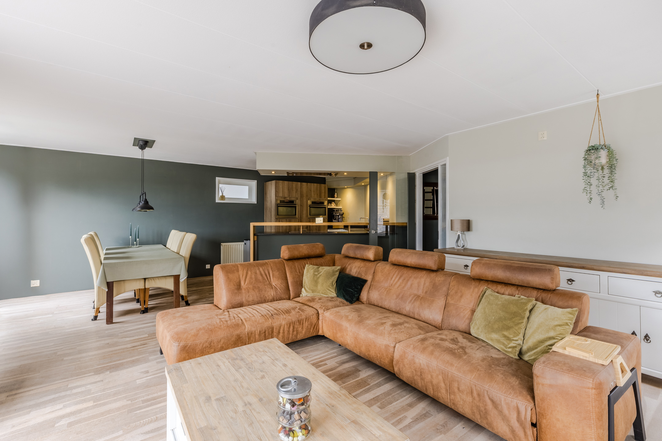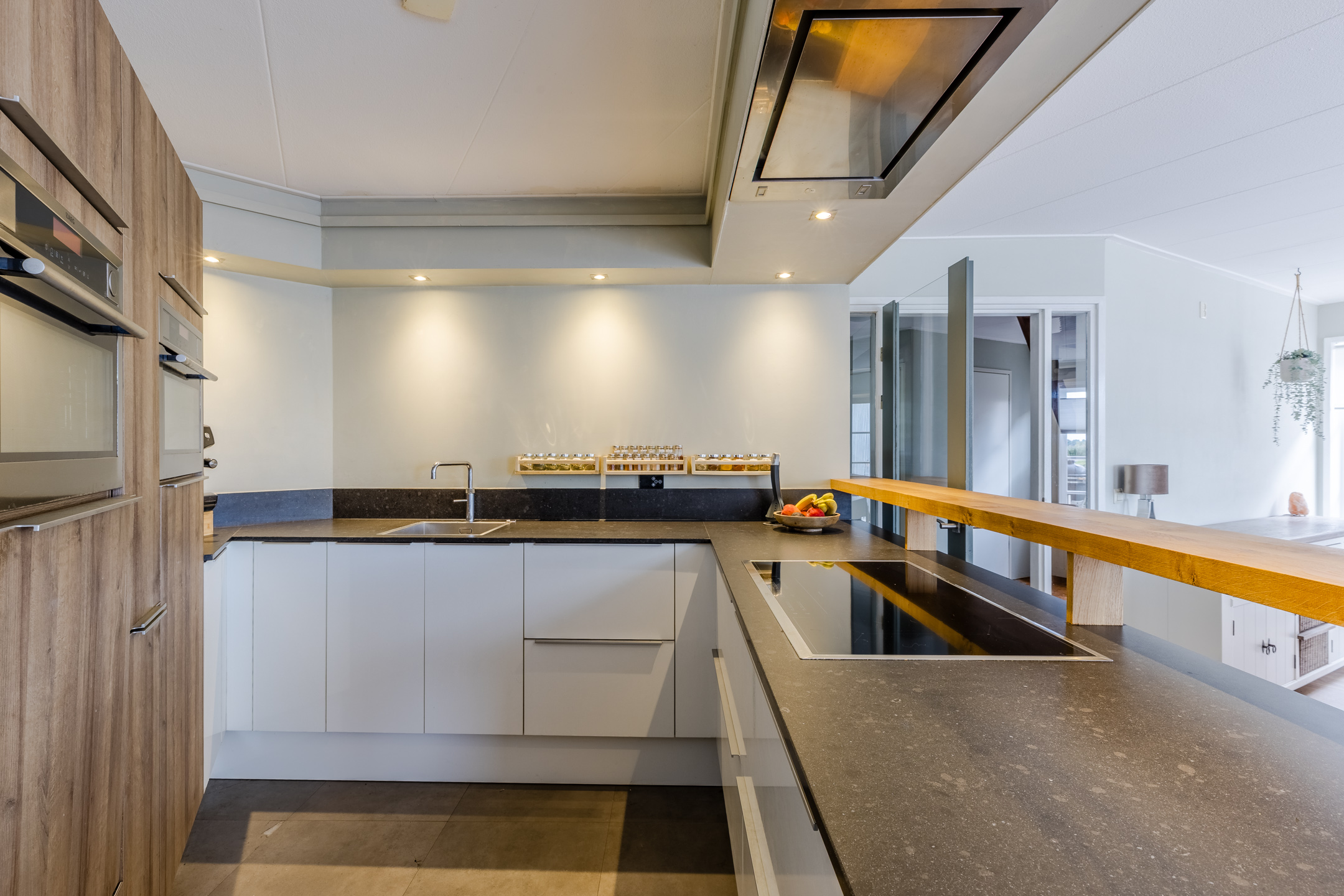 De ruime en sfeervolle woonkamer is voorzien van een nette vloer, strakke wanden en een open haard. De grote raampartijen en openslaande tuindeuren zorgen hier voor een overvloed aan natuurlijk licht. Aan de voorzijde van de woonkamer is de prachtige open keuken (2017) gesitueerd. Deze bestaat uit een houtkleurige kastenwand en een keukenblok met witte fronten en een donker werkblad. Moderne apparatuur is er in de vorm van een vaatwasser, inductie kookplaat, afzuigkap, ovens, koelkast en Quooker. De keuken wordt verlicht met spotjes.