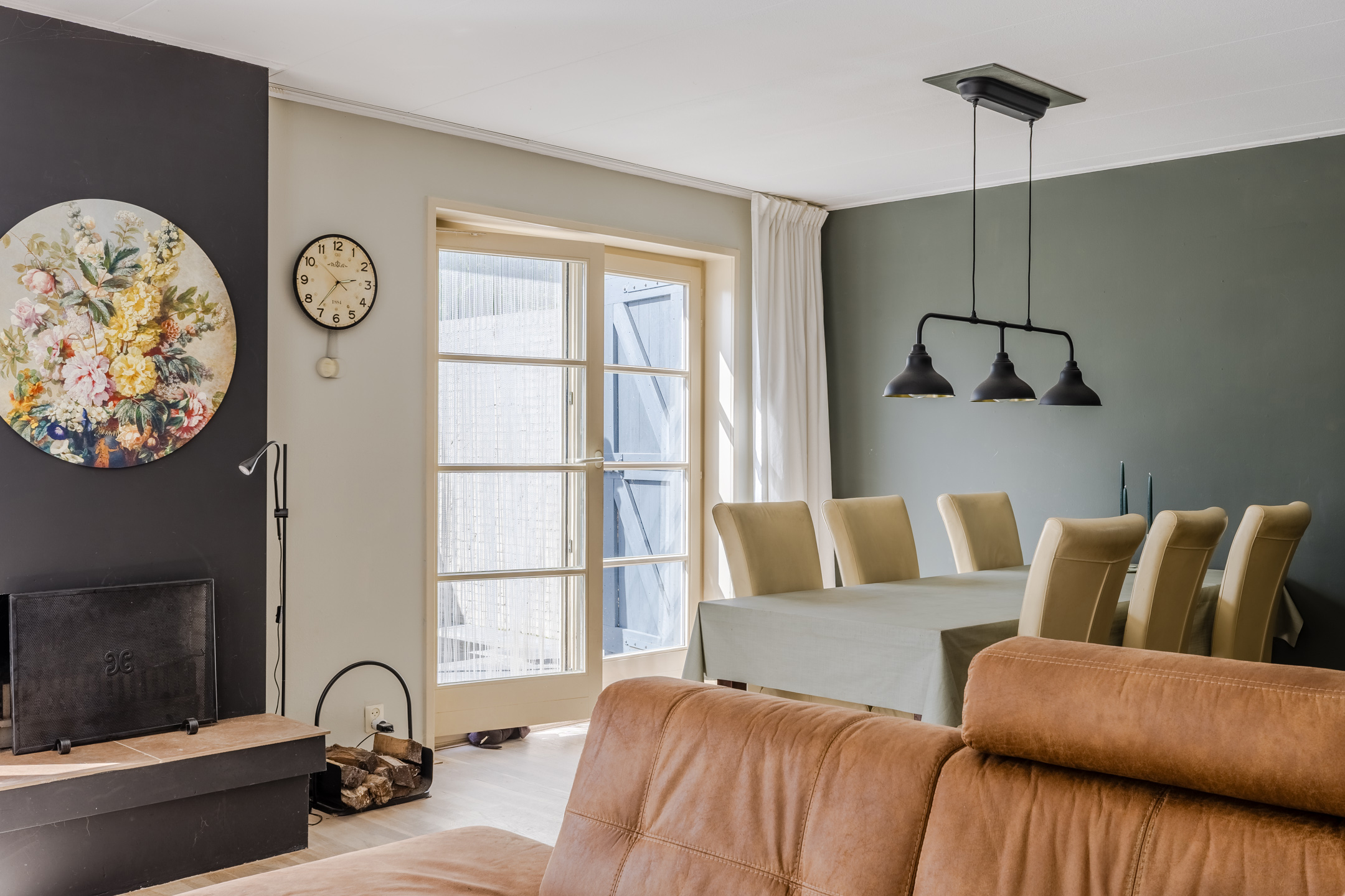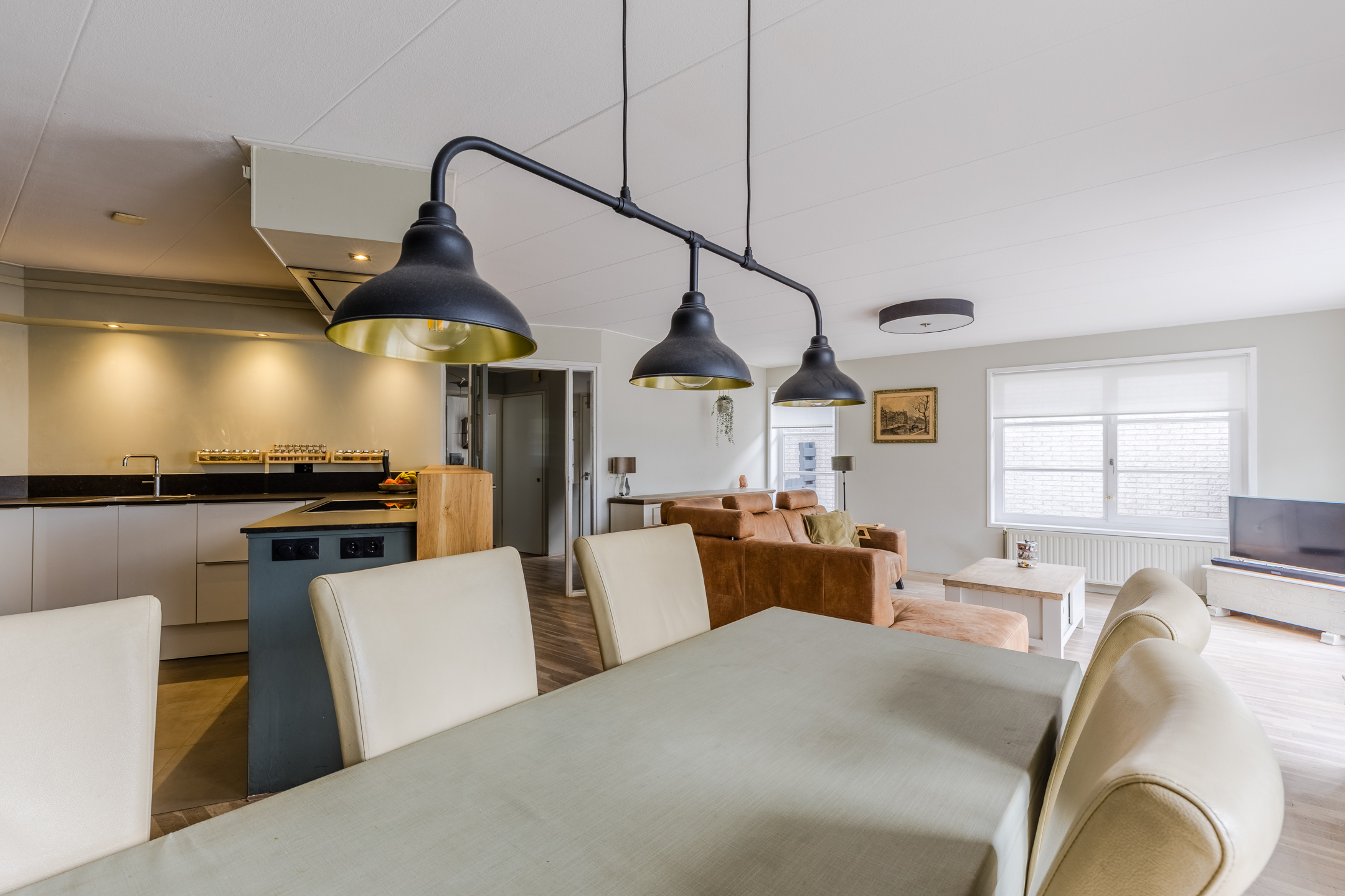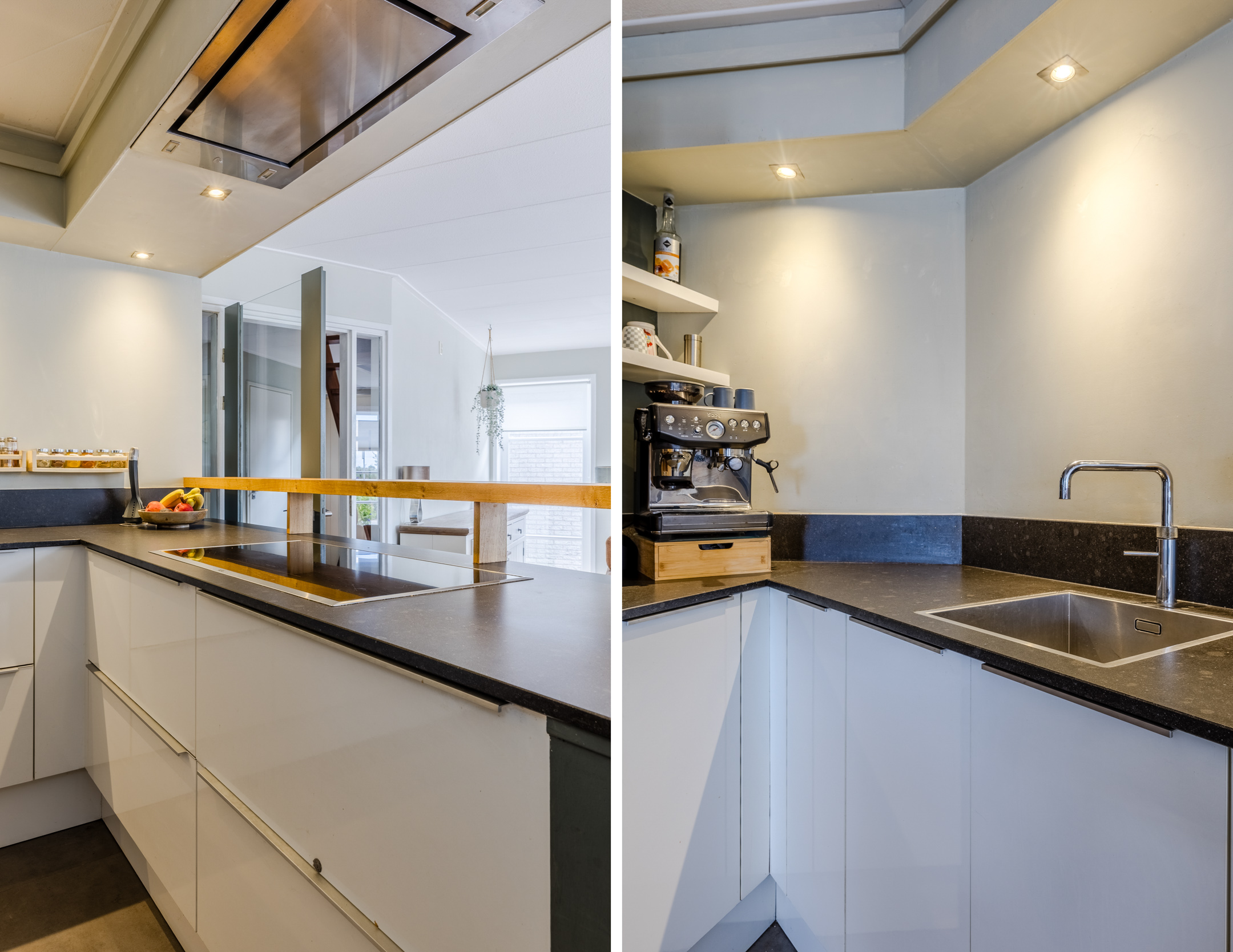 De ruime en sfeervolle woonkamer is voorzien van een nette vloer, strakke wanden en een open haard. De grote raampartijen en openslaande tuindeuren zorgen hier voor een overvloed aan natuurlijk licht. Aan de voorzijde van de woonkamer is de prachtige open keuken (2017) gesitueerd. Deze bestaat uit een houtkleurige kastenwand en een keukenblok met witte fronten en een donker werkblad. Moderne apparatuur is er in de vorm van een vaatwasser, inductie kookplaat, afzuigkap, ovens, koelkast en Quooker. De keuken wordt verlicht met spotjes.
