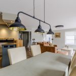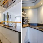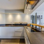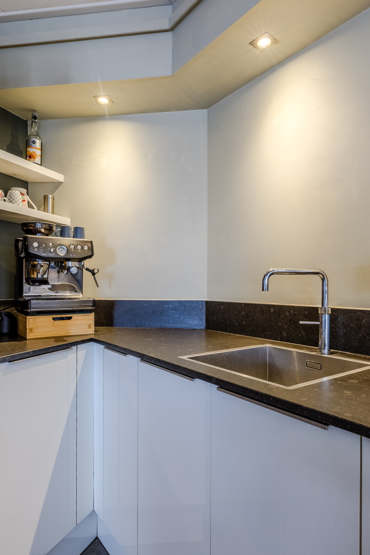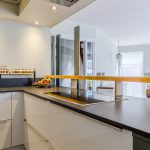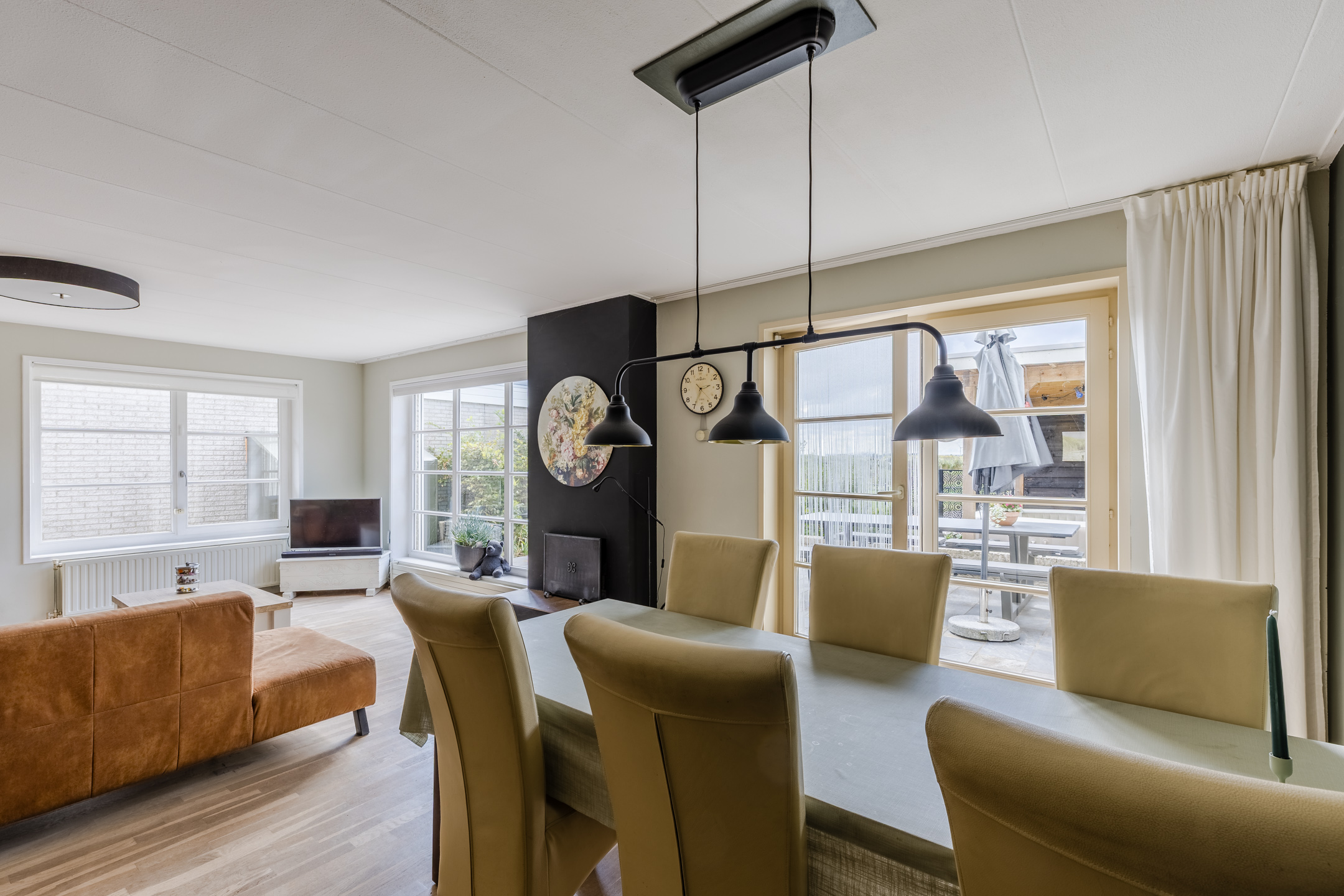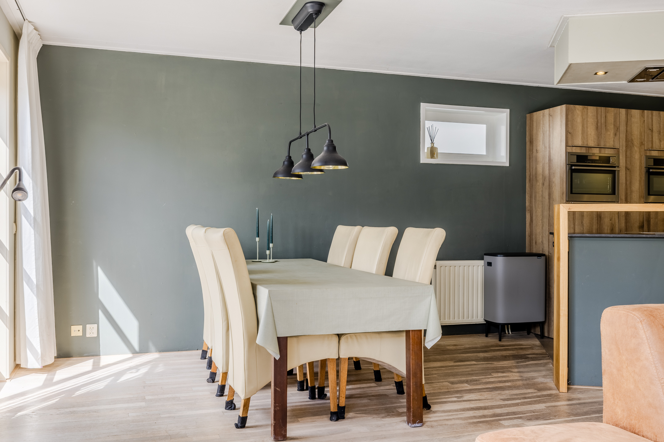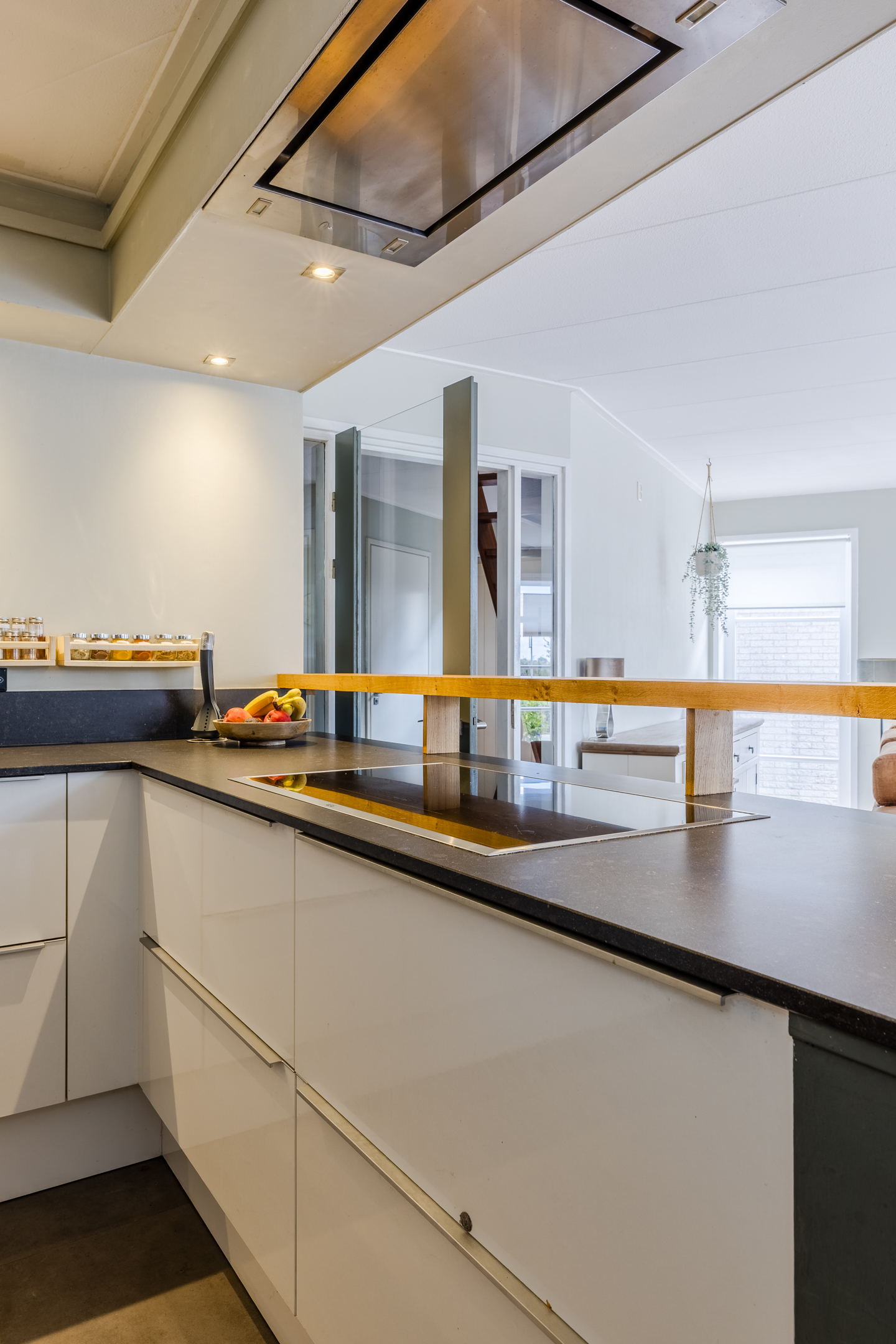 De ruime en sfeervolle woonkamer is voorzien van een nette vloer, strakke wanden en een open haard. De grote raampartijen en openslaande tuindeuren zorgen hier voor een overvloed aan natuurlijk licht. Aan de voorzijde van de woonkamer is de prachtige open keuken (2017) gesitueerd. Deze bestaat uit een houtkleurige kastenwand en een keukenblok met witte fronten en een donker werkblad. Moderne apparatuur is er in de vorm van een vaatwasser, inductie kookplaat, afzuigkap, ovens, koelkast en Quooker. De keuken wordt verlicht met spotjes.