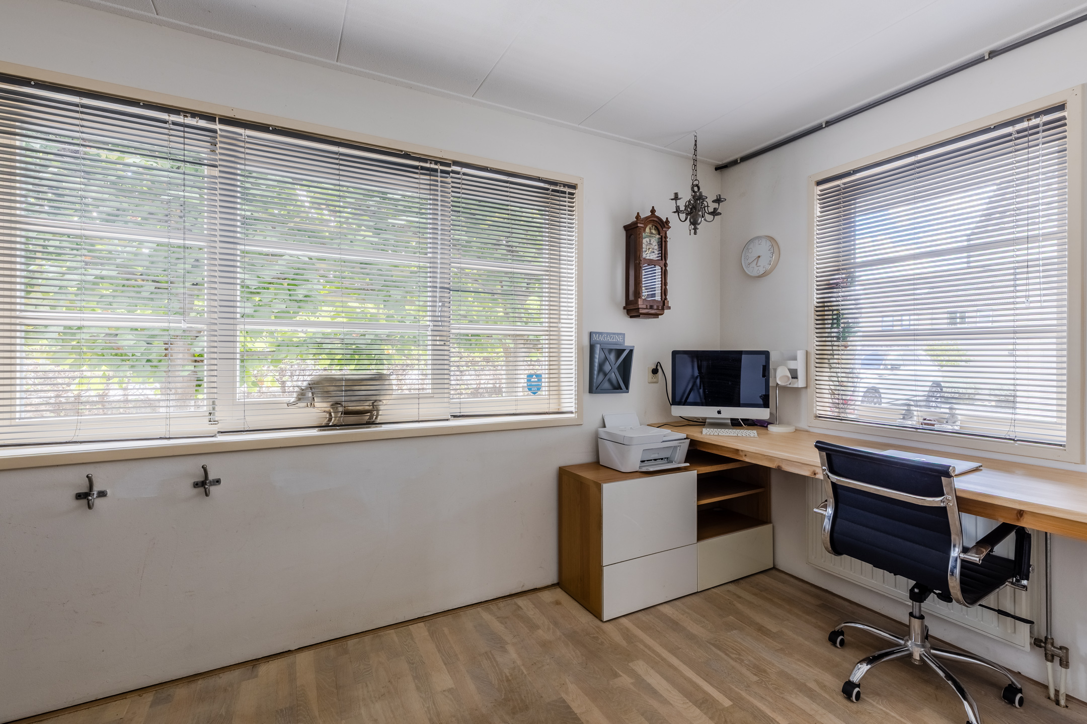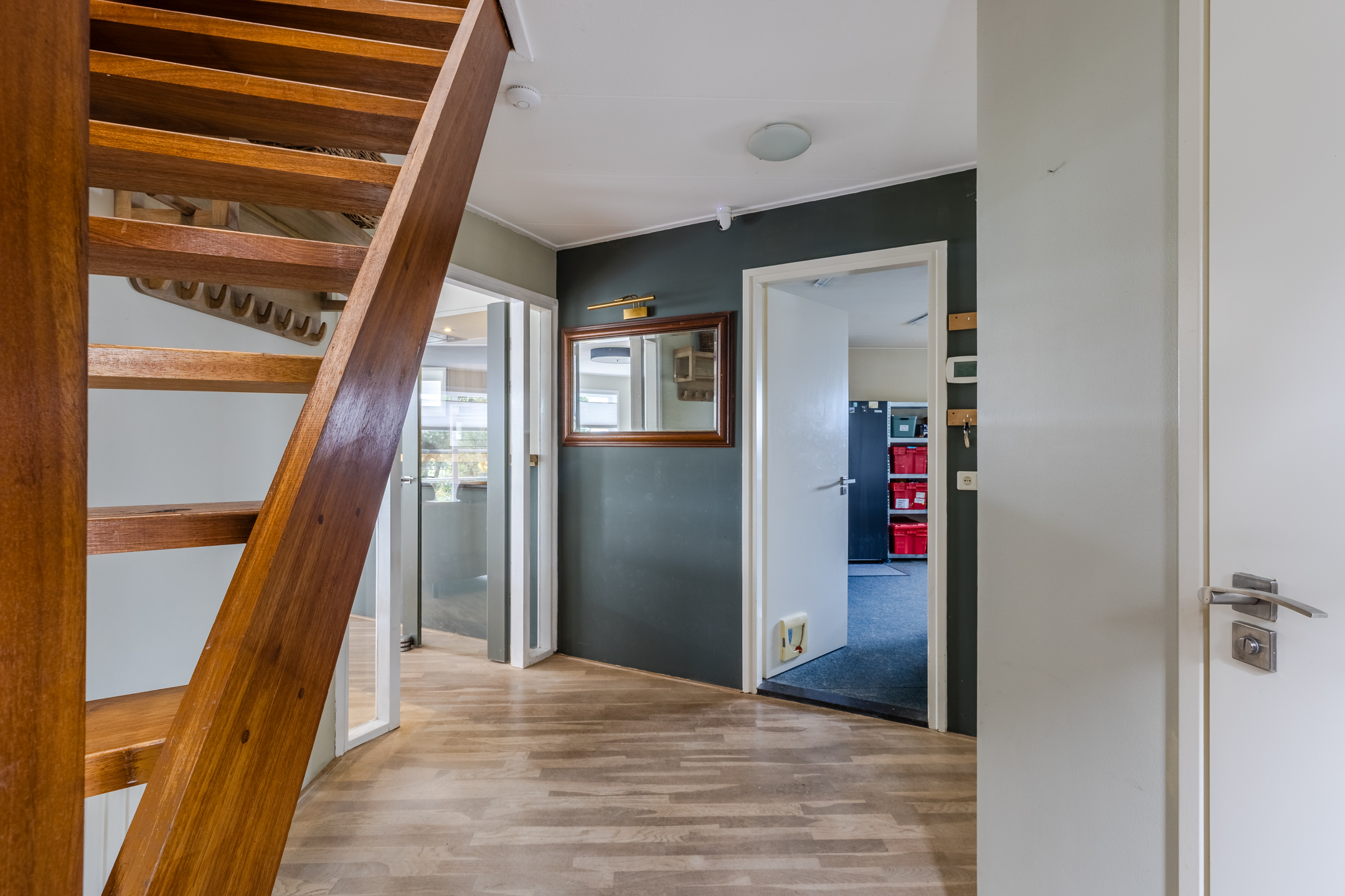 Op de begane grond bevindt zich ook een ruim kantoor. Deze kamer is fraai afgewerkt en heerlijk licht dankzij de grote raampartijen. Verder biedt de entreehal nog toegang tot de royale inpandige garage. Daar heb je naast opslagruimte ook de mogelijkheid om een werkplaats of hobbyruimte te creëren.
