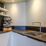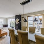 The spacious and attractive living room has neat flooring, smooth walls and a fireplace. The large windows and garden doors provide an abundance of natural light. At the front of the living room is the beautiful open kitchen (2017). It consists of wood-colored cabinets and a kitchen unit with white fronts and a dark worktop. Modern appliances include a dishwasher, induction hob, extractor hood, ovens, refrigerator and Quooker. The kitchen is lit with spotlights.