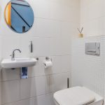 The bathroom is nicely finished with dark floor tiles and white wall tiles. This room is equipped with a vanity unit with double sink, bathtub and walk-in shower.