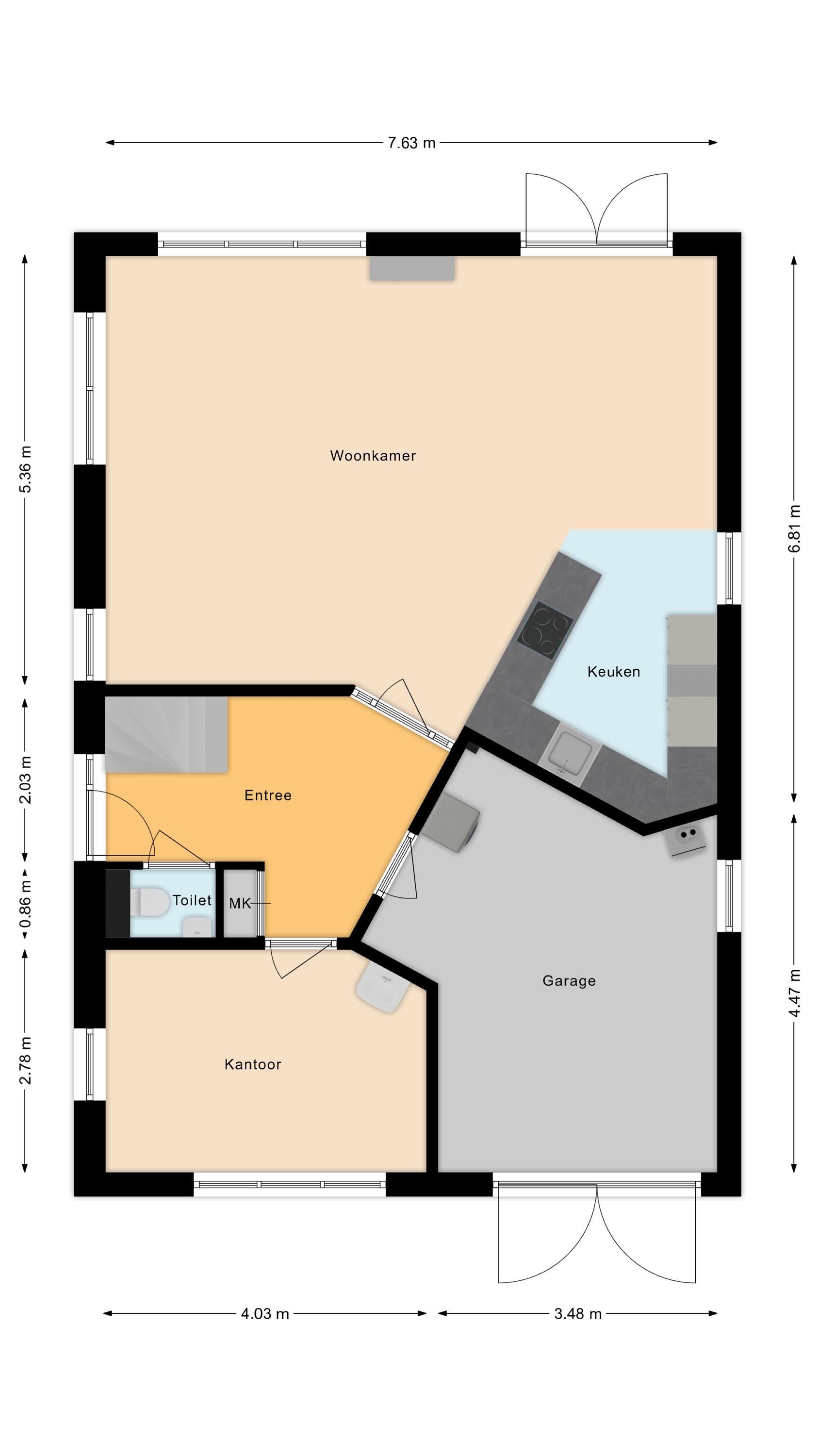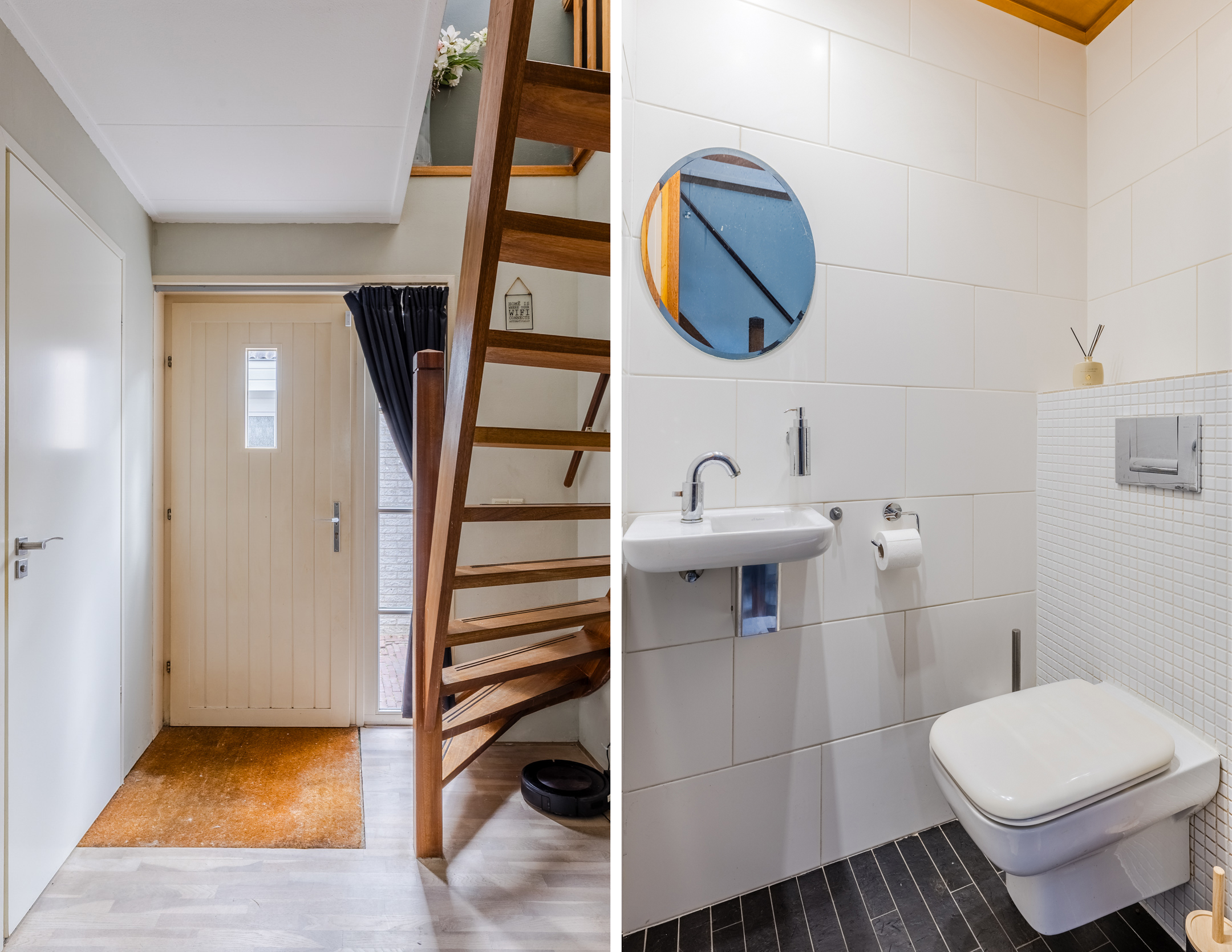 Via de deels groene en deels betegelde voortuin bereik je de voordeur aan de zijkant van de woning. Na binnenkomst beland je in een ruime entreehal met een toiletruimte met zwevend toilet en fonteintje, de trapopgang naar de eerste verdieping en toegang tot de woonkamer, het kantoor en de inpandige garage.