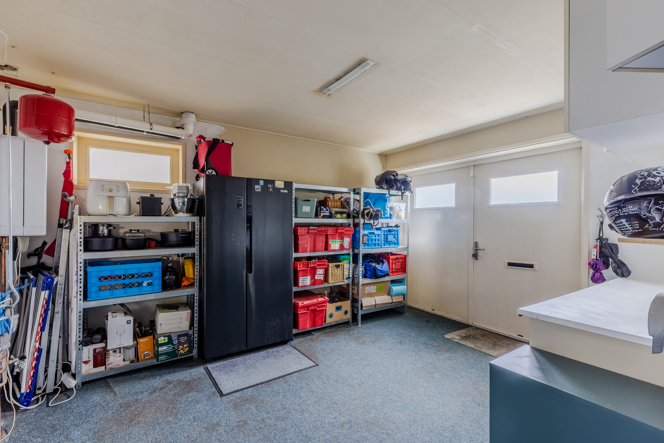 There is also a spacious office on the ground floor. This room is beautifully finished and wonderfully light thanks to the large windows. The entrance hall also provides access to the spacious indoor garage. In addition to storage space, you also have the option of creating a work- or hobby room.