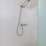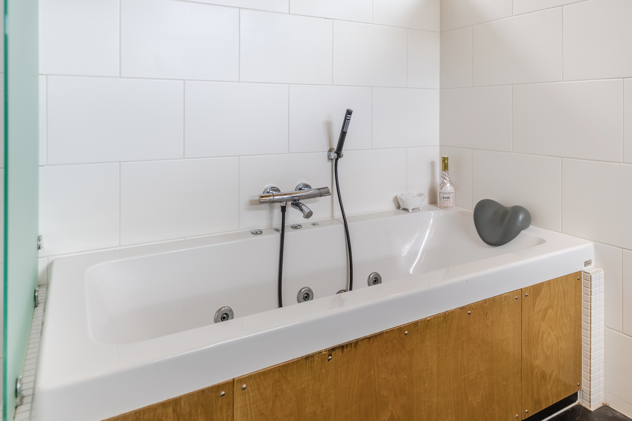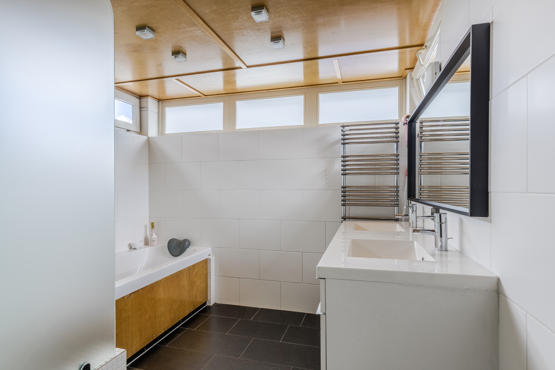 De badkamer is netjes afgewerkt met donkere vloertegels en witte wandtegels. Deze ruimte is voorzien van een badmeubel met dubbele wastafel, ligbad en inloopdouche.