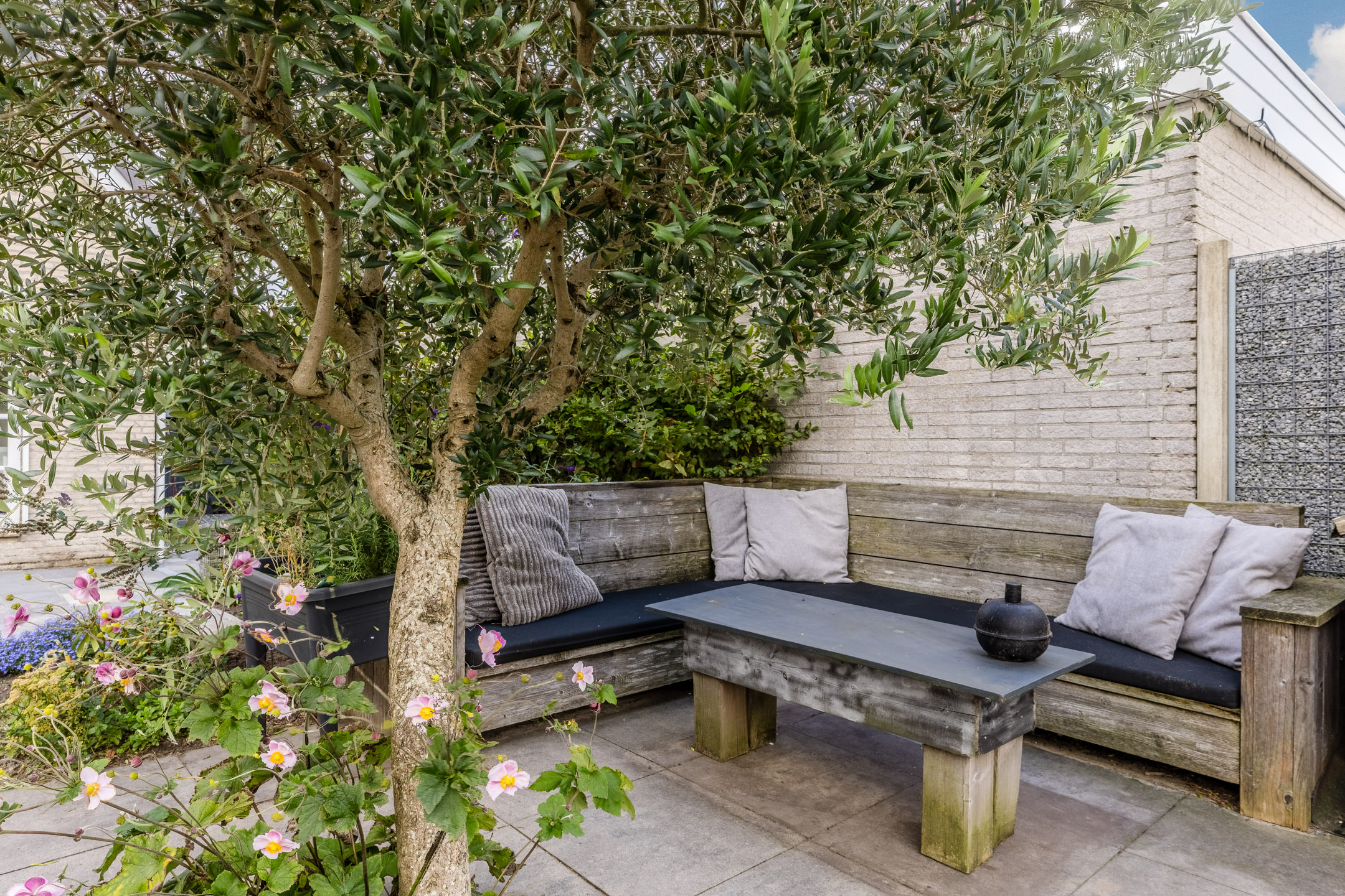 Wat een heerlijke tuin is dit! Deze diepe tuin is fraai aangelegd met zowel tegels als groen. Er is meer dan genoeg ruimte om buiten te loungen. Het is er uitstekend beschut, waardoor je volop privacy hebt. In de tuin is nog een grote houten overkapping aanwezig, waar je heerlijk overdekt kunt relaxen. Aan deze overkapping grenst een houten berging, die ruimte biedt voor je tuinspullen en fietsen. De tuin is bereikbaar via een achterom.