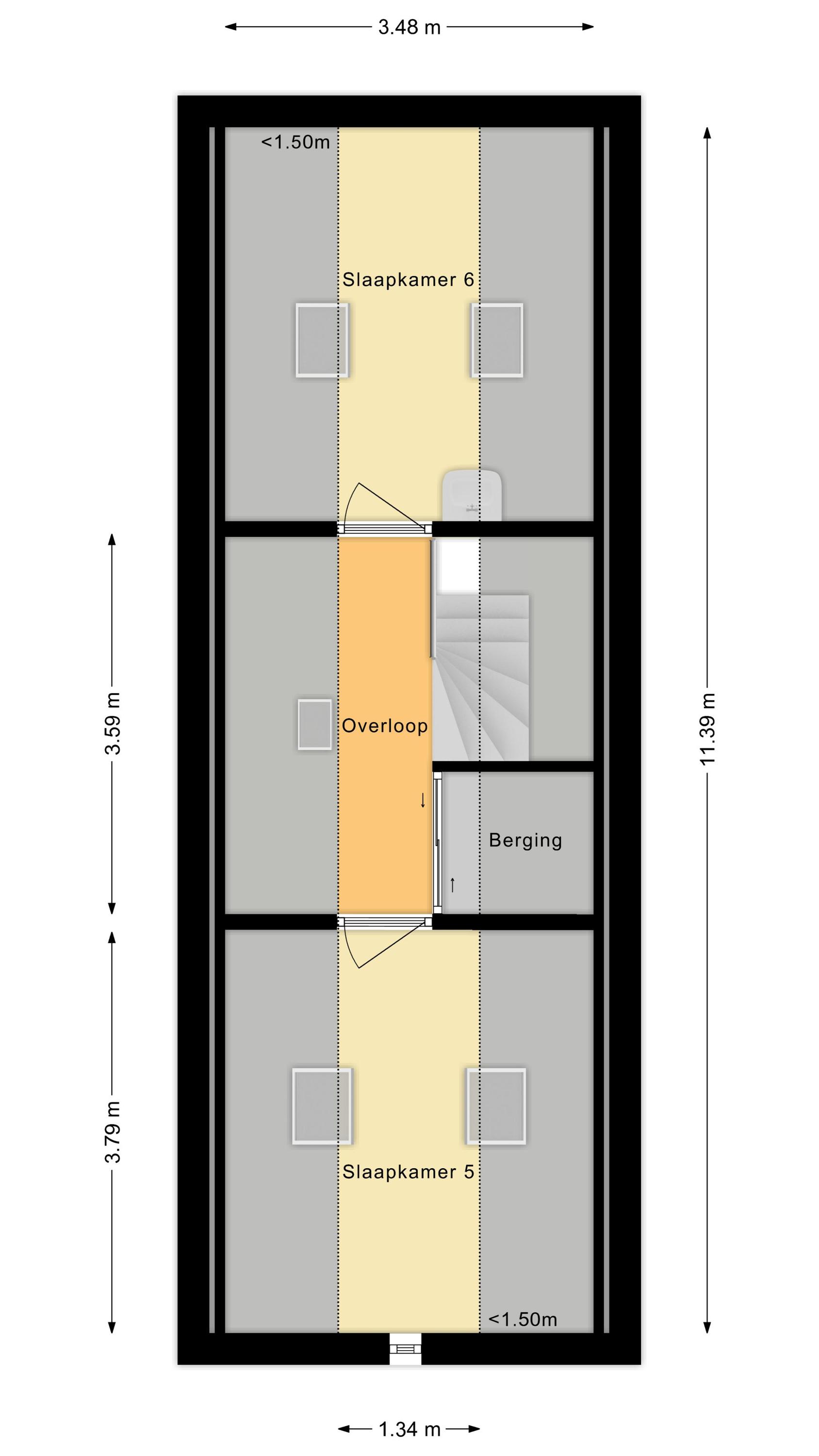 Op de tweede verdieping vind je een berging en de vijfde en zesde slaapkamer. De twee slaapkamers zijn ruim van formaat, beschikken over vloerbedekking en genieten van een uitstekende lichtinval. Eén van de twee slaapkamers is uitgerust met een wastafel.