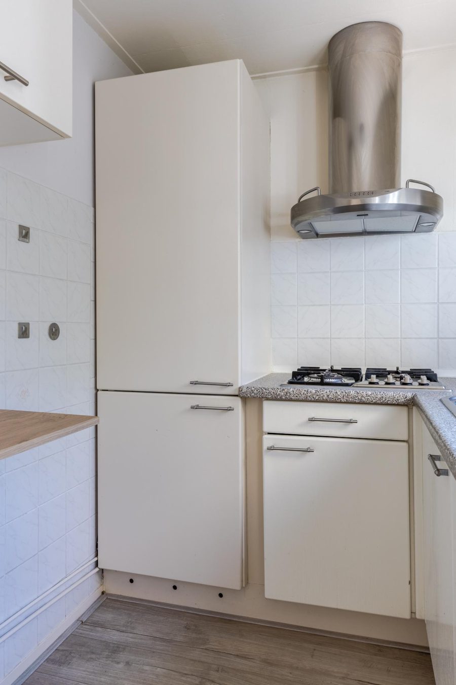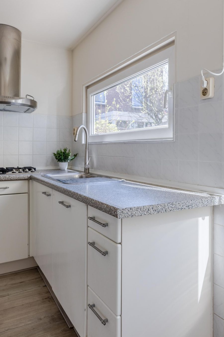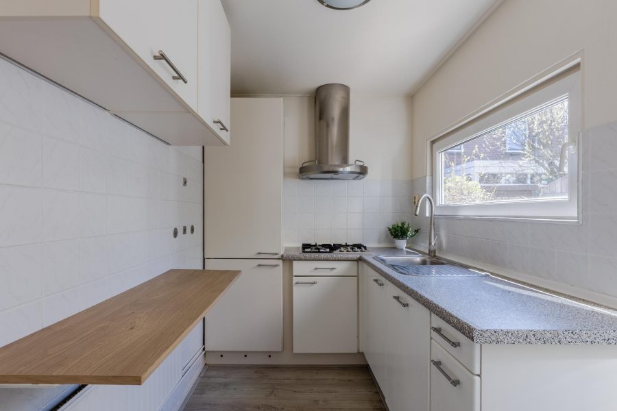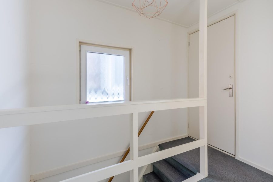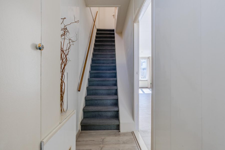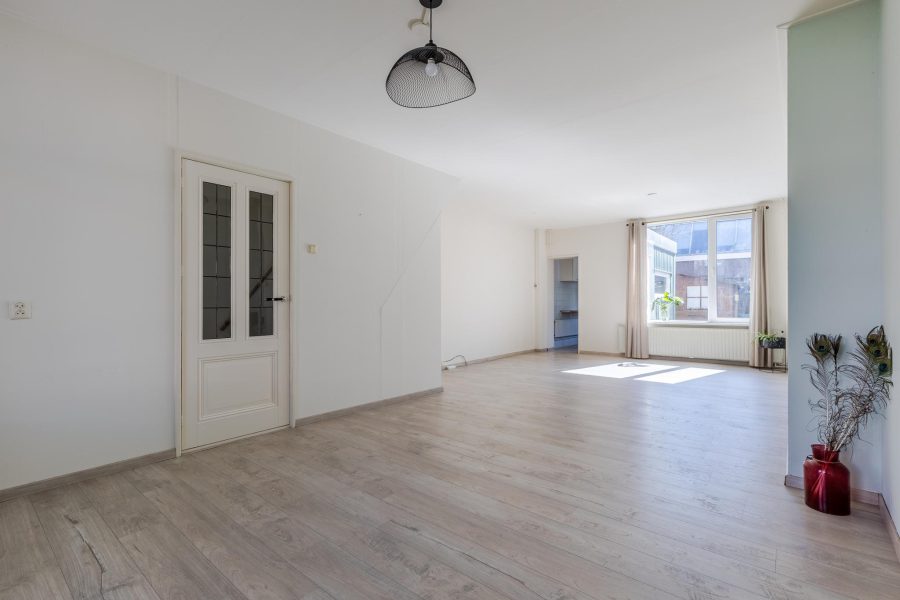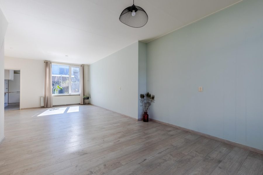 Via the pavement, we reach the beautiful, authentic front door of the house. The front door has an overhead light. Entrance with meter closet and wardrobe, staircase to the first floor and access to the living room with attached kitchen. The spacious living room has two windows at the front and one at the back. At the rear is also the open access to the kitchen in the wooden extension. The simple L-shaped kitchen (2003) has white fronts and is equipped with built-in appliances. The kitchen has a wide window and an access door to the garden terrace. The ground floor has laminate flooring and the walls and ceilings are sleek and neutral. There is a stairs closet in the room.