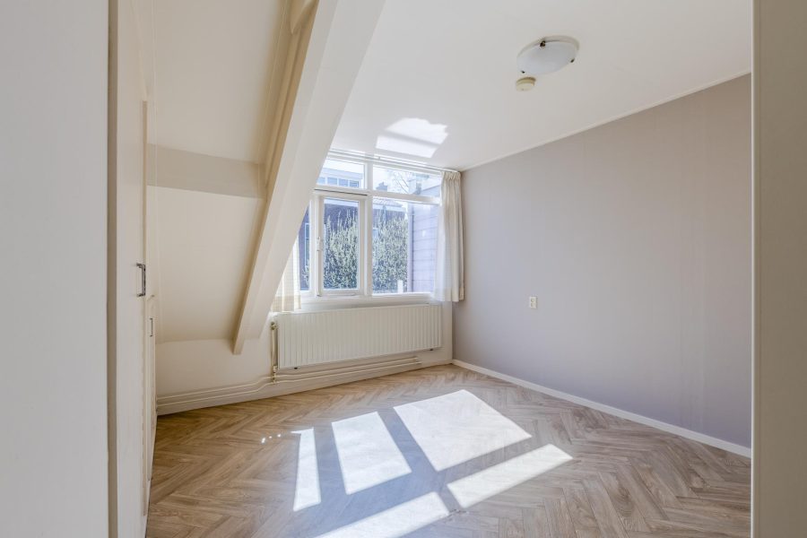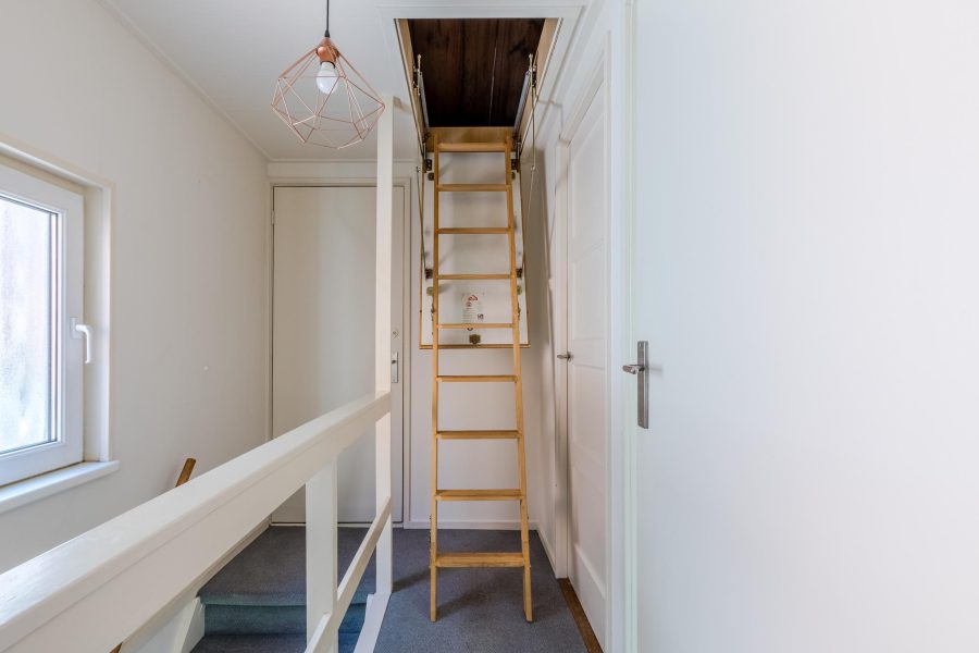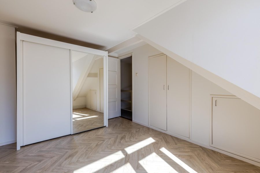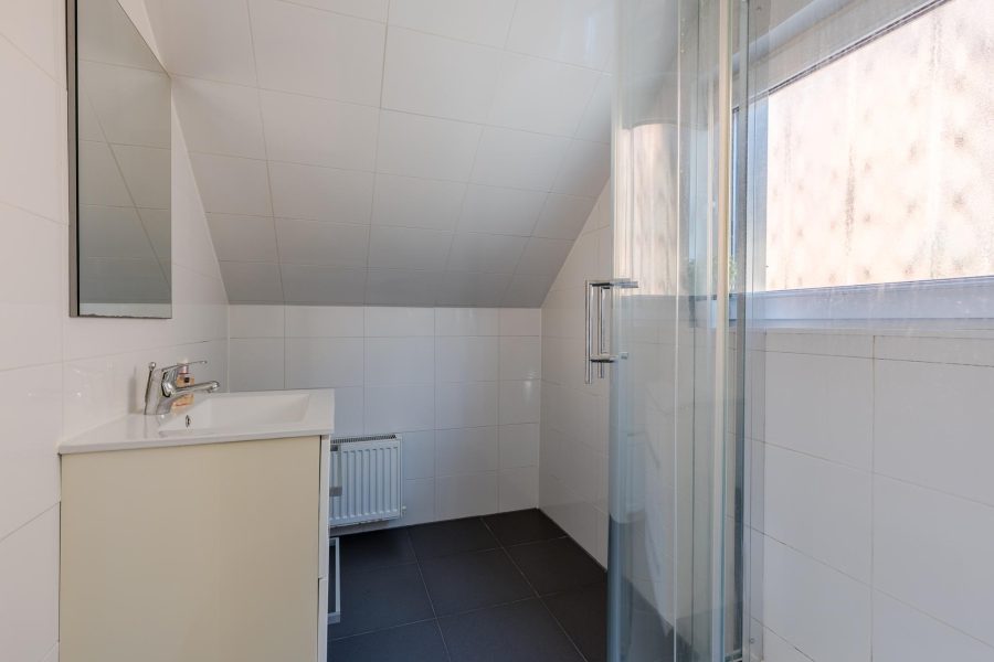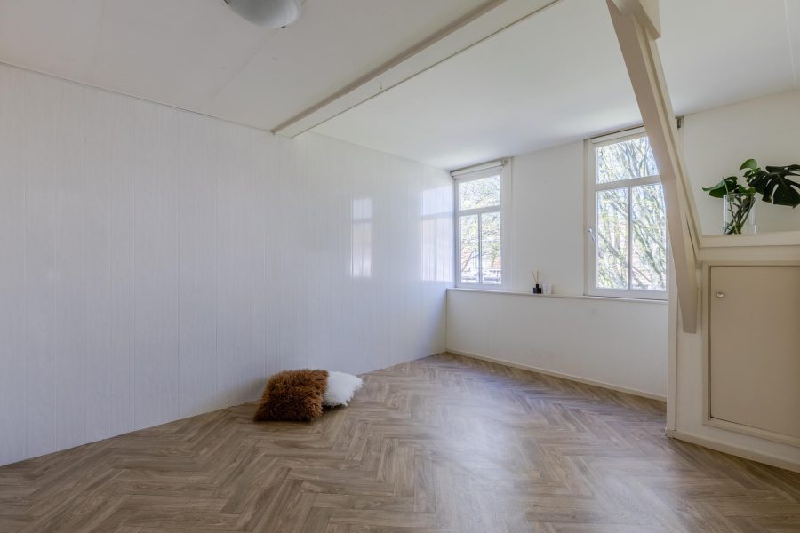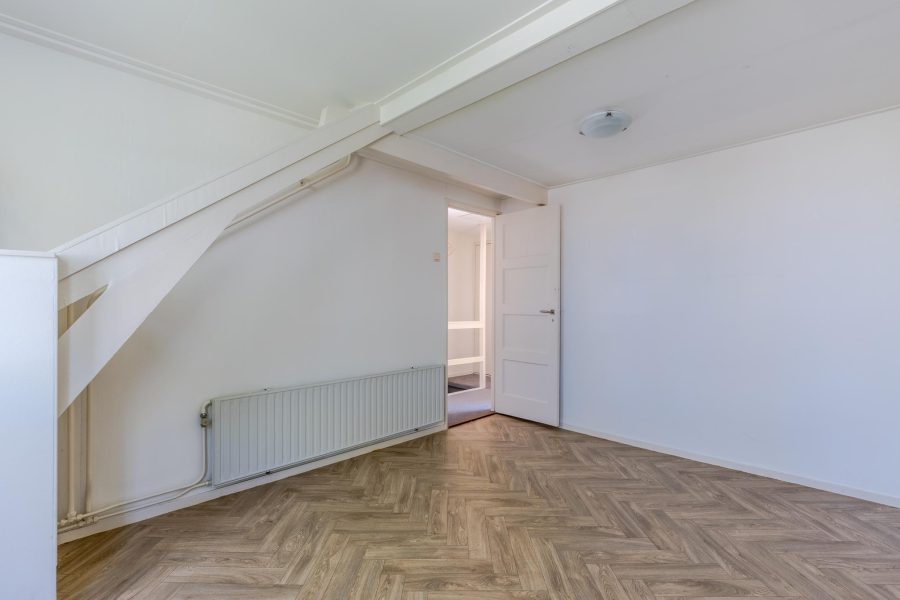 Via the upholstered staircase, we reach the landing of this floor. This floor has a dormer window at both the front and rear. Here you will find a standing toilet with hand basin, two well-finished bedrooms, storage space and the bathroom. One bedroom is at the rear and the second bedroom is at the front, next to the bathroom. Both bedrooms have a fitted wardrobe and there is a herringbone PVC floor. The bathroom has a washbasin with mirror and a corner shower cabin. You will also find storage space here. A staircase to the spacious storage attic can be found on the landing.