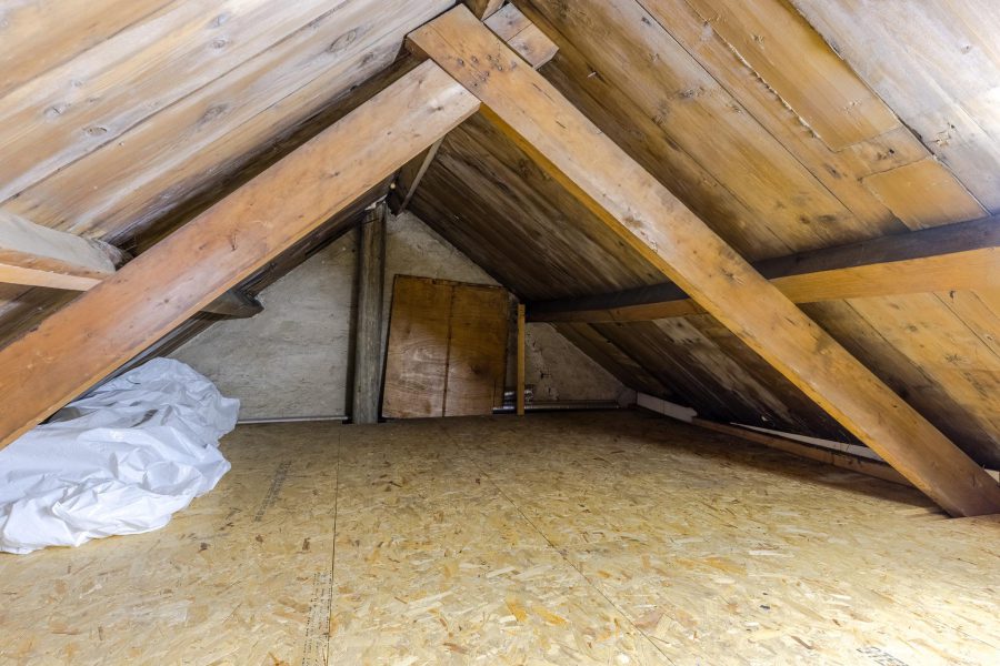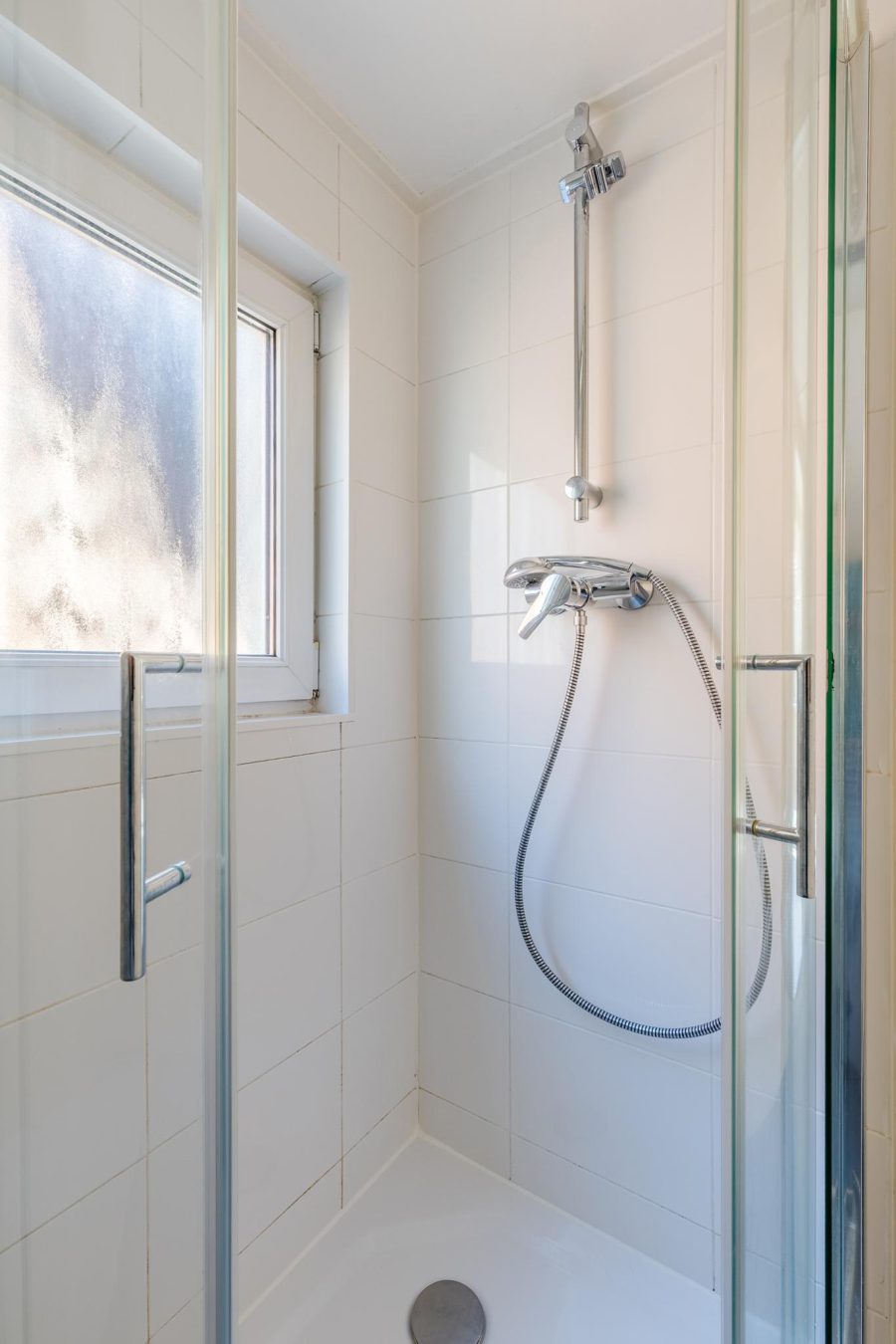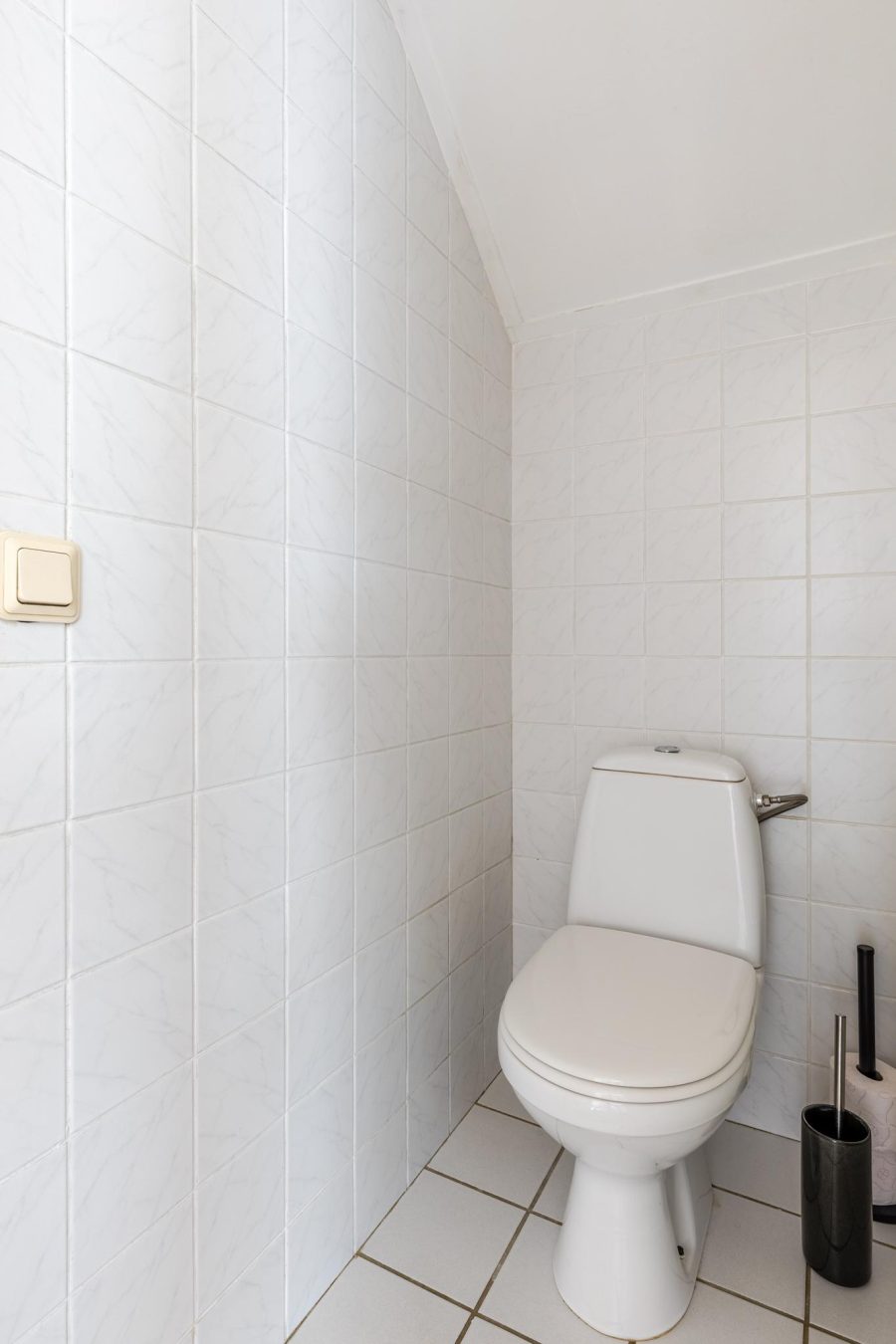 Via the upholstered staircase, we reach the landing of this floor. This floor has a dormer window at both the front and rear. Here you will find a standing toilet with hand basin, two well-finished bedrooms, storage space and the bathroom. One bedroom is at the rear and the second bedroom is at the front, next to the bathroom. Both bedrooms have a fitted wardrobe and there is a herringbone PVC floor. The bathroom has a washbasin with mirror and a corner shower cabin. You will also find storage space here. A staircase to the spacious storage attic can be found on the landing.