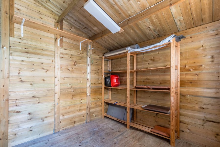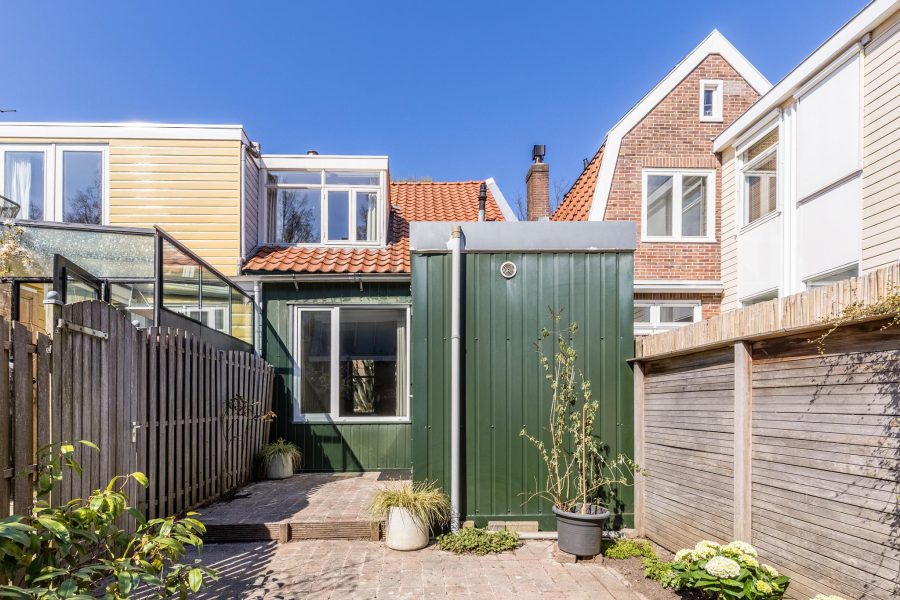The house has a sheltered, sunny, partly green, partly tiled back garden. You can create a nice lounge area here and children can play safely. There is a back entrance via the alley. At the back of the garden is a wooden shed with electricity.