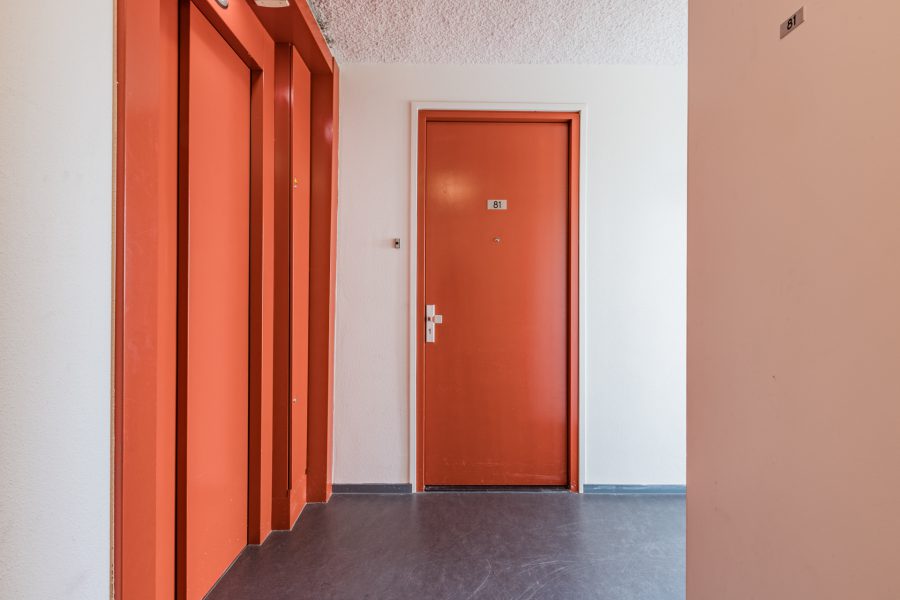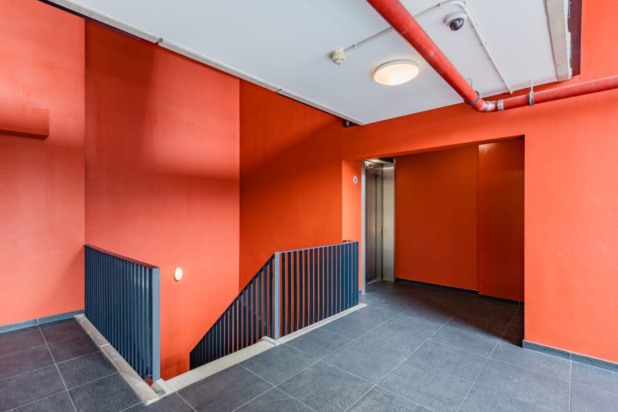 Closed entrance with doorbells and intercom. Representative communal hallway with staircase and lift.