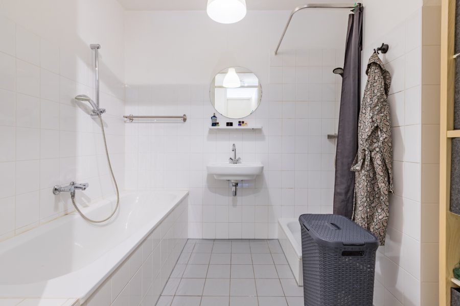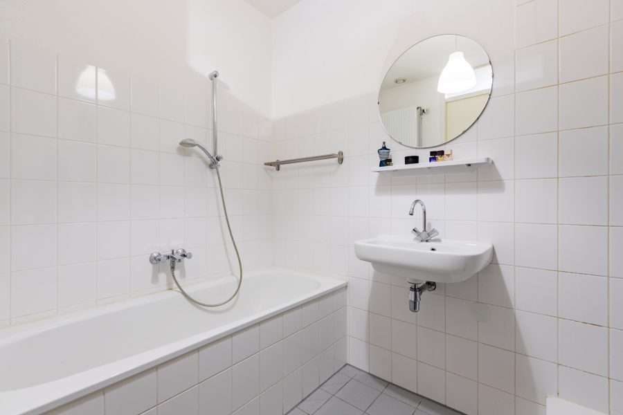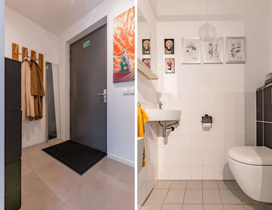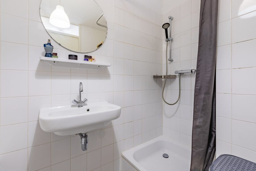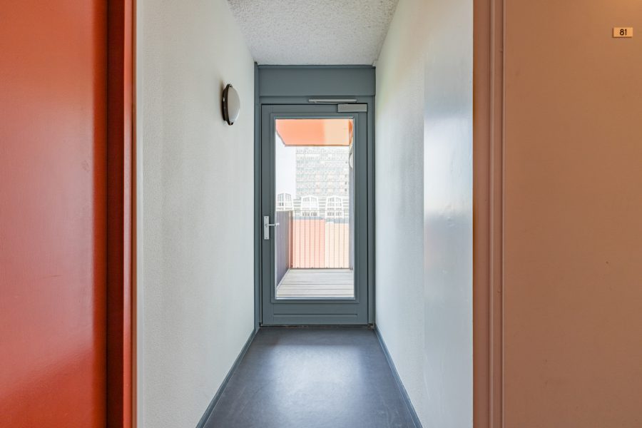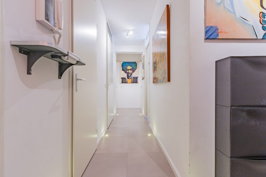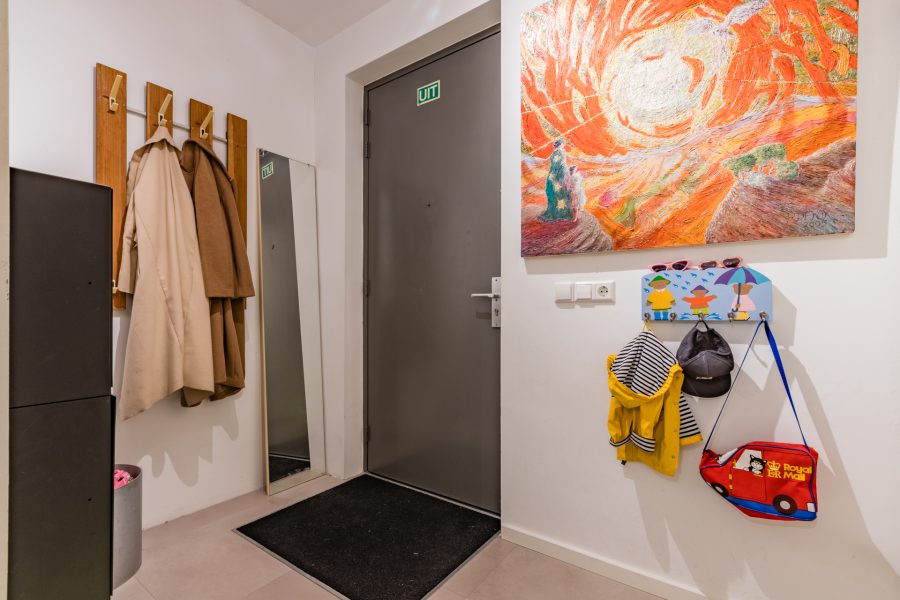 Met de lift bereik je de hal en de voordeur van de woning. Entree met direct aan je linkerhand het zwevende toilet met fonteintje, de meter-/bergkast en de badkamer. Aan je rechterhand tref je de twee ruime slaapkamers aan. De grootste slaapkamer heeft een luik naar de bergvliering. De eigentijdse, lichte badkamer is voorzien van een wastafel met spiegel, een douchecabine en een ligbad.