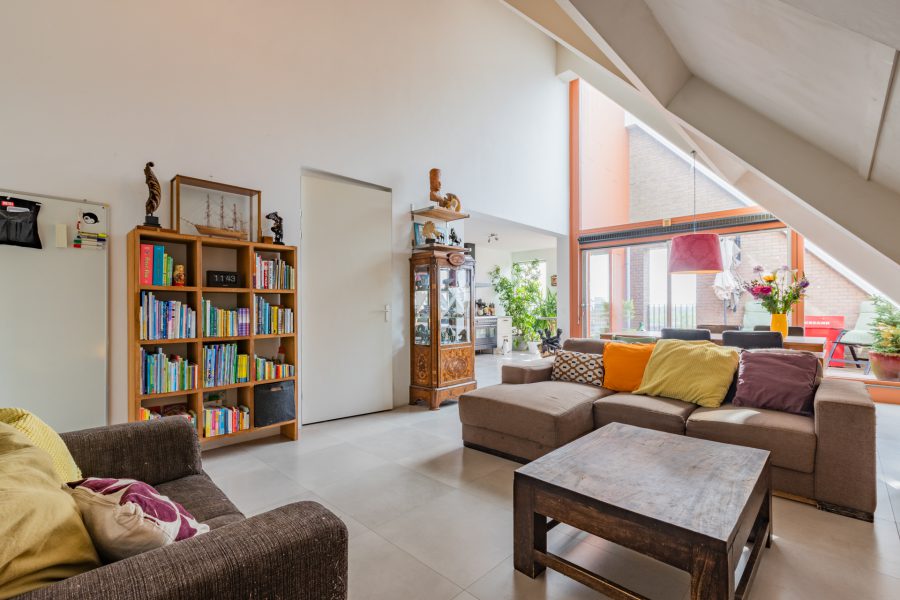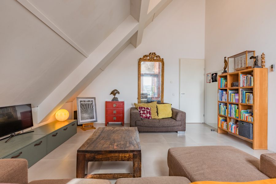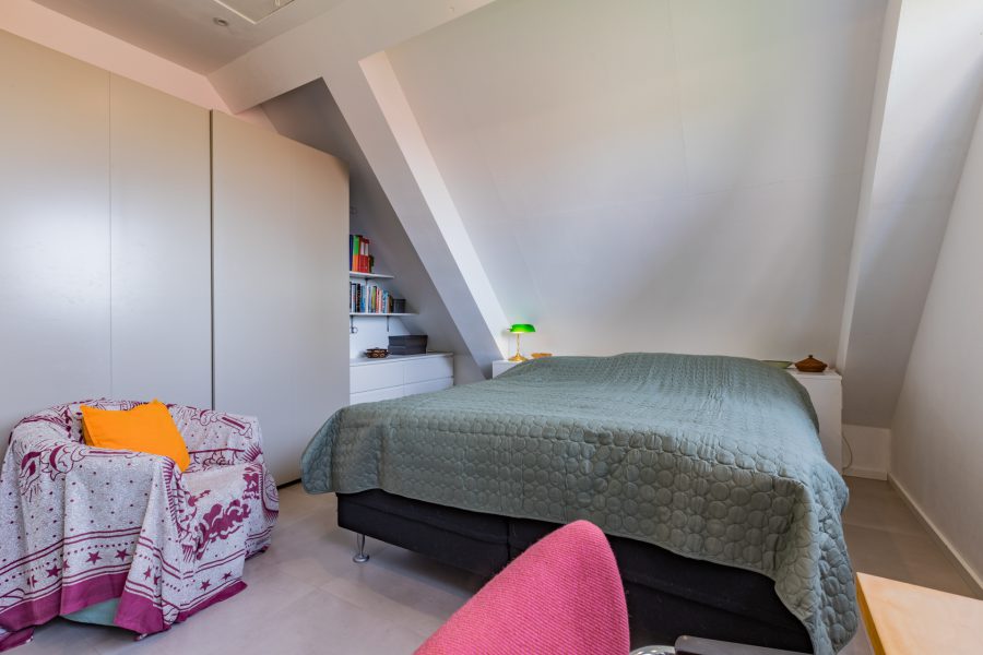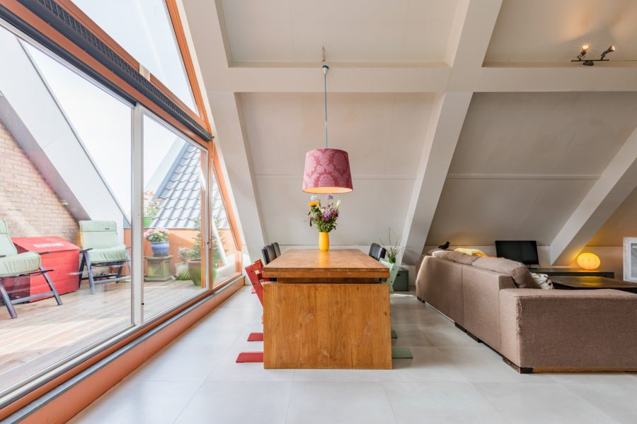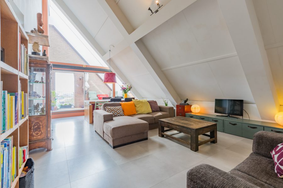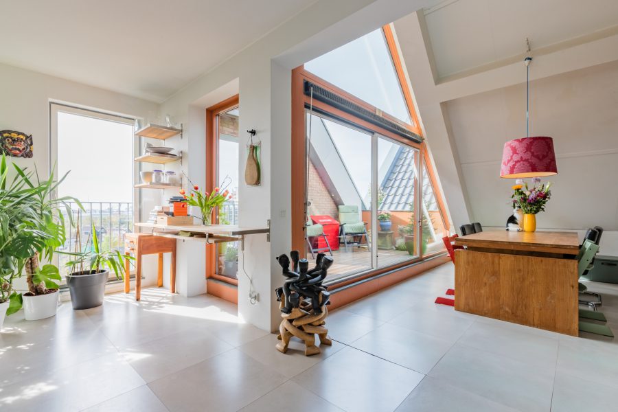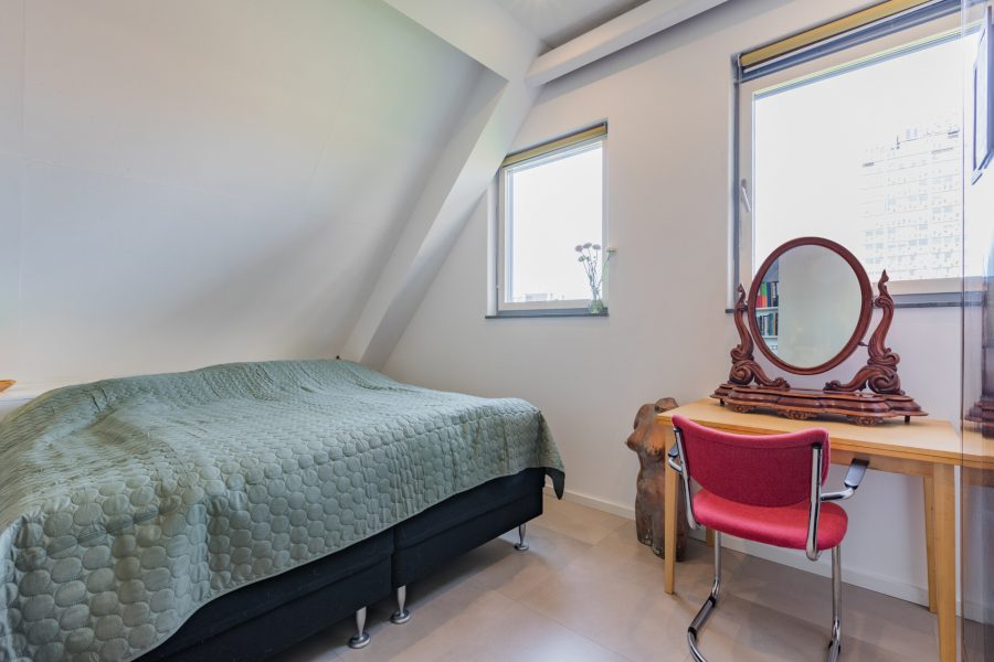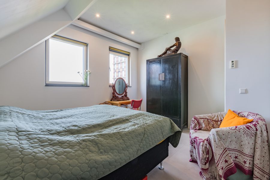 At the end of the hallway, you will find the entrance door to the living room with open kitchen. The bright, cosy living room is under the ceiling beams and has a large glass sliding door to the indoor roof terrace with unobstructed views over the Zaandam area. The spacious terrace offers plenty of privacy. At the front of the living room is the very well-equipped kitchen with beautiful, modern appliances, including an induction cooker and an American fridge. The kitchen has three windows, one of which overlooks the roof terrace. The ceiling and walls are nicely finished and the floor of the entire apartment has tiles with both underfloor heating and underfloor cooling. In the living room there is a storage closet with the connections for washer and dryer.