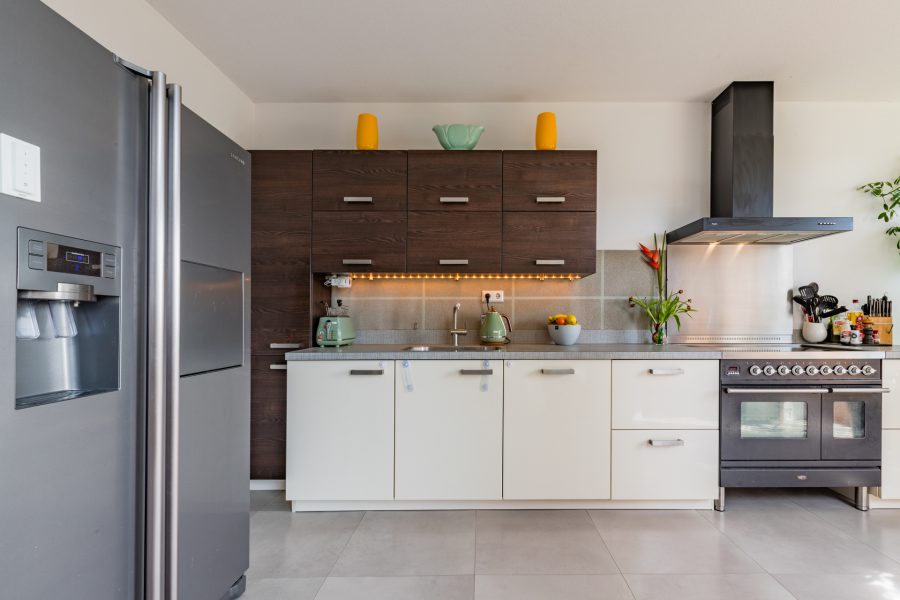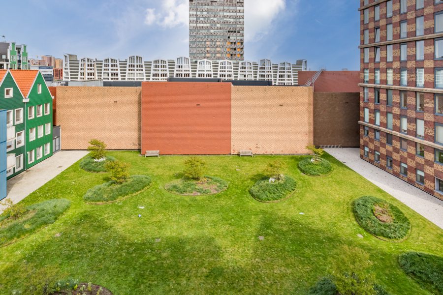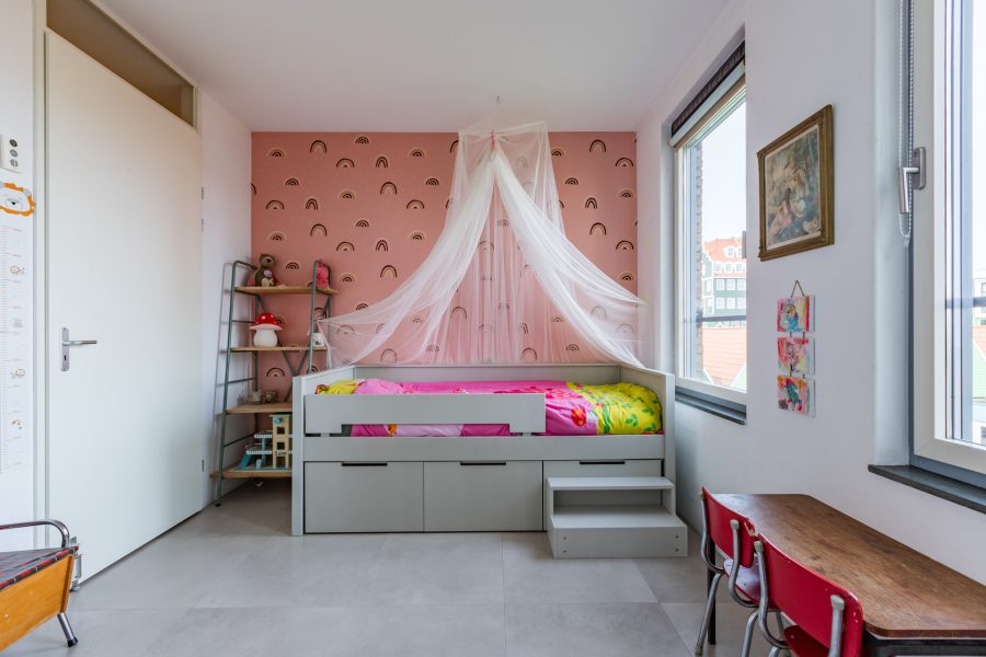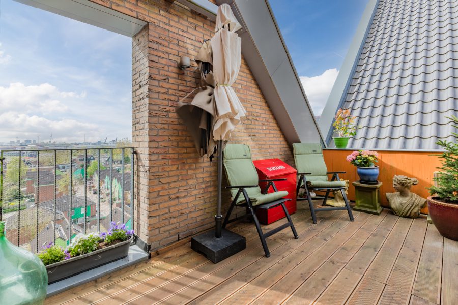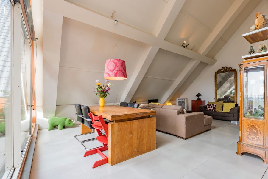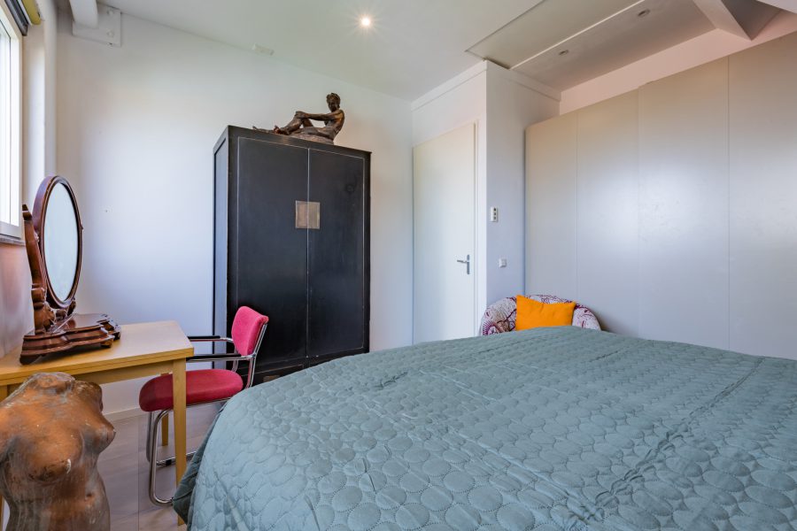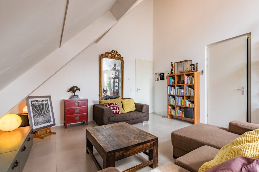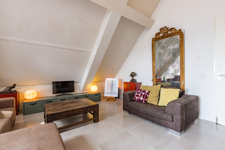 At the end of the hallway, you will find the entrance door to the living room with open kitchen. The bright, cosy living room is under the ceiling beams and has a large glass sliding door to the indoor roof terrace with unobstructed views over the Zaandam area. The spacious terrace offers plenty of privacy. At the front of the living room is the very well-equipped kitchen with beautiful, modern appliances, including an induction cooker and an American fridge. The kitchen has three windows, one of which overlooks the roof terrace. The ceiling and walls are nicely finished and the floor of the entire apartment has tiles with both underfloor heating and underfloor cooling. In the living room there is a storage closet with the connections for washer and dryer.