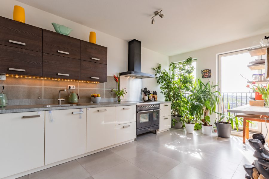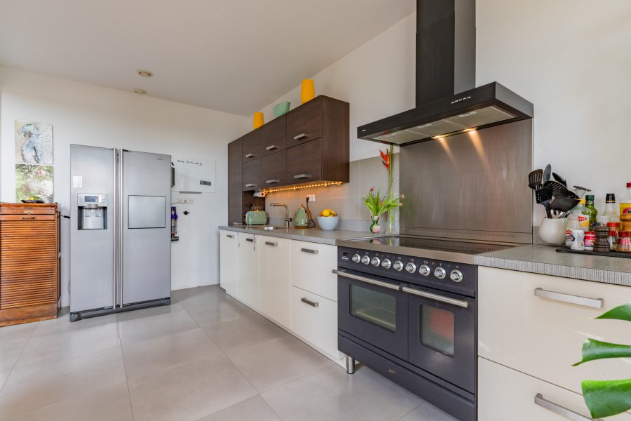 Aan het einde van de gang tref je de toegangsdeur tot de woonkamer met open keuken aan. De lichte, sfeervolle woonkamer ligt onder de plafondbalken en heeft een grote glazen schuifpui naar het inpandige dakterras met vrij uitzicht over de Zaanse omgeving. Het ruime terras biedt veel privacy. Voorin de woonkamer bevindt zich de zeer goed uitgeruste keuken met fraaie, moderne apparatuur, waaronder een inductiefornuis en een Amerikaanse koelkast. De keuken heeft drie raampartijen waarvan er een uitzicht biedt op het dakterras. Het plafond en de muren zijn keurig afgewerkt en op de vloer van het gehele appartement liggen tegels met eronder zowel vloerverwarming als vloerverkoeling. In de woonkamer bevindt zich een bergkast met de aansluitingen voor het witgoed.