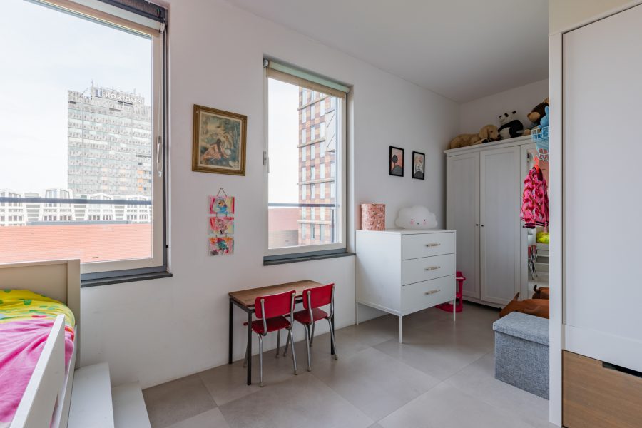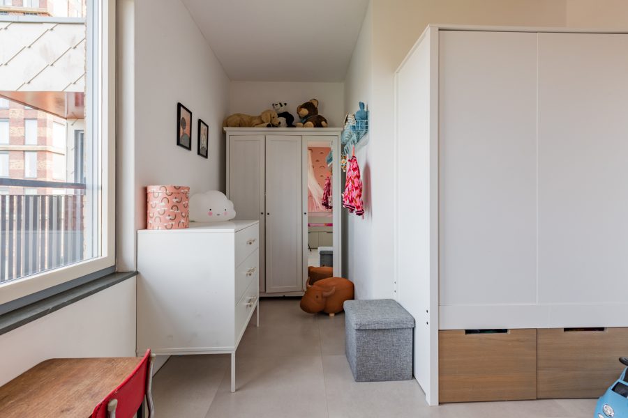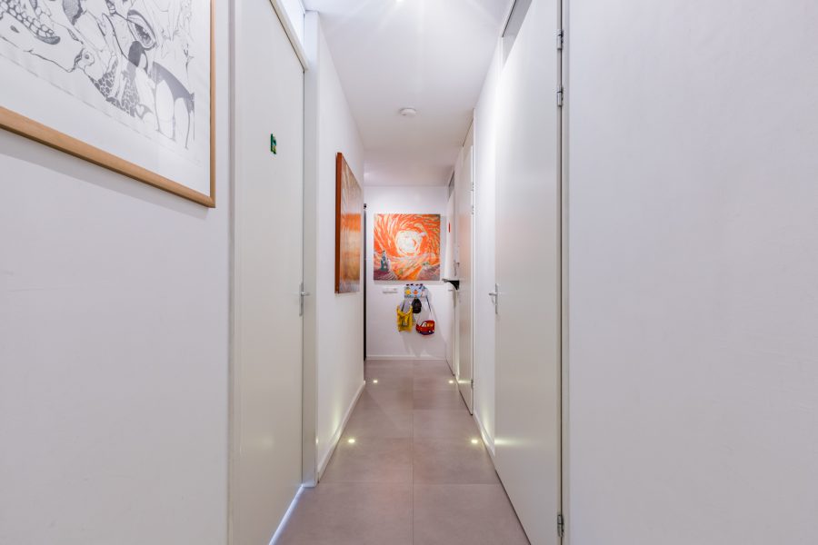 With the lift you reach the hall and the front door of the apartment. Entrance with directly on your left the floating toilet with hand basin, the meter closet and the bathroom. To your right you will find the two spacious bedrooms. The master bedroom has a hatch to the storage attic. The contemporary, bright bathroom has a washbasin with mirror, a shower cabin and a bathtub.