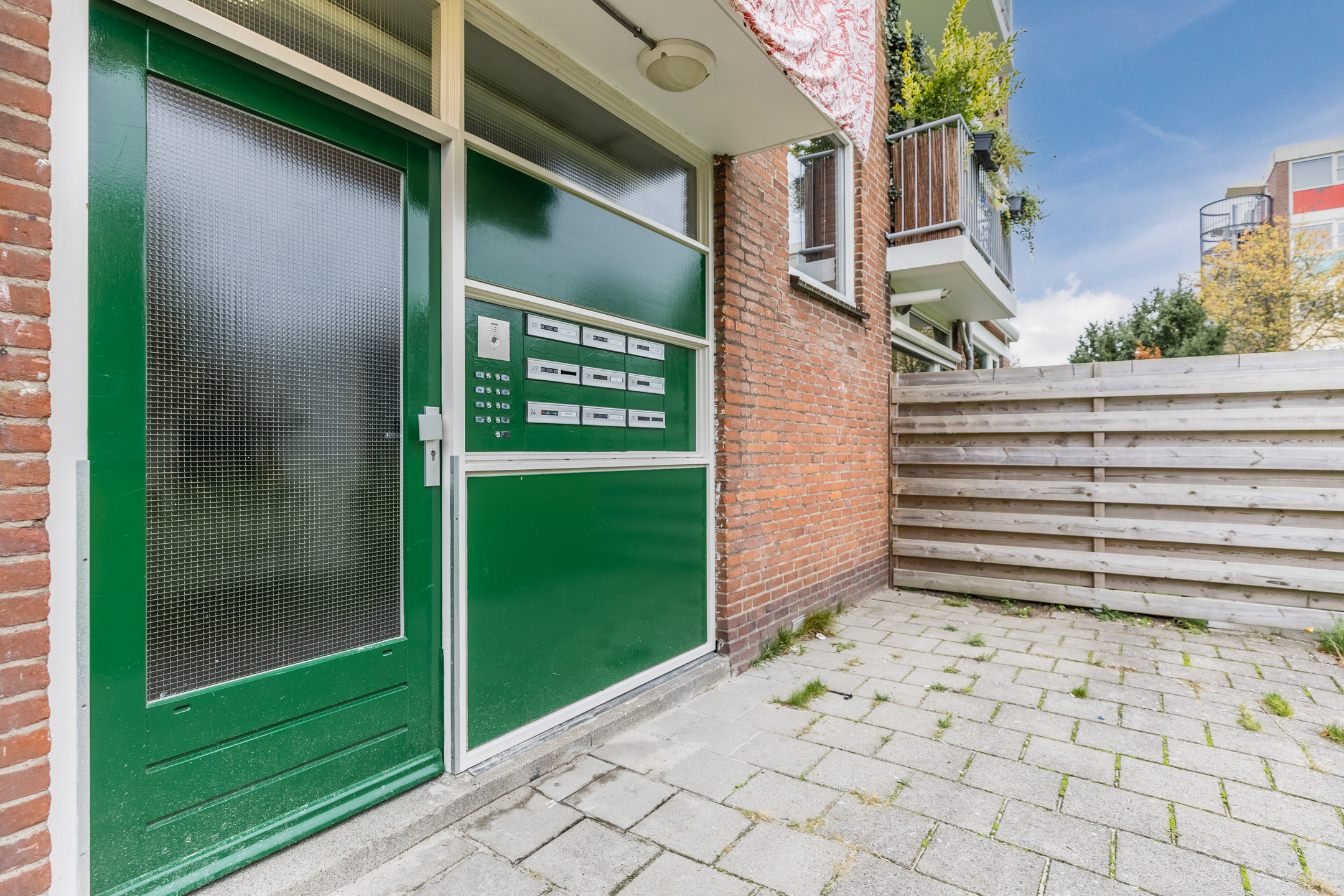 Gezamenlijk entree met brievenbussen en trappenhuis.