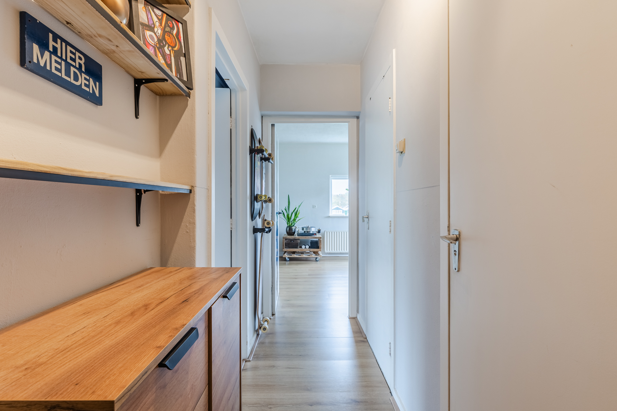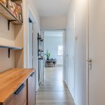 Het appartement ligt op de bovenste verdieping van een kleinschalig complex. Achter de voordeur bevindt zich een langwerpige entreehal, die toegang biedt tot meerdere vertrekken.