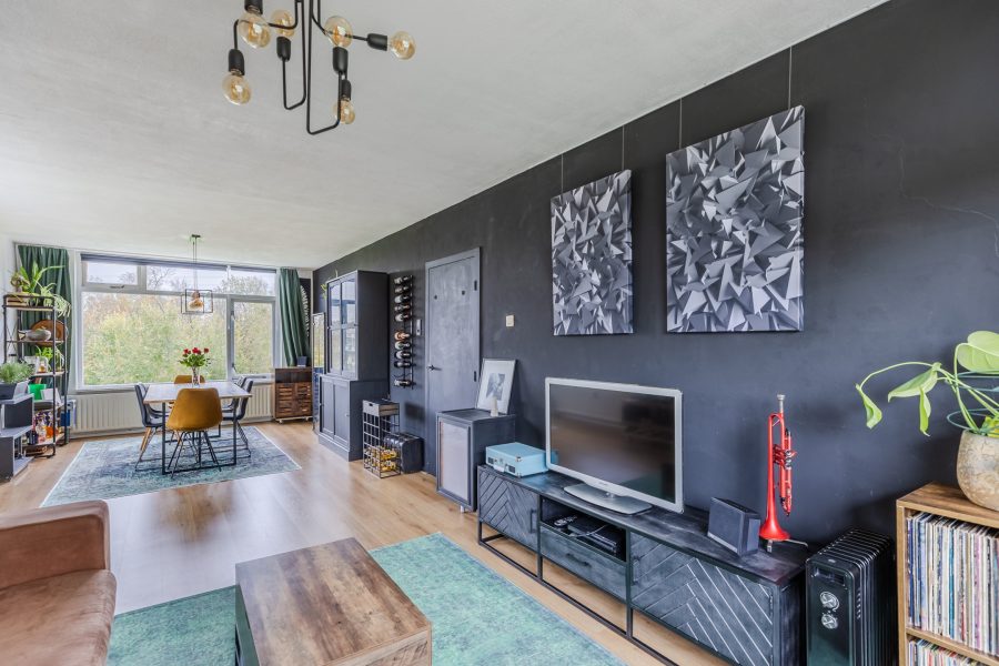 De royale woonkamer vormt het hart van het appartement. In deze ruimte ligt een nette vloer en zijn de wanden afgewerkt in zwart en wit. Dankzij de grote ramen valt er veel natuurlijk licht binnen. Vanaf hier stap je zo het zonnige balkon op. Hier is ruimte voor klein meubilair, om zo optimaal van de buitenlucht te genieten.
