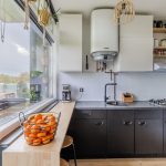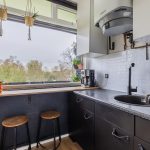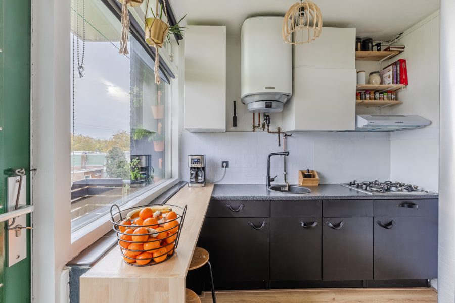 Via de woonkamer loop je ook zo de keuken binnen. De keuken is verouderd en beschikt over zwarte onderkasten, een donker werkblad en een witte achterwand. Hier tref je een gasfornuis en een afzuigkap aan. Ook de wasmachine-aansluiting is hier te vinden. De keukenruimte heeft een openslaande deur naar het andere balkon. Op dit balkon is het heerlijk toeven en geniet je van fraai uitzicht over de groene omgeving.
