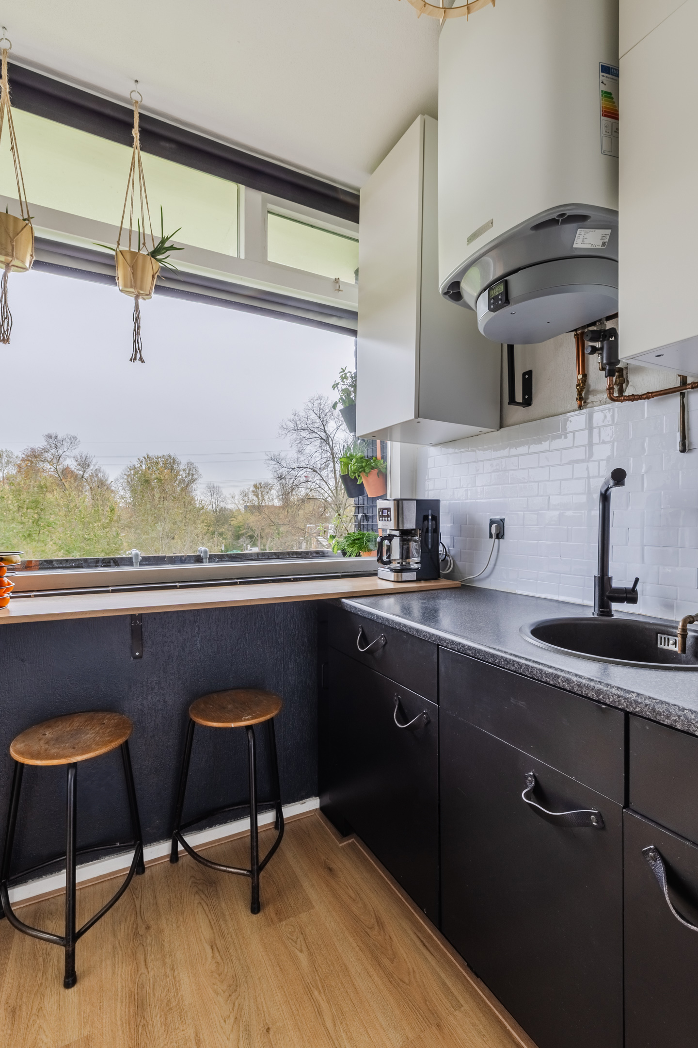 Through the living room you can reach the kitchen. This kitchen is outdated and has black base cabinets, a dark countertop and a white backsplash. Here you will find a gas stove and an extractor hood. The washing machine connection is also located here. The kitchen area has a door to the other balcony. This balcony is a wonderful place to relax and enjoy the beautiful view of the green surroundings.