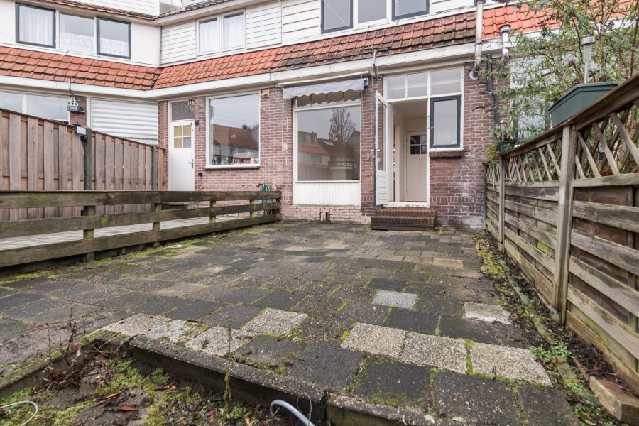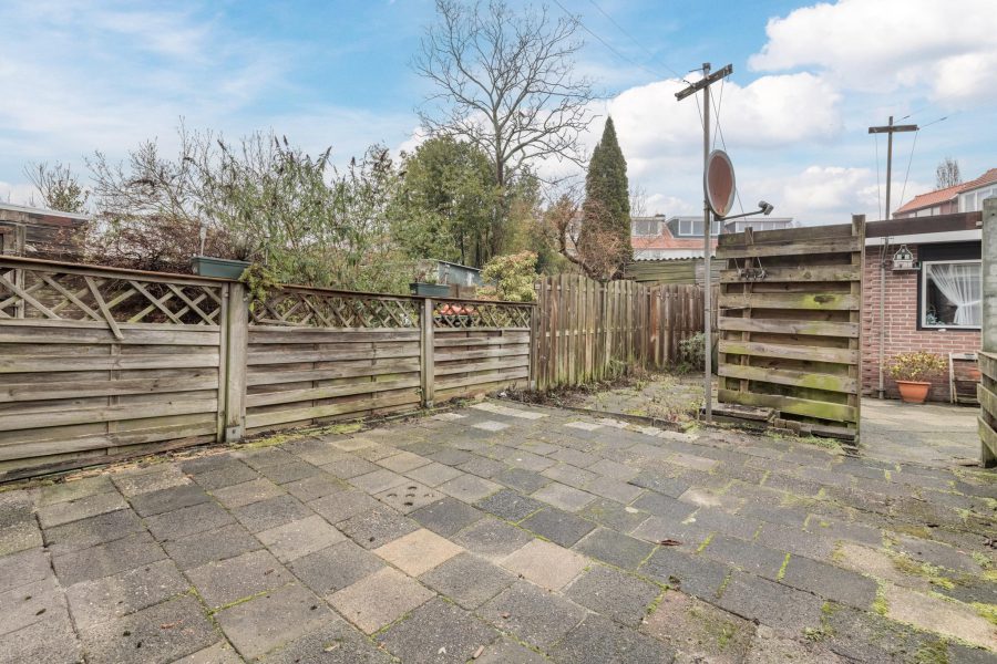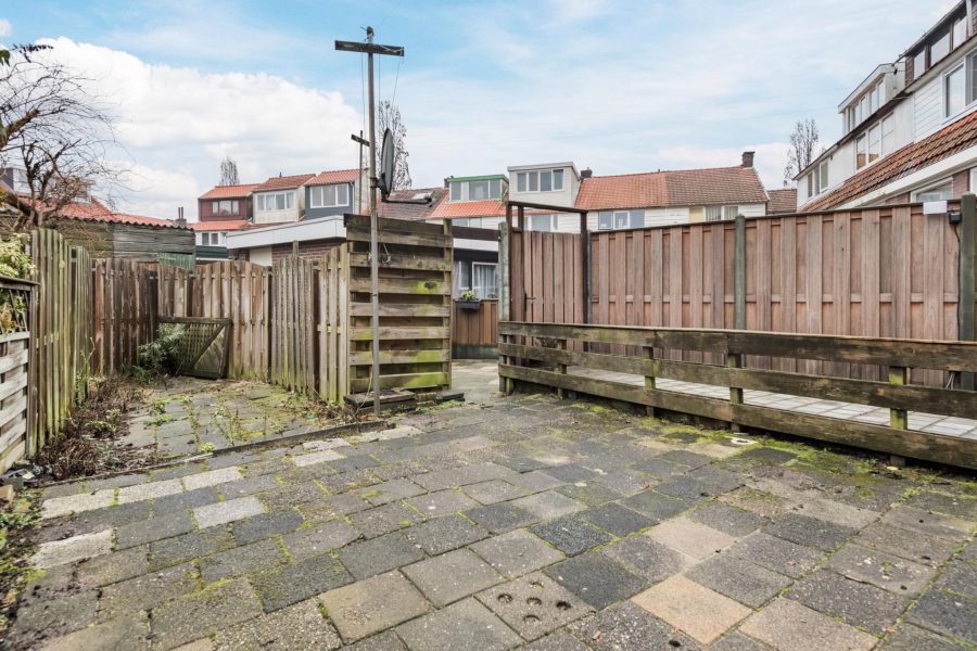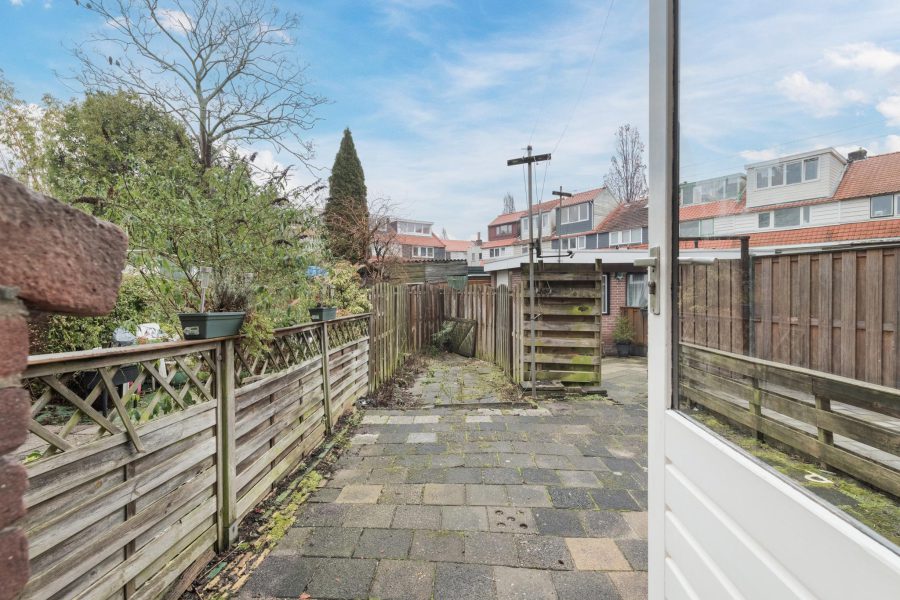 De woning heeft een diepe betegelde tuin met een houten berging. De tuin moet worden opgeknapt, maar biedt voldoende ruimte om in de toekomst een fijne loungeplek te realiseren. Er is een achterom.