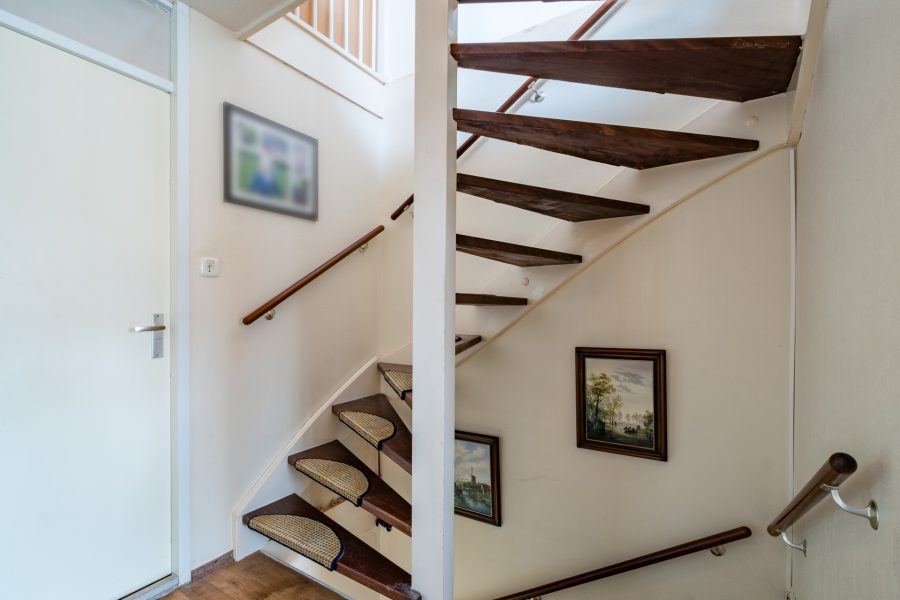 Via de betegelde voortuin bereiken we de overkapte voordeur. Entree met garderobe en meterkast, bergkast met de cv-installatie, staand toilet met fonteintje, trapopgang naar de eerste verdieping en toegang tot de woonkamer met open keuken. De lichte, ruime woonkamer heeft aan de achterzijde een raampartij en een openslaande deur naar de tuin. Aan de voorzijde is de rechte keuken gesitueerd. Deze heeft lichte fronten en is voorzien van diverse inbouwapparatuur. De keuken is groot genoeg voor het plaatsen van een vierpersoons eettafel. Op de vloer ligt vinyl en de muren en plafonds zijn strak afgewerkt. In de woonkamer is een trapkast te vinden.