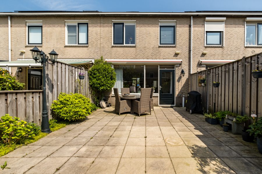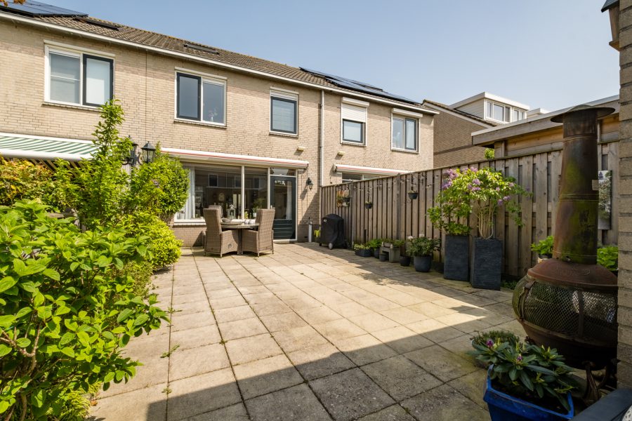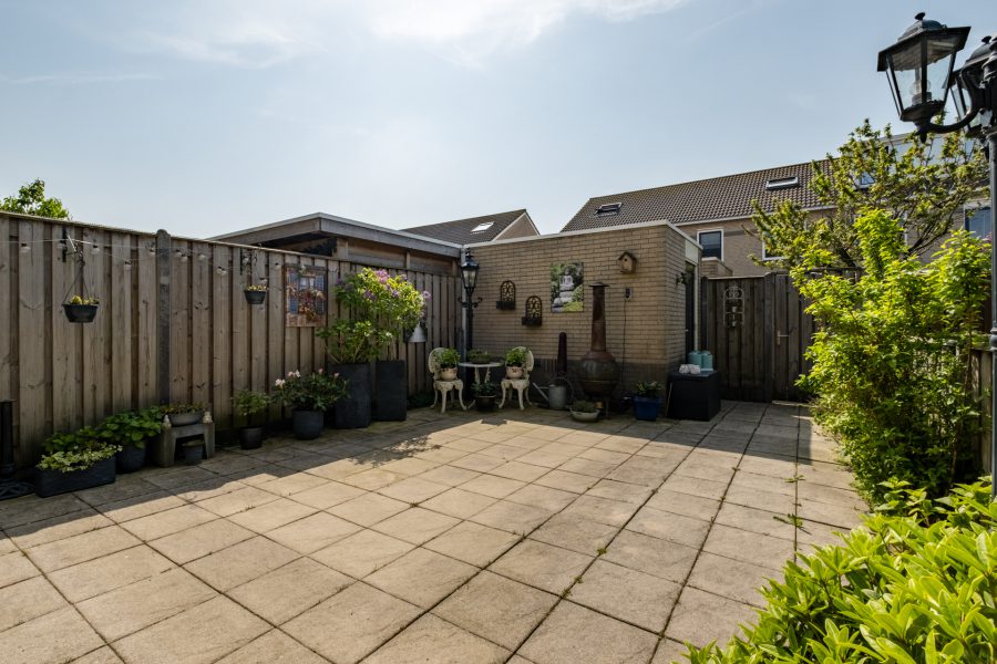 De woning heeft een betegelde voortuin en een betegelde, beschutte achtertuin met groene accenten en een stenen (fietsen)berging met elektra. De tuin is groot genoeg om er een fijne loungeplek te realiseren en een eettafel buiten te plaatsen en vanzelfsprekend kunnen kinderen hier heerlijk en veilig spelen. Er is een achterom.