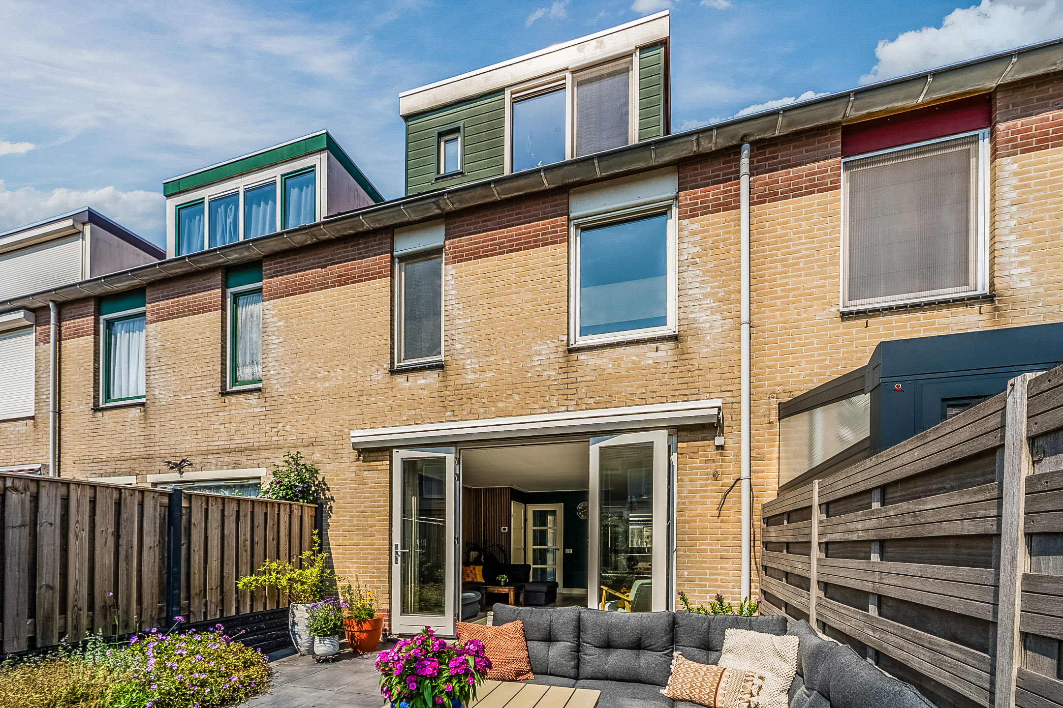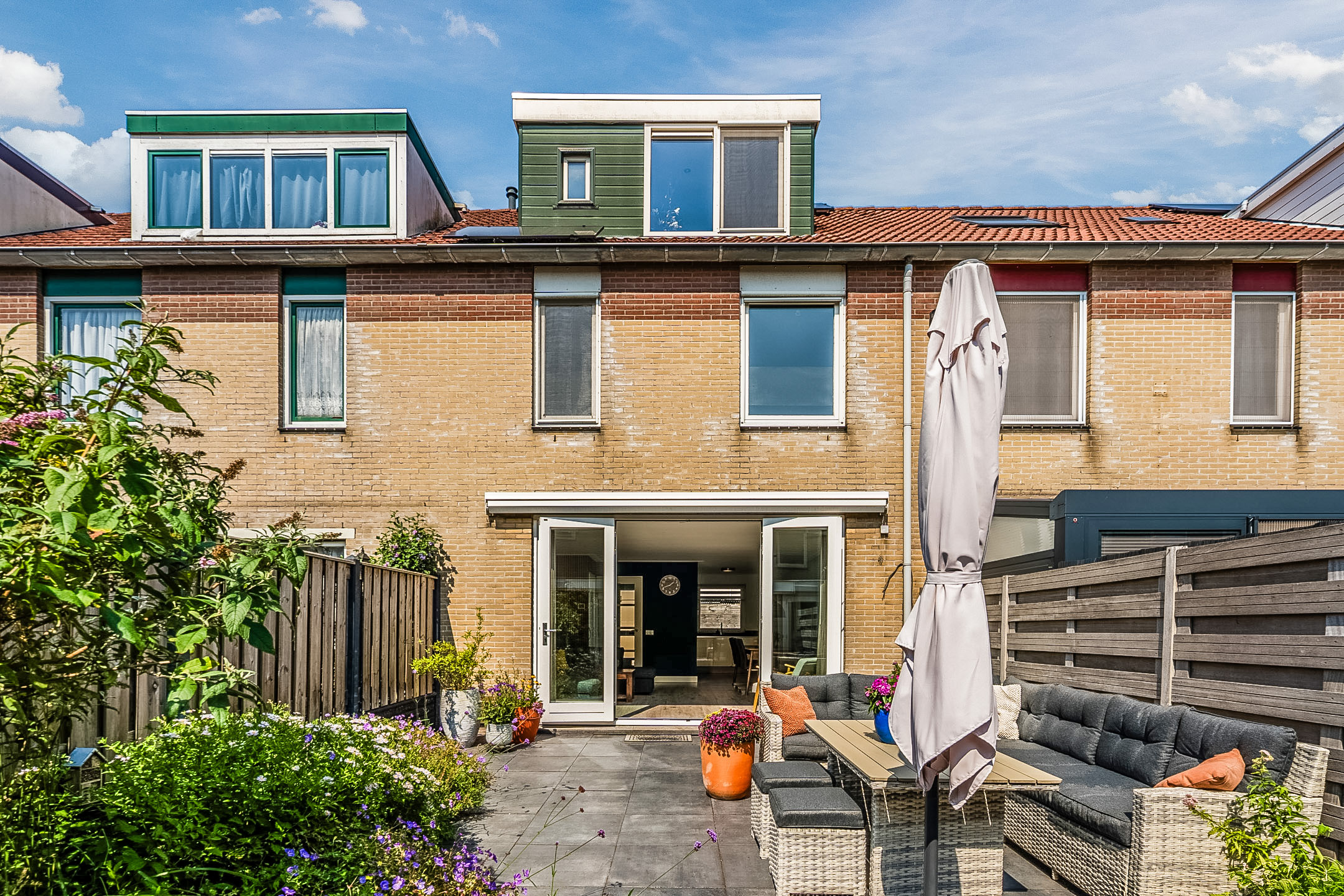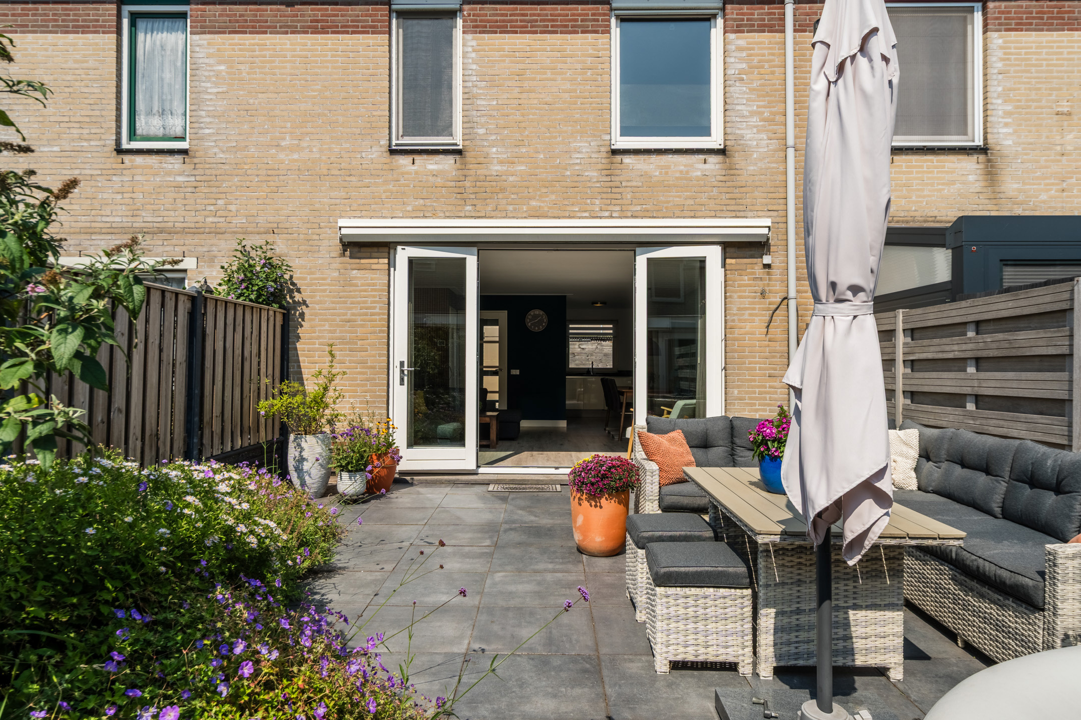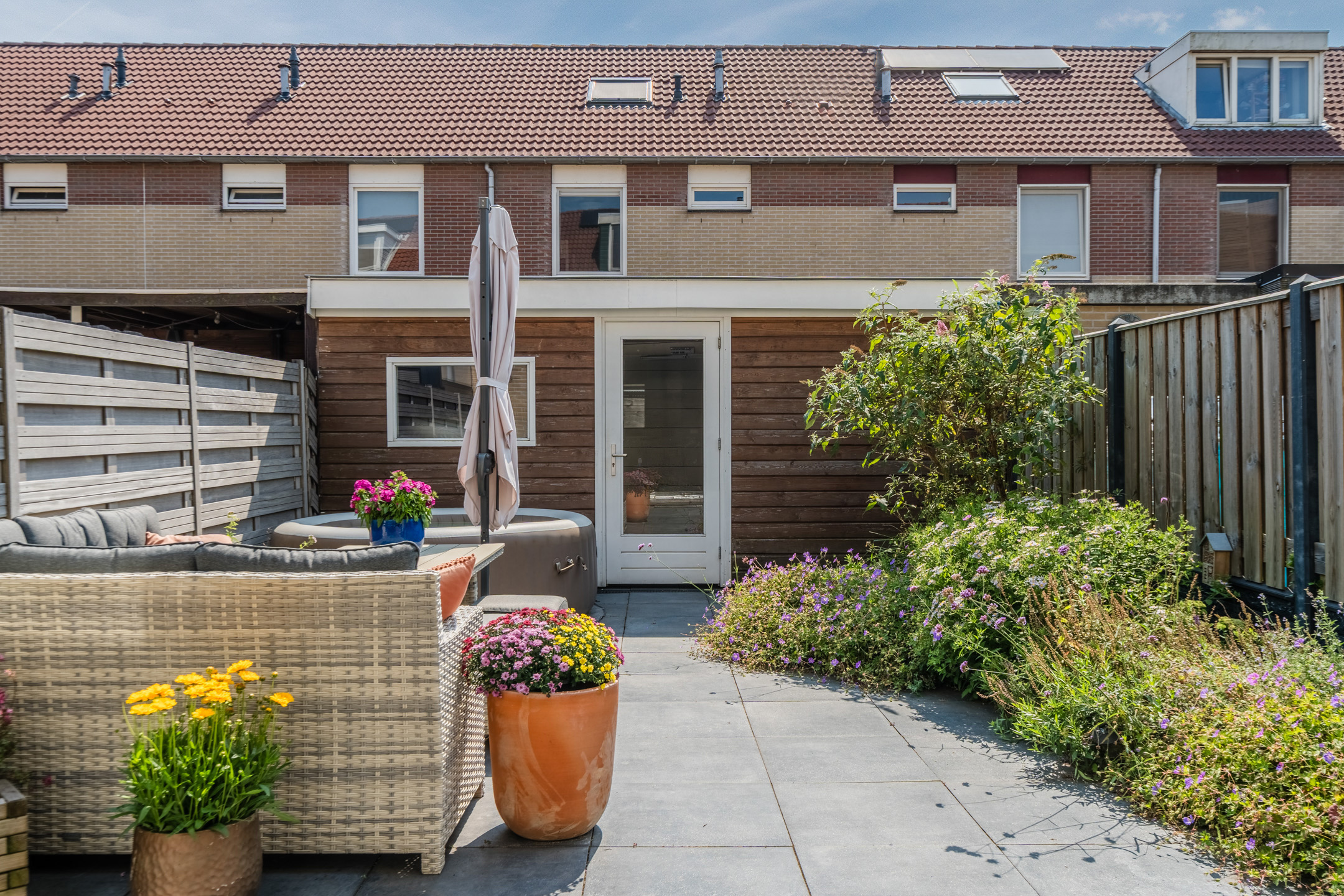 Het huis beschikt over een fraai aangelegde en zonnige achtertuin. De tuin is sfeervol ingericht met zowel tegels als groen. Dankzij de ligging op het zuiden geniet je hier de hele dag van de zon. De houten schuttingen zorgen voor veel privacy, waardoor je in alle rust van het lekkere weer kunt genieten. Door de buitenzonwering is het ook mogelijk om schaduwplekken te creëren.